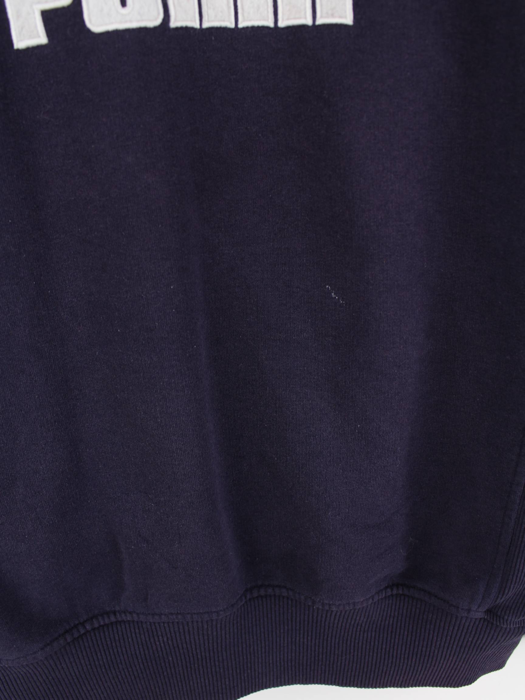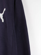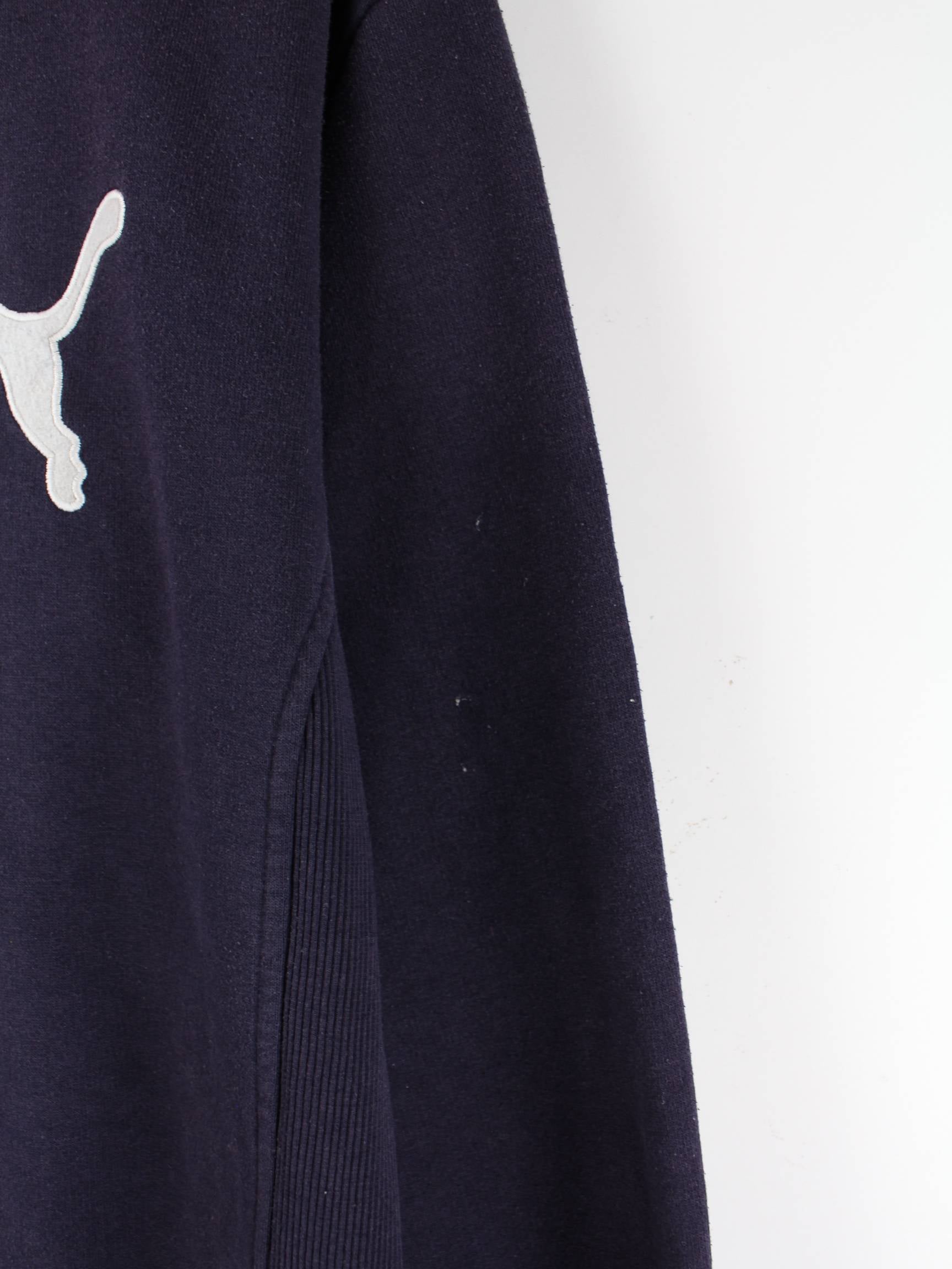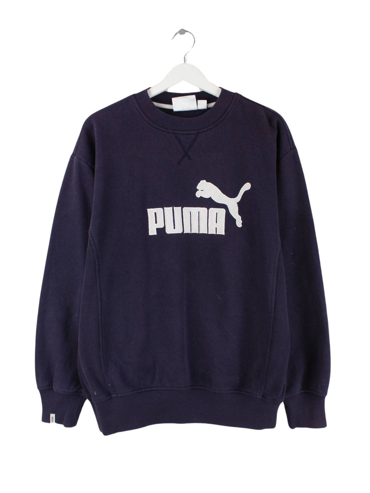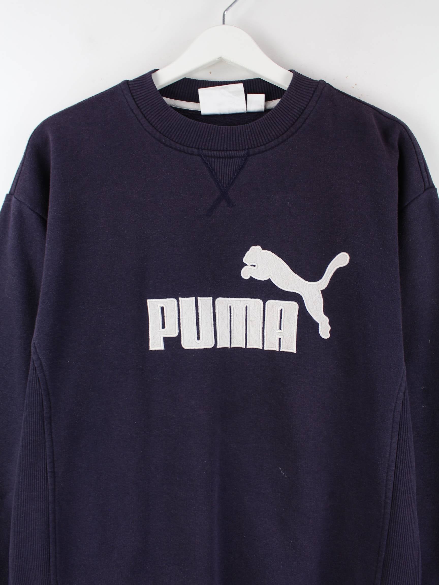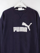 Blauer Sweater mit gesticktem Logo der Brand Puma in Größe L. Er ist aus einer Baumwollmischung und in gutem Zustand bei uns zu bekommen.