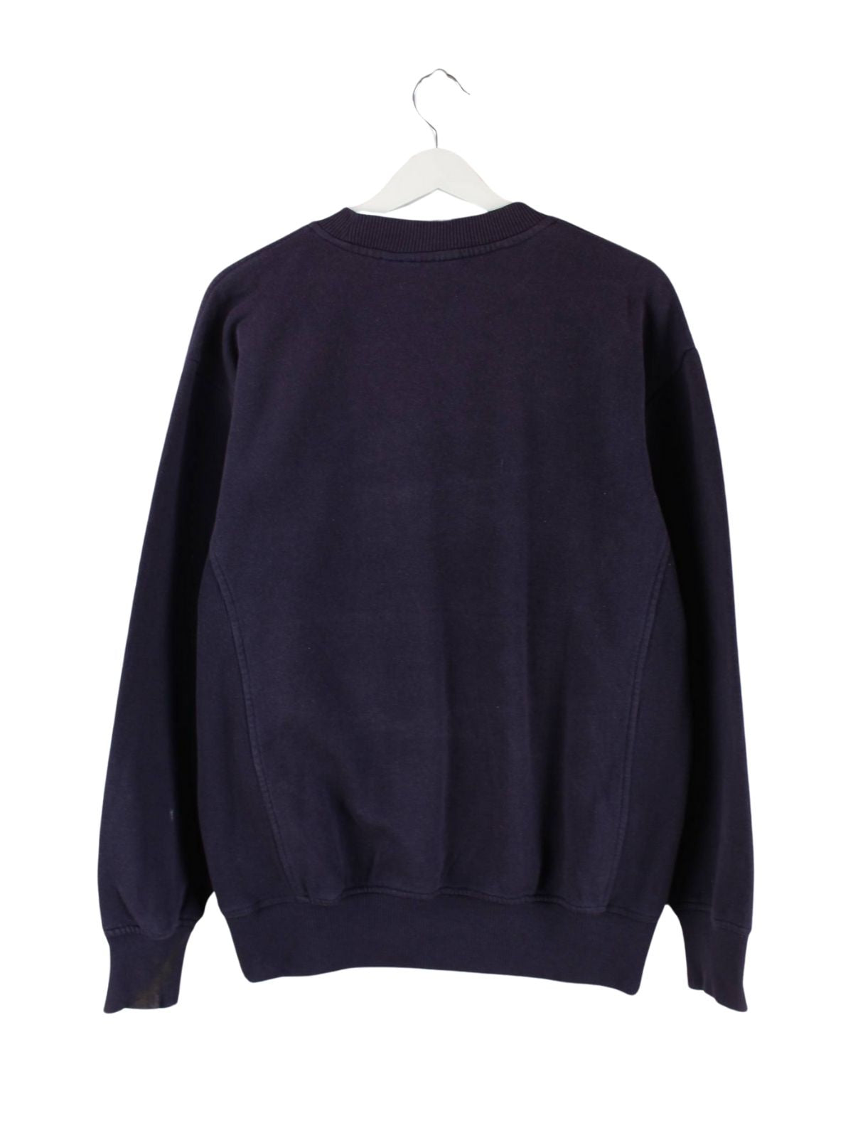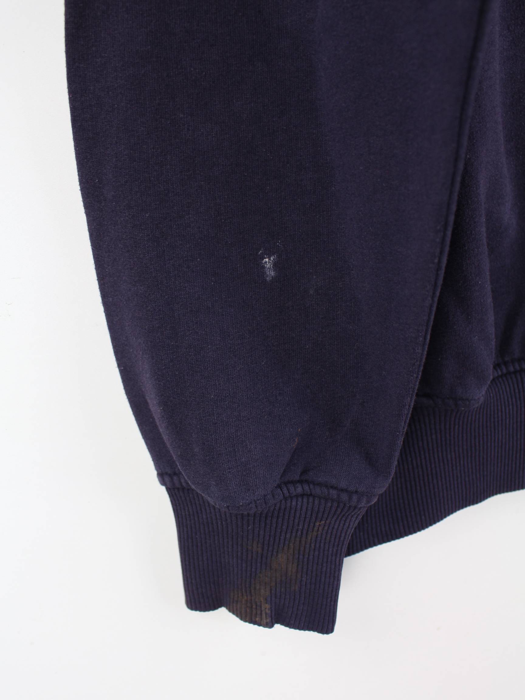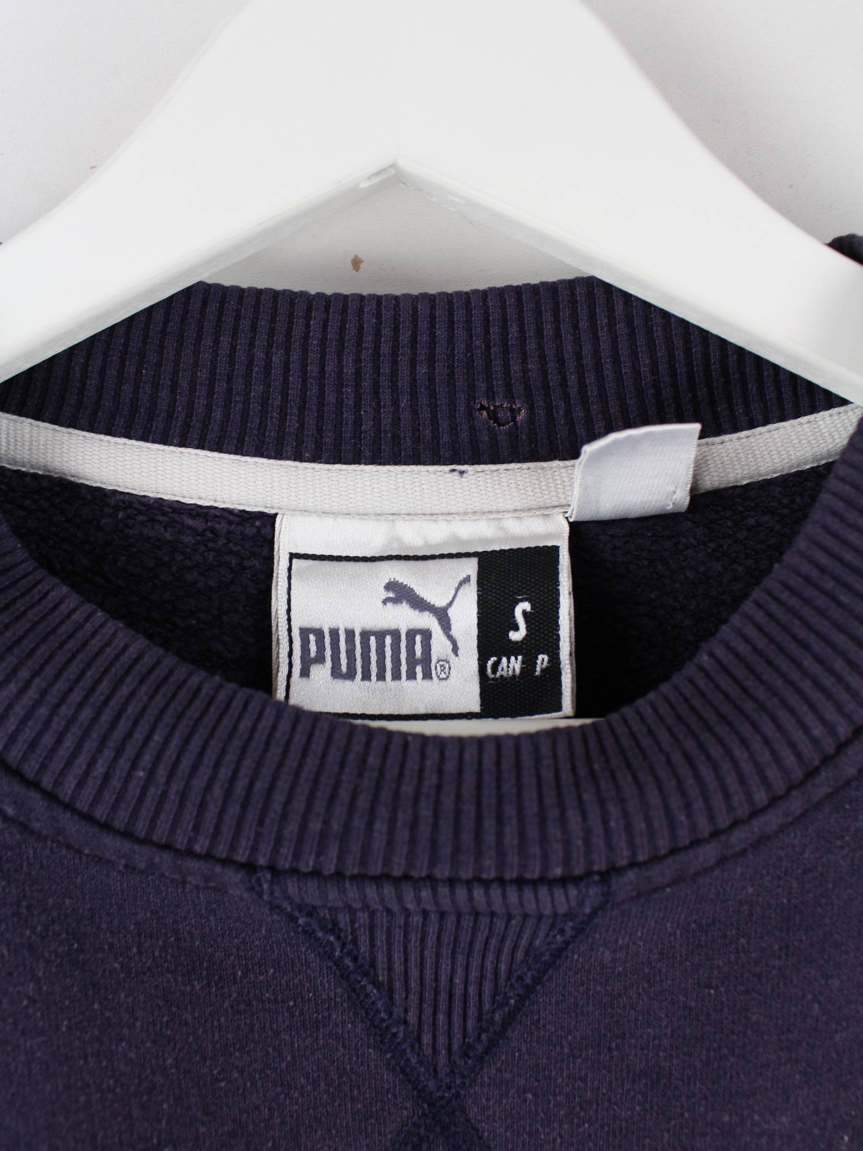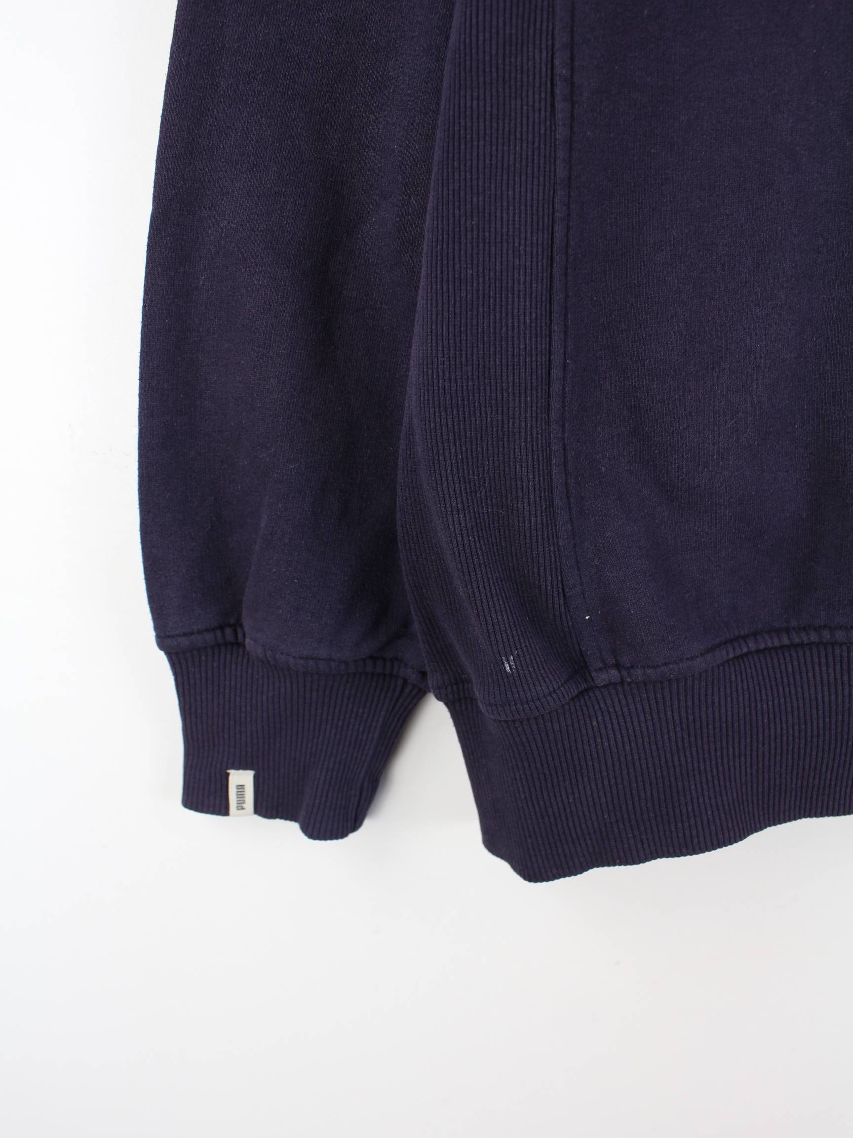 Blauer Sweater mit gesticktem Logo der Brand Puma in Größe L. Er ist aus einer Baumwollmischung und in gutem Zustand bei uns zu bekommen.