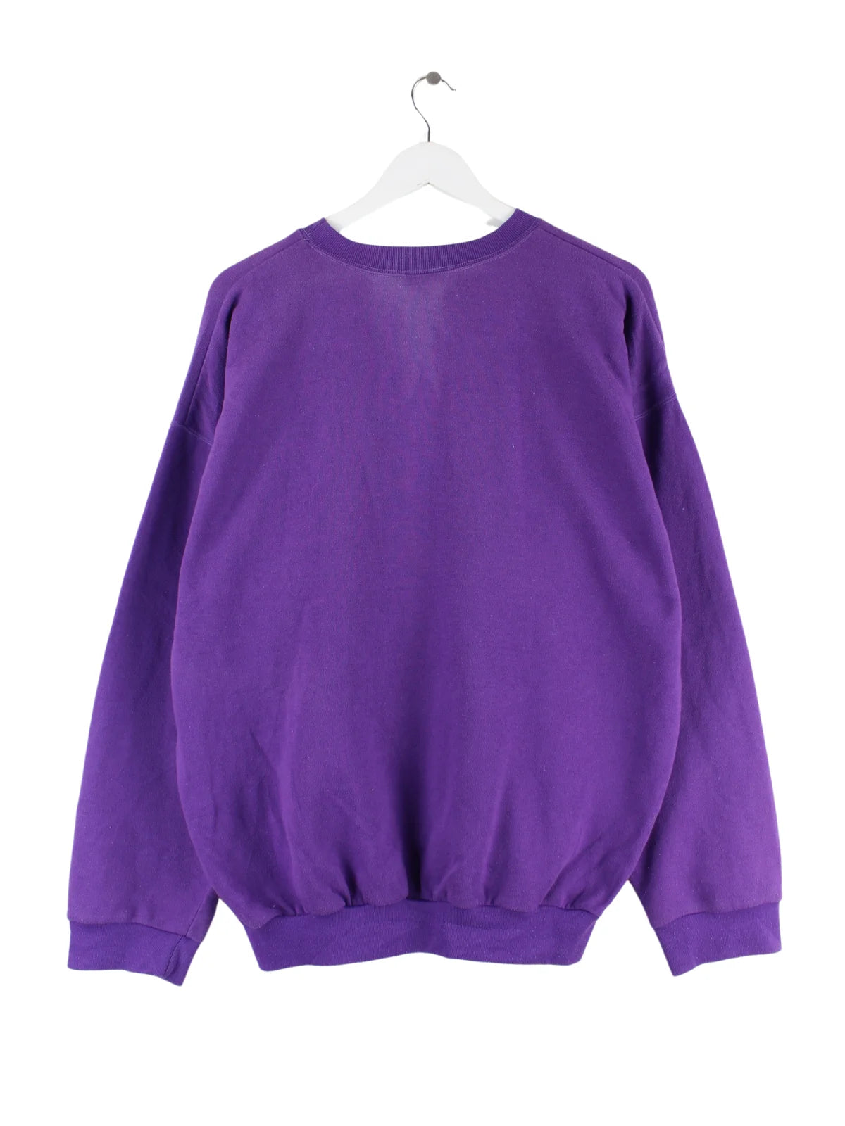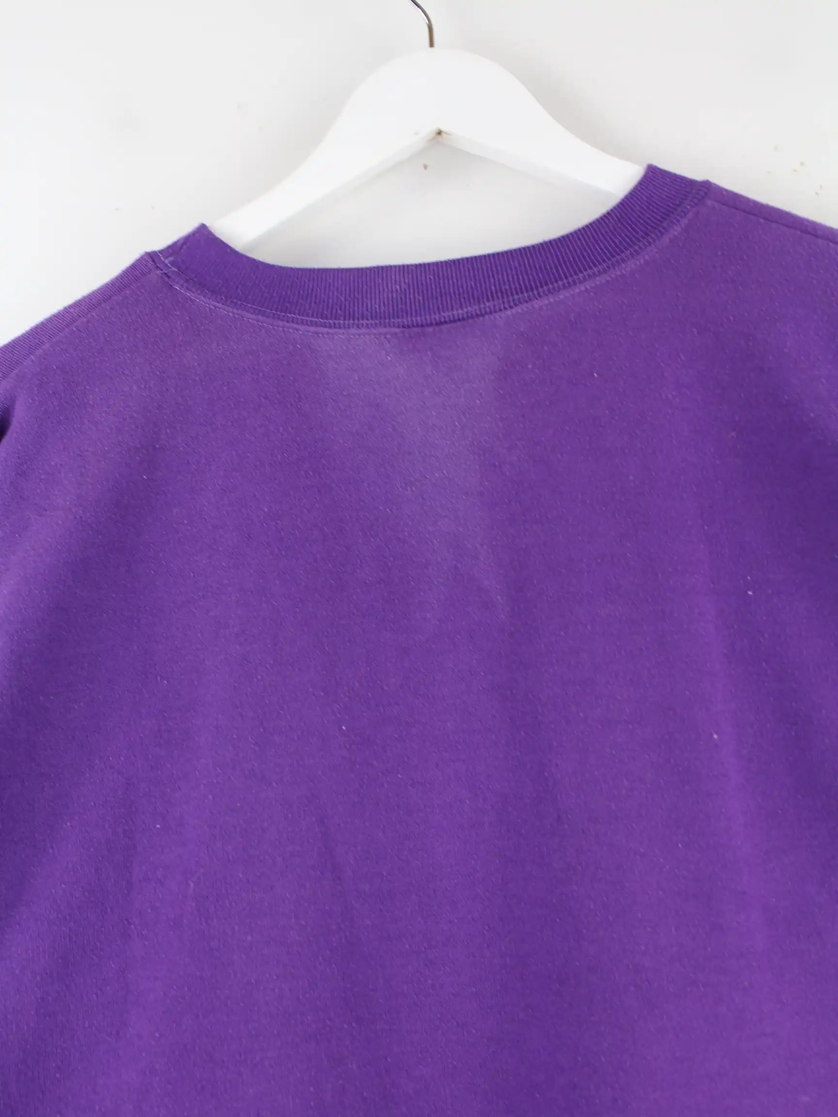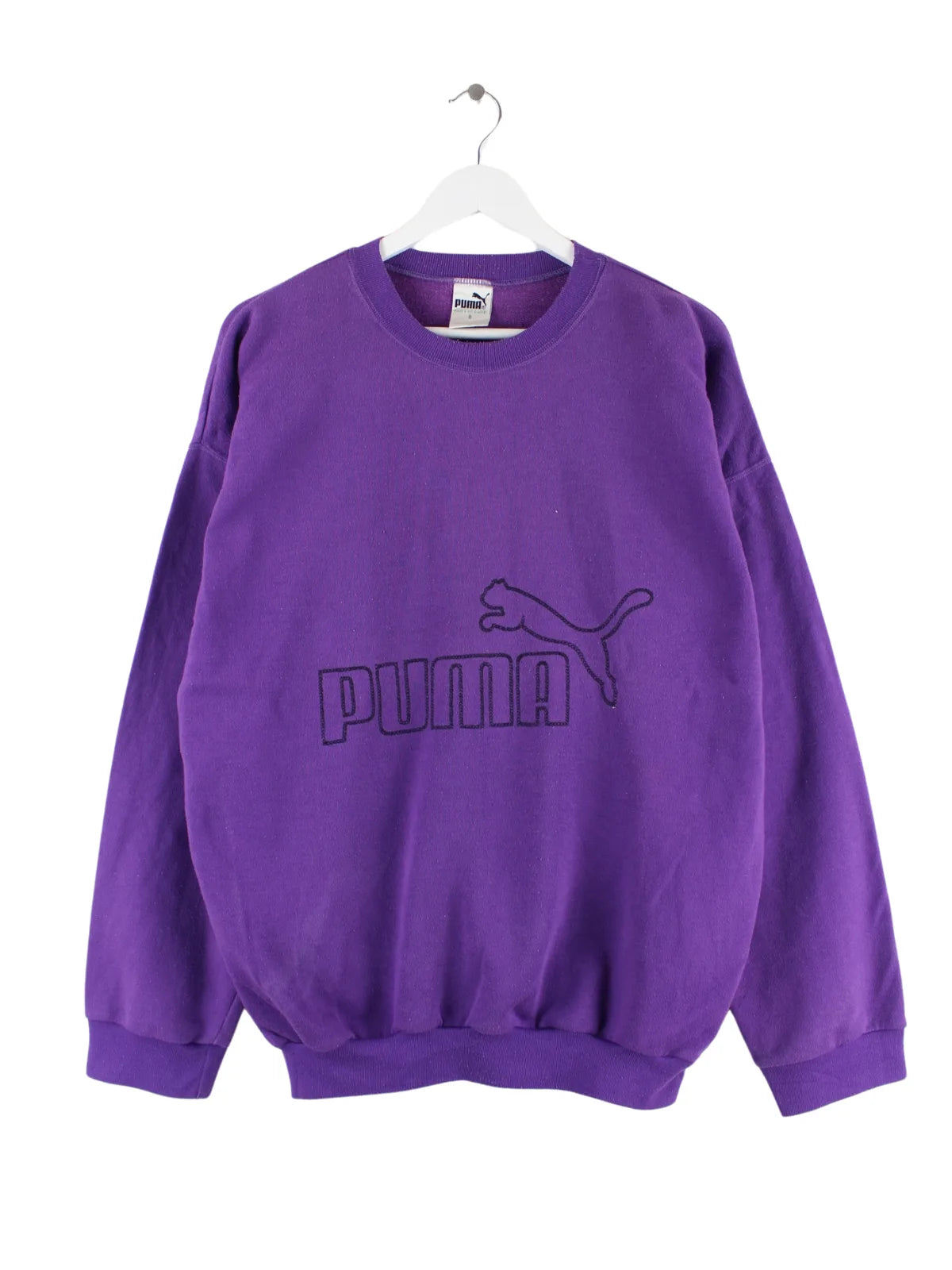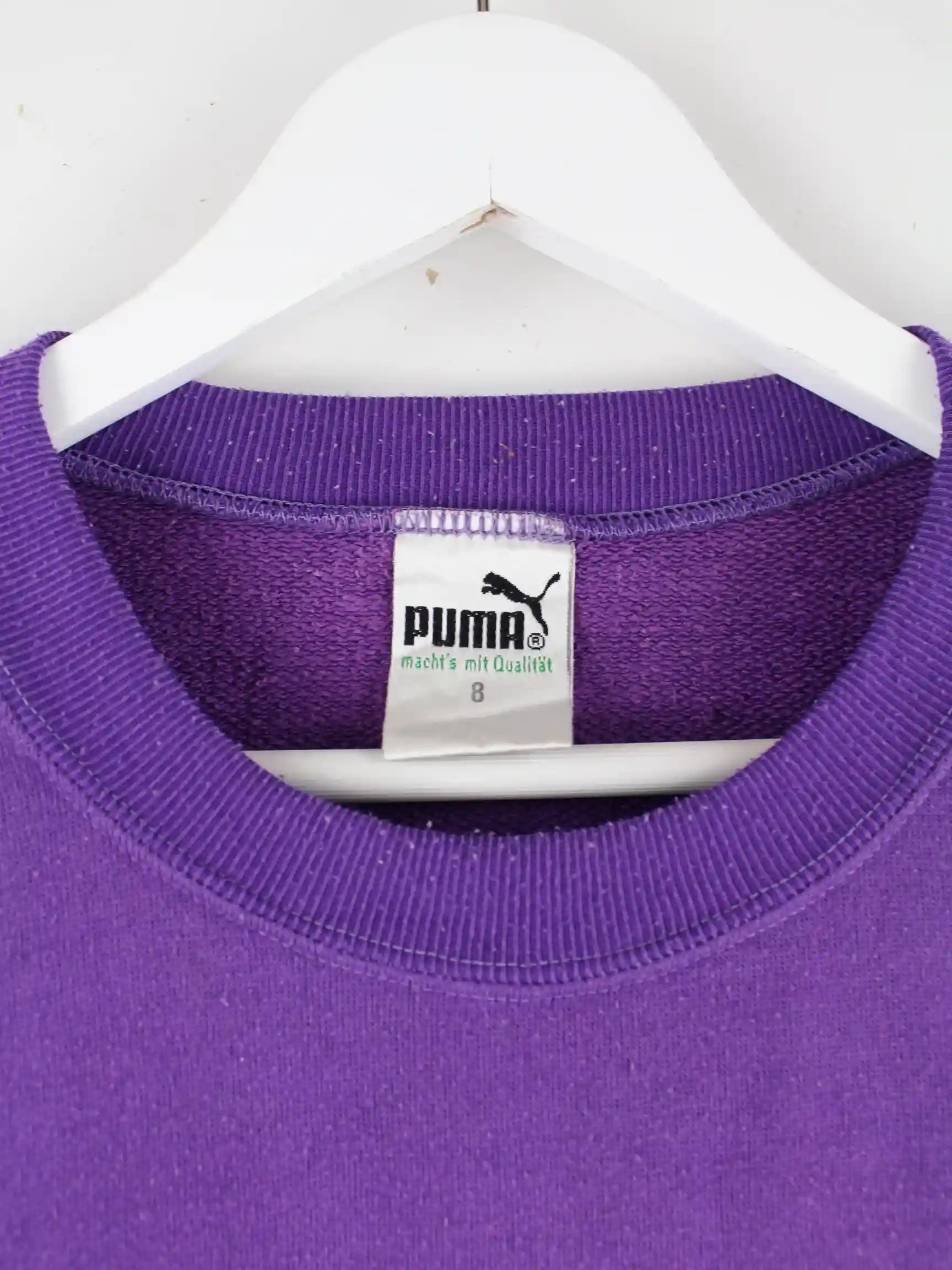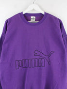 Lilafarbener Sweater vom Label Puma aus den 90'ern in Größe XL. Er ist aus einer Baumwollmischung produziert und in gutem Zustand vorrätig. Mit chiquem Vintage Print.