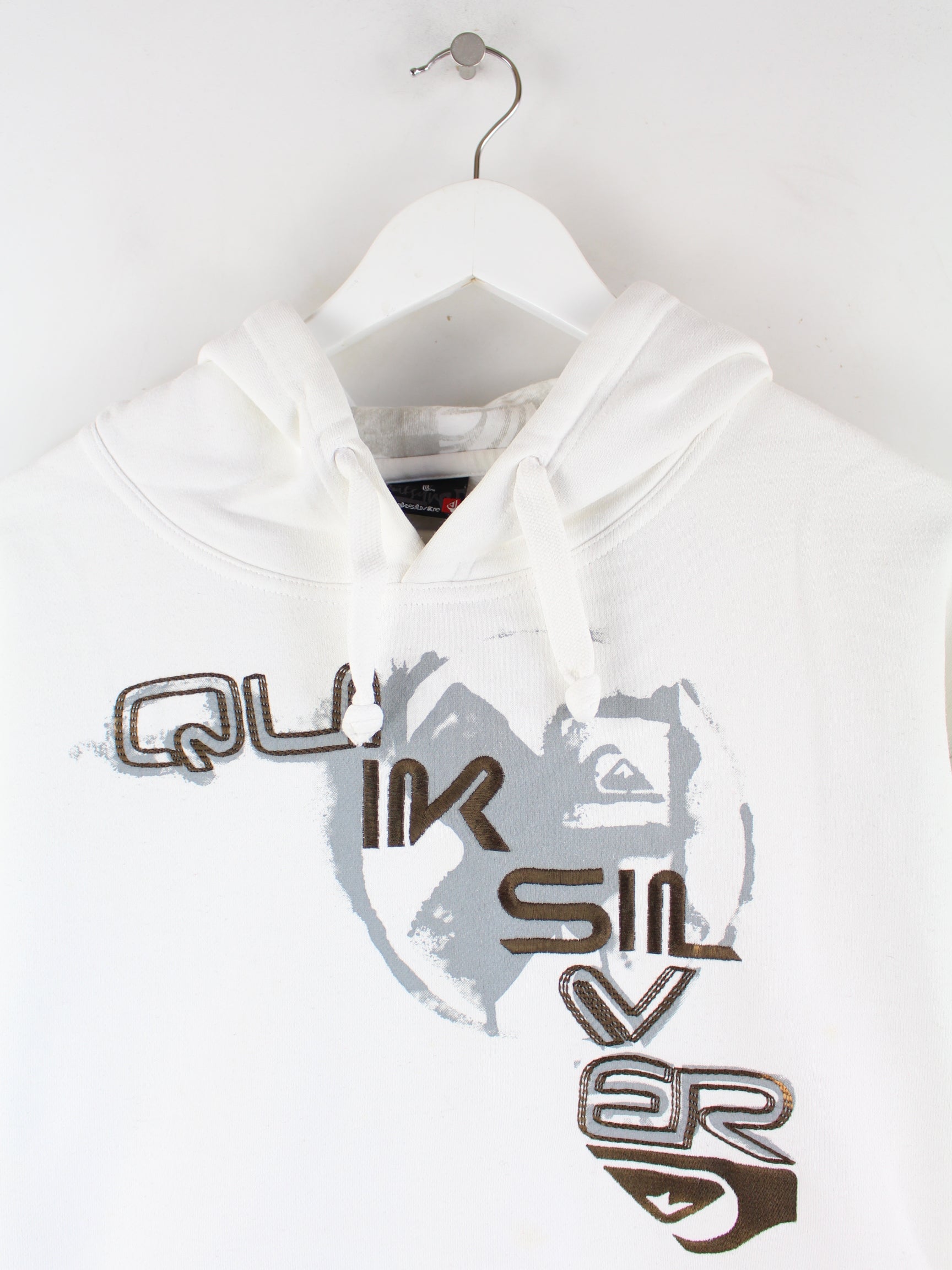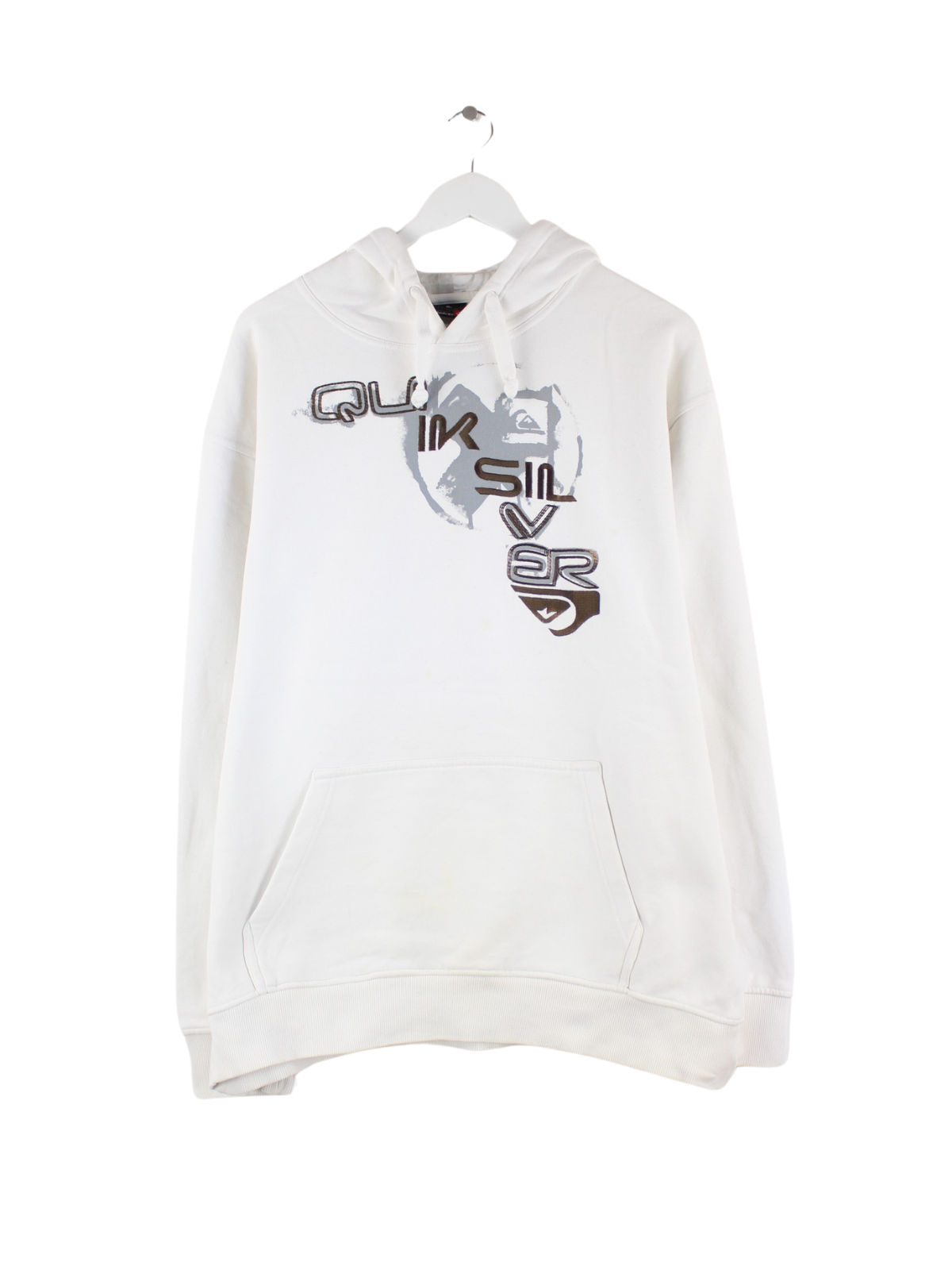 Hoodie des Labels Quiksilver in Größe L aus den 90'ern. Er ist aus einer Baumwollmischung gemacht und in Weiß vorrätig.