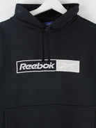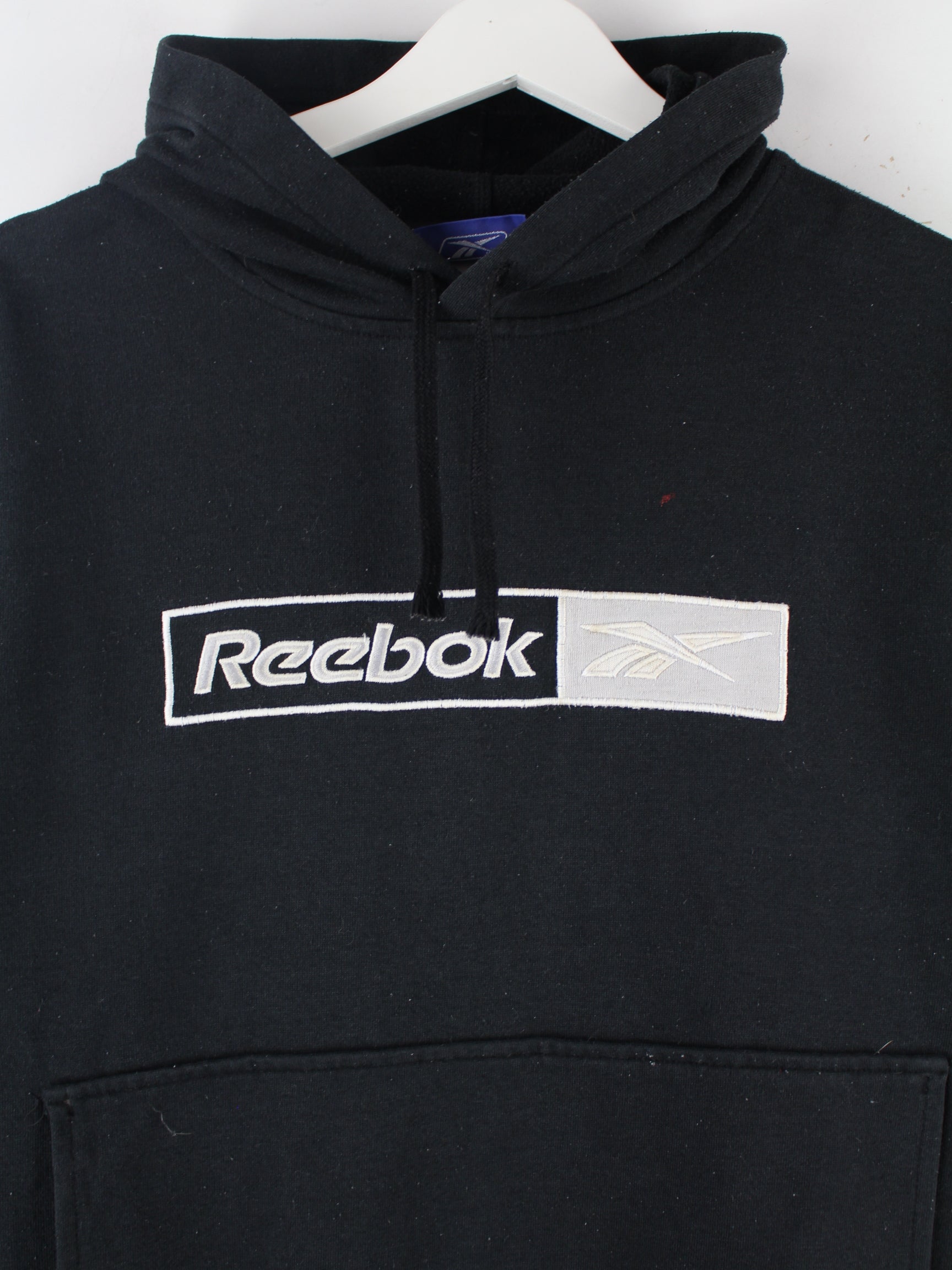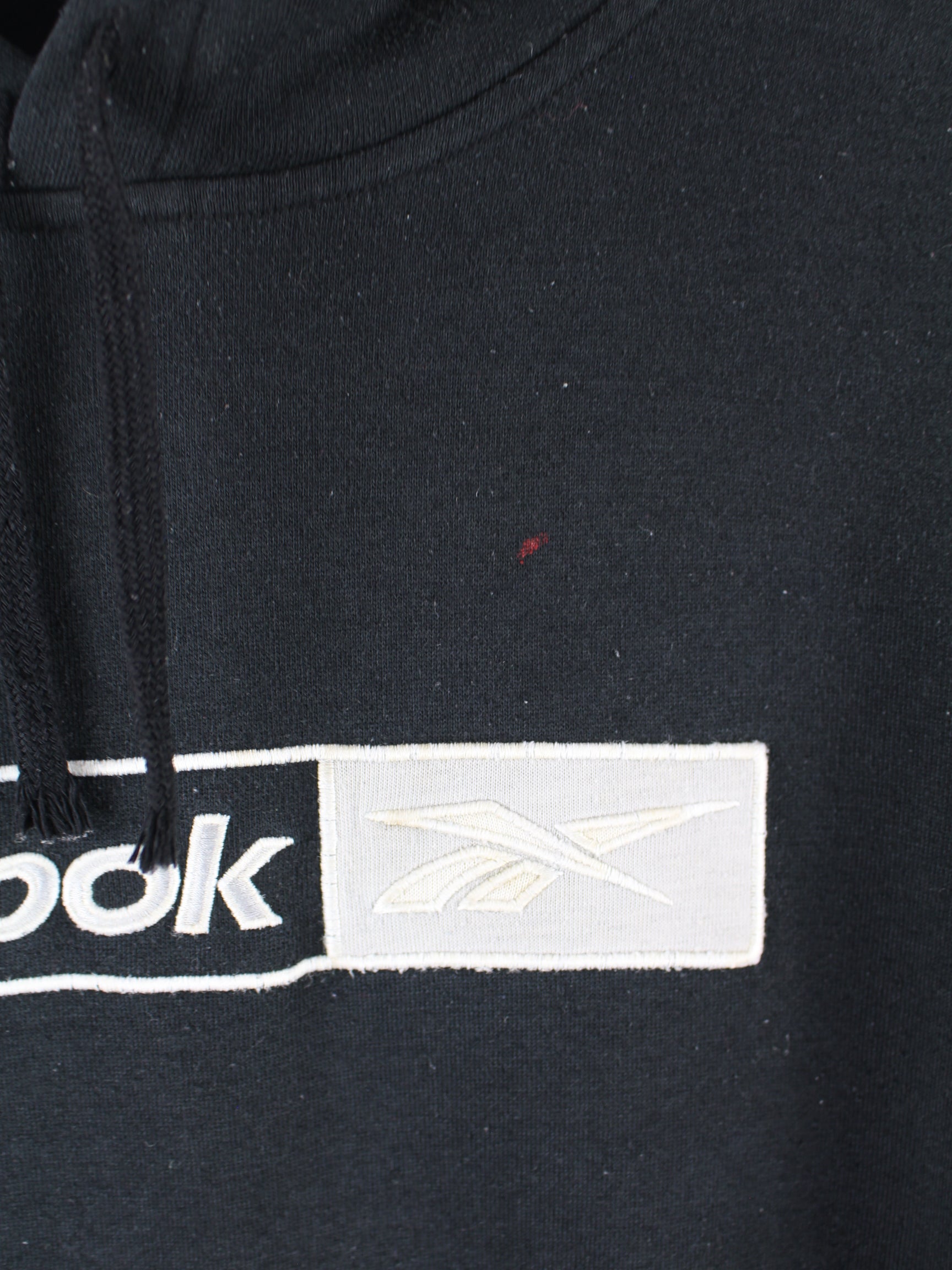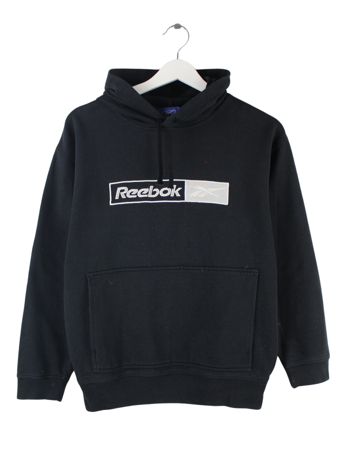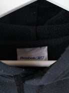 Schwarzer Hoodie mit gesticktem Logo der Brand Reebok in Größe XS. Er ist aus einer Baumwollmischung angefertigt und in gutem Zustand im Bestand.