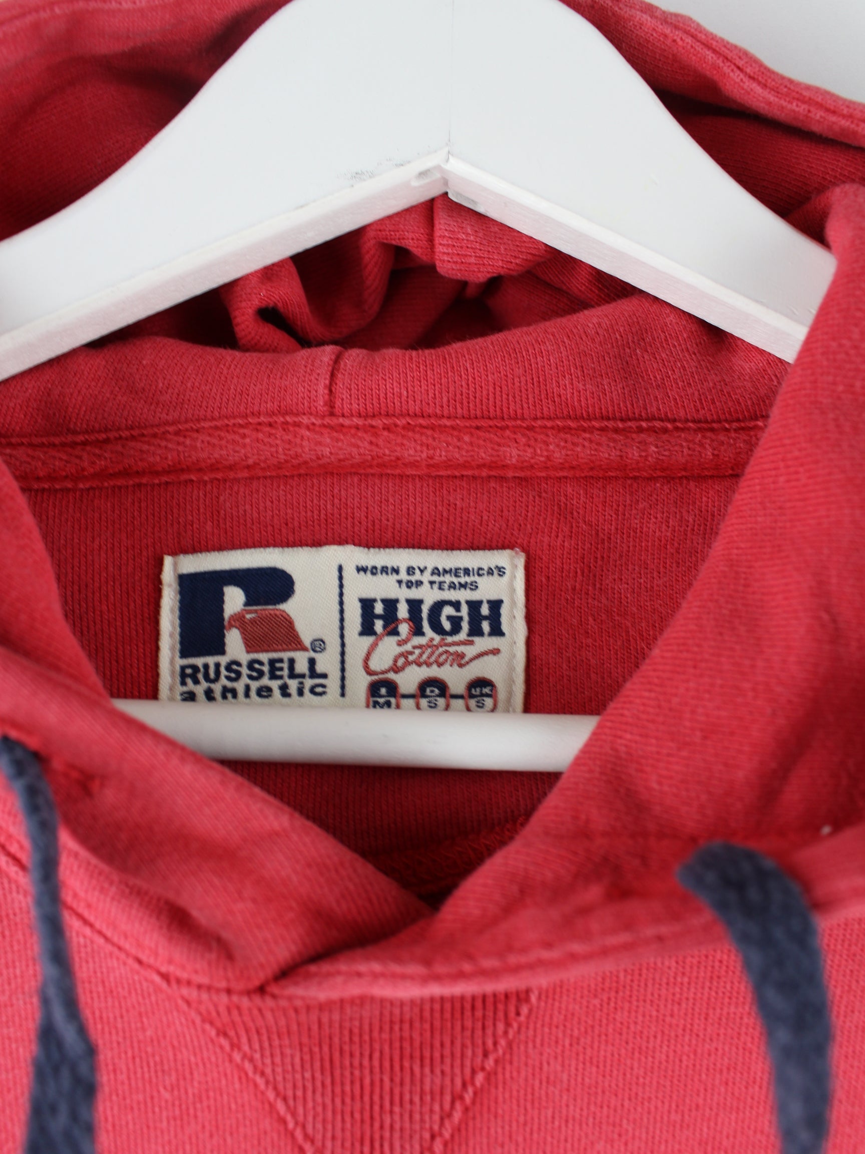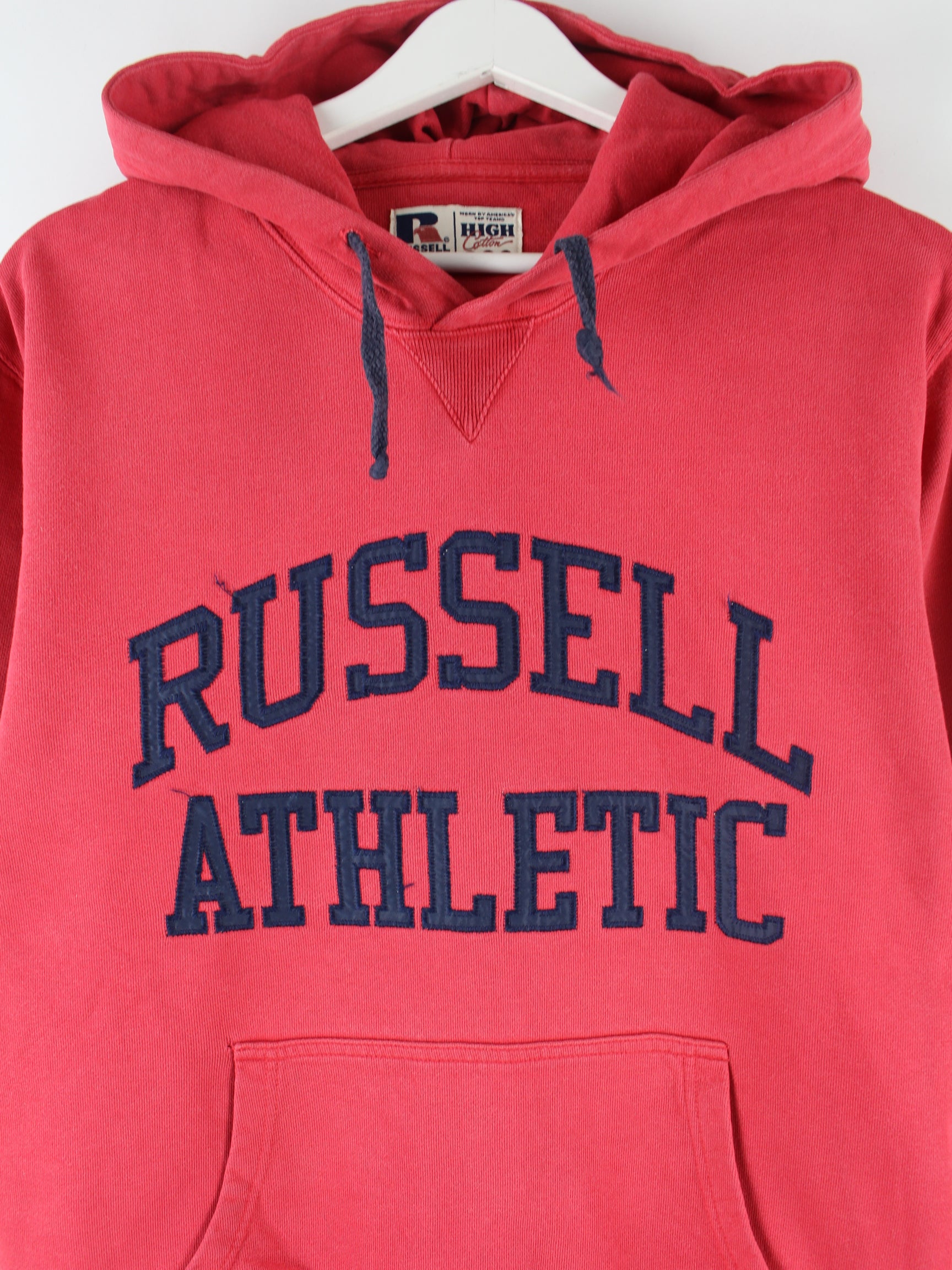 Roter Hoodie mit gestickten Motiven vom Label Russell Athletic in Größe M. Er ist aus einer Baumwollmischung angefertigt und in gutem Zustand zu haben.