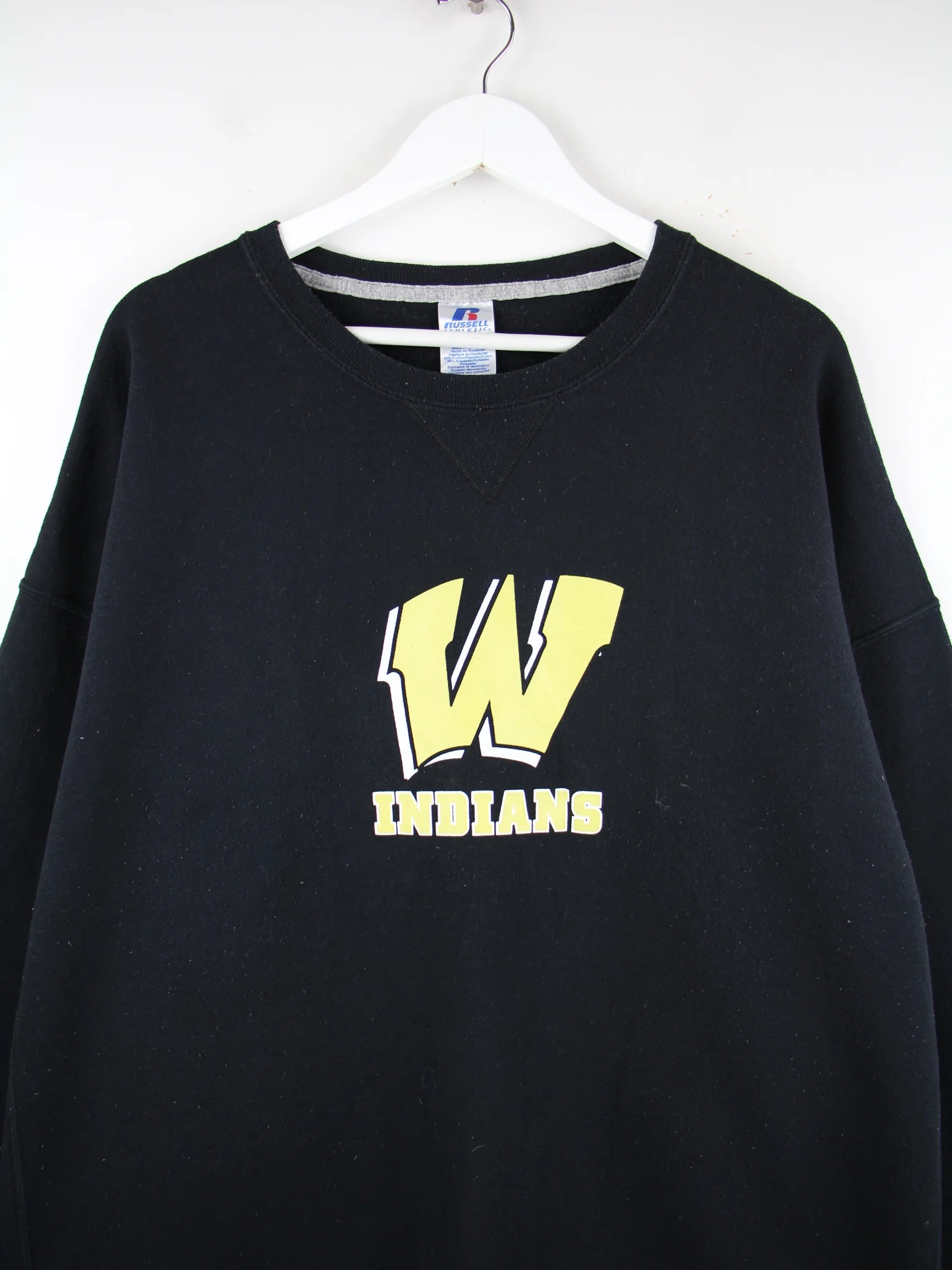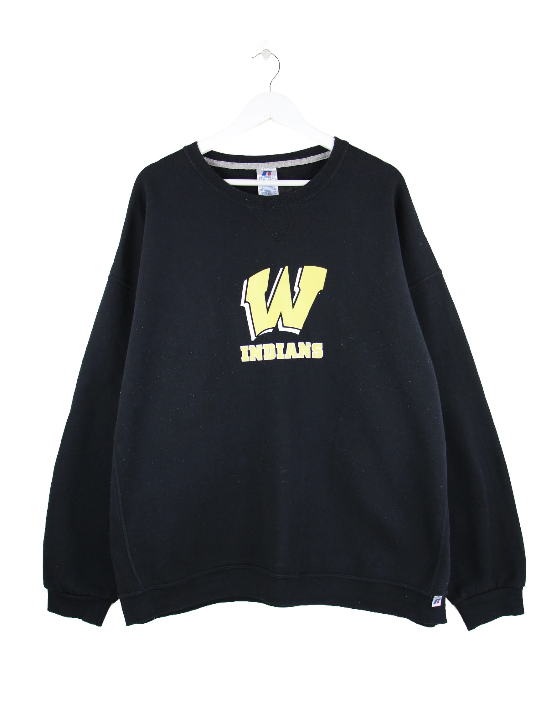 Schwarzer Sweater der Marke Russell Athletic in Größe 3XL. Er ist aus einer Baumwollmischung produziert und in gutem Zustand zu haben. Mit chiquem Indians Print.