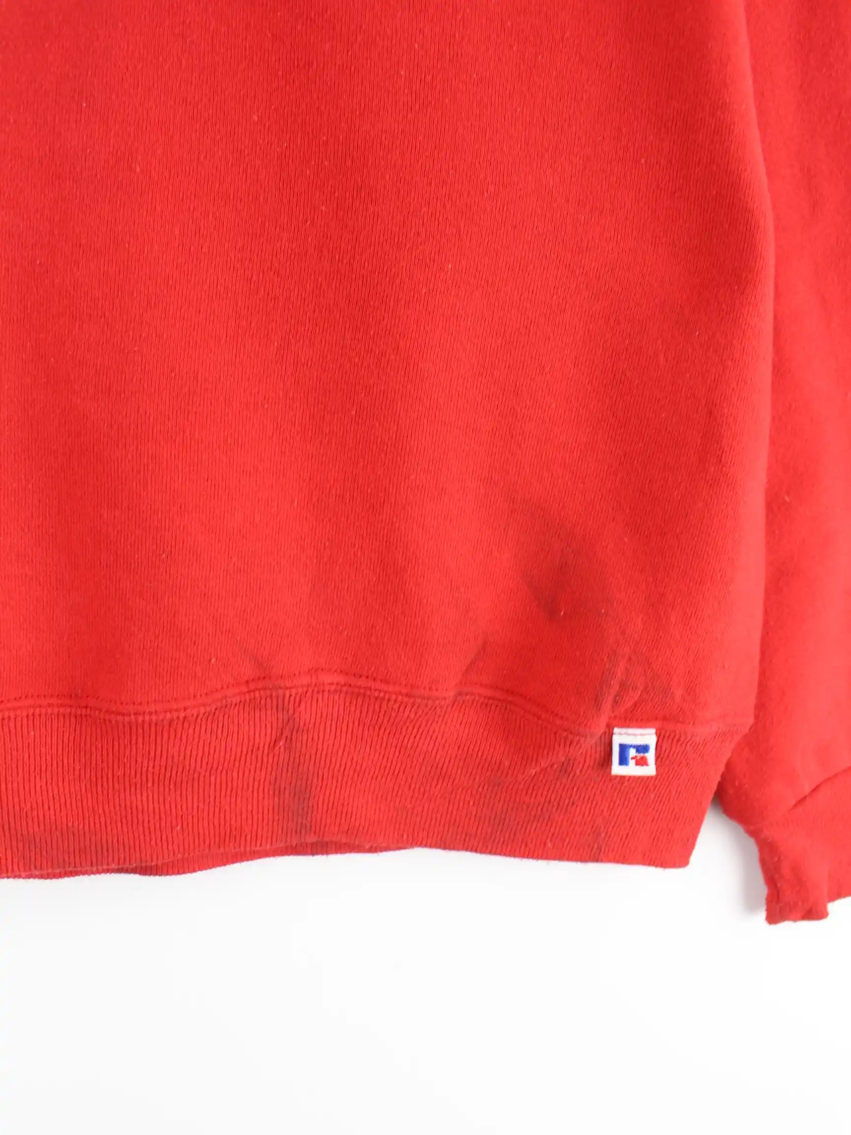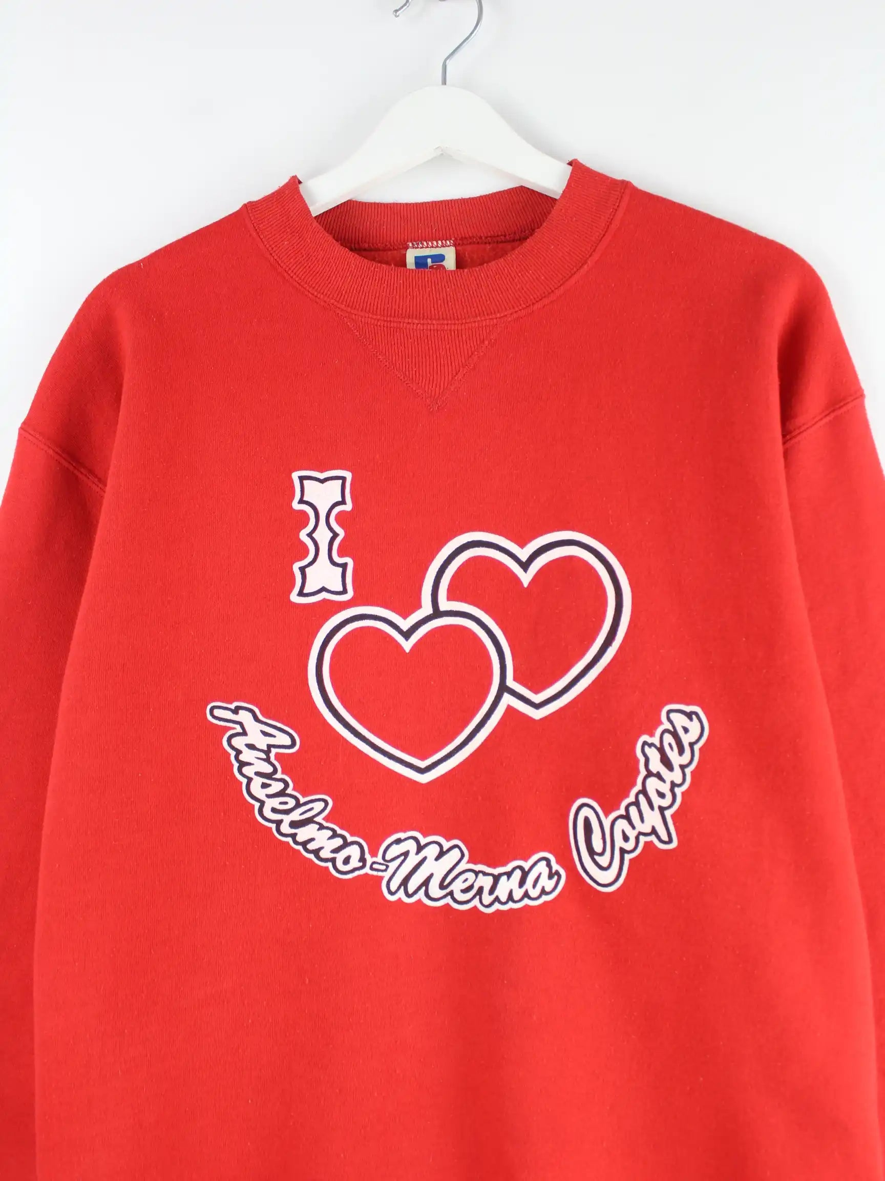 Roter Sweater der Brand Russell Athletic aus den 90'ern in Größe L. Er ist aus einer Baumwollmischung gefertigt. Den Zustand würden wir als 'In Ordnung' bezeichnen (vergl. Bilder).Mit schickem Love Print.