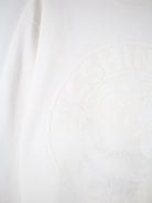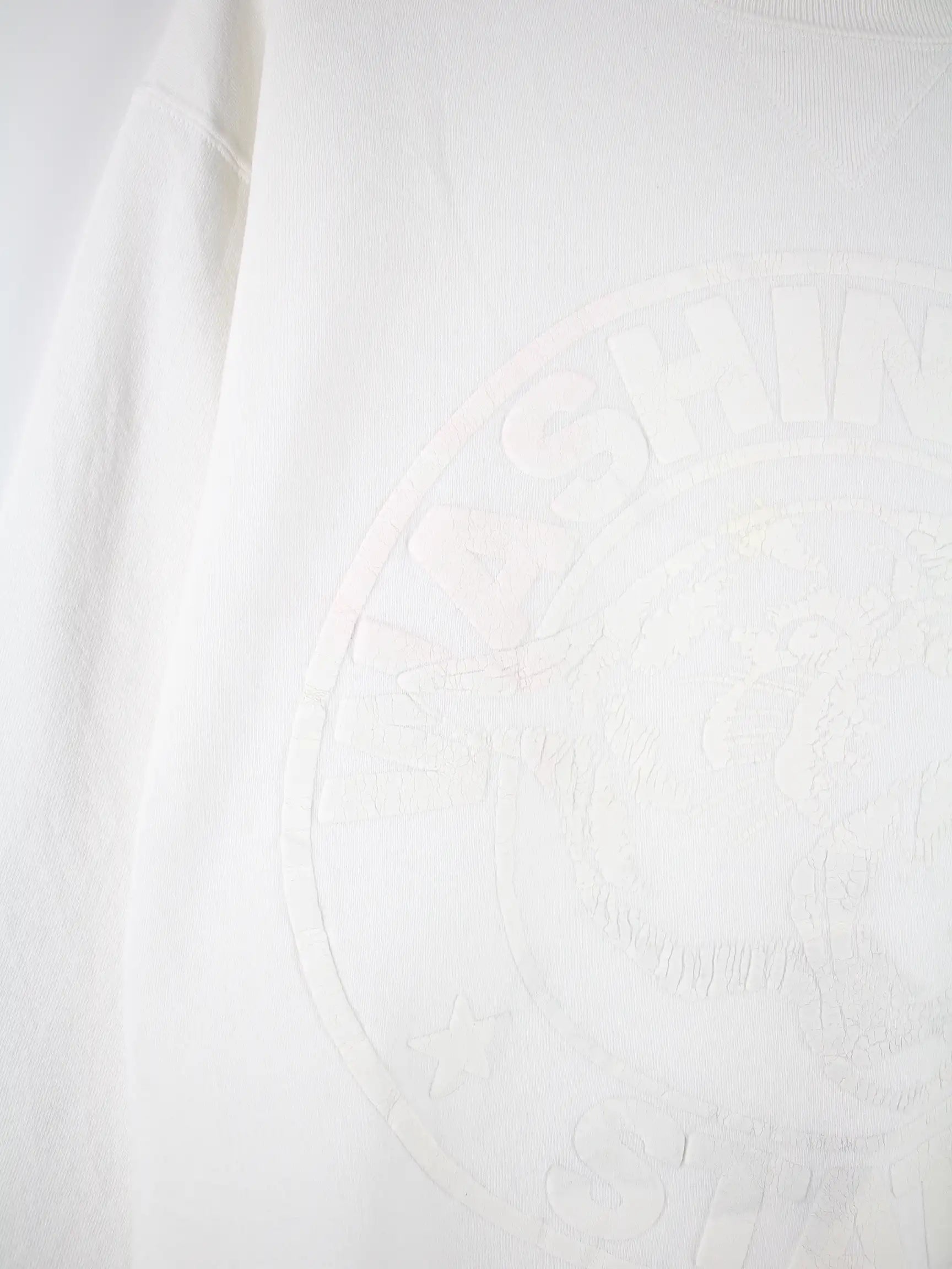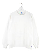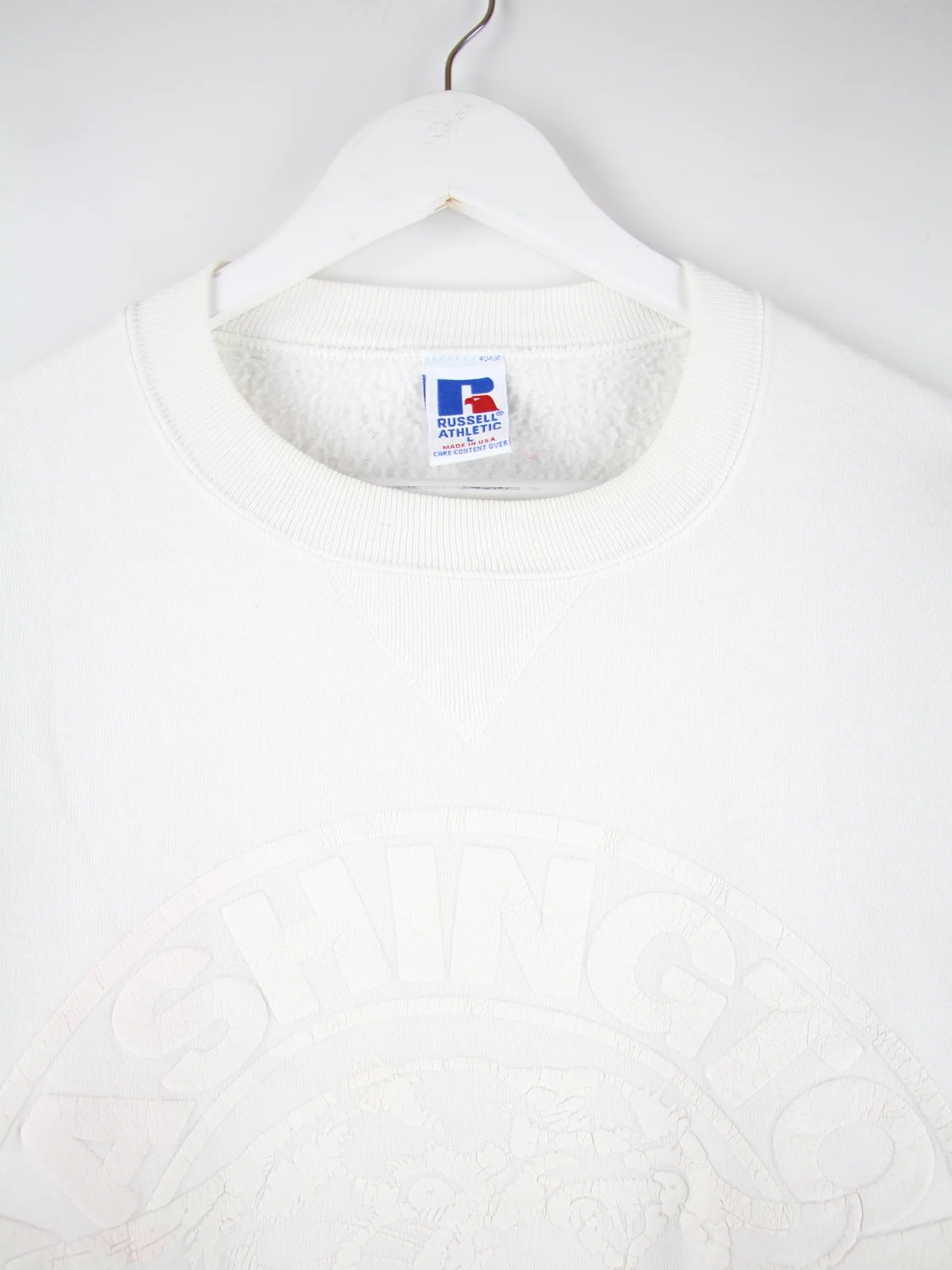 Weißer Sweater der Marke Russell Athletic aus den 90'ern in Größe L. Er ist aus einer Baumwollmischung hergestellt. Den Zustand würden wir als 'In Ordnung' bezeichnen (vergl. Bilder).Mit seltenem Puff Print.