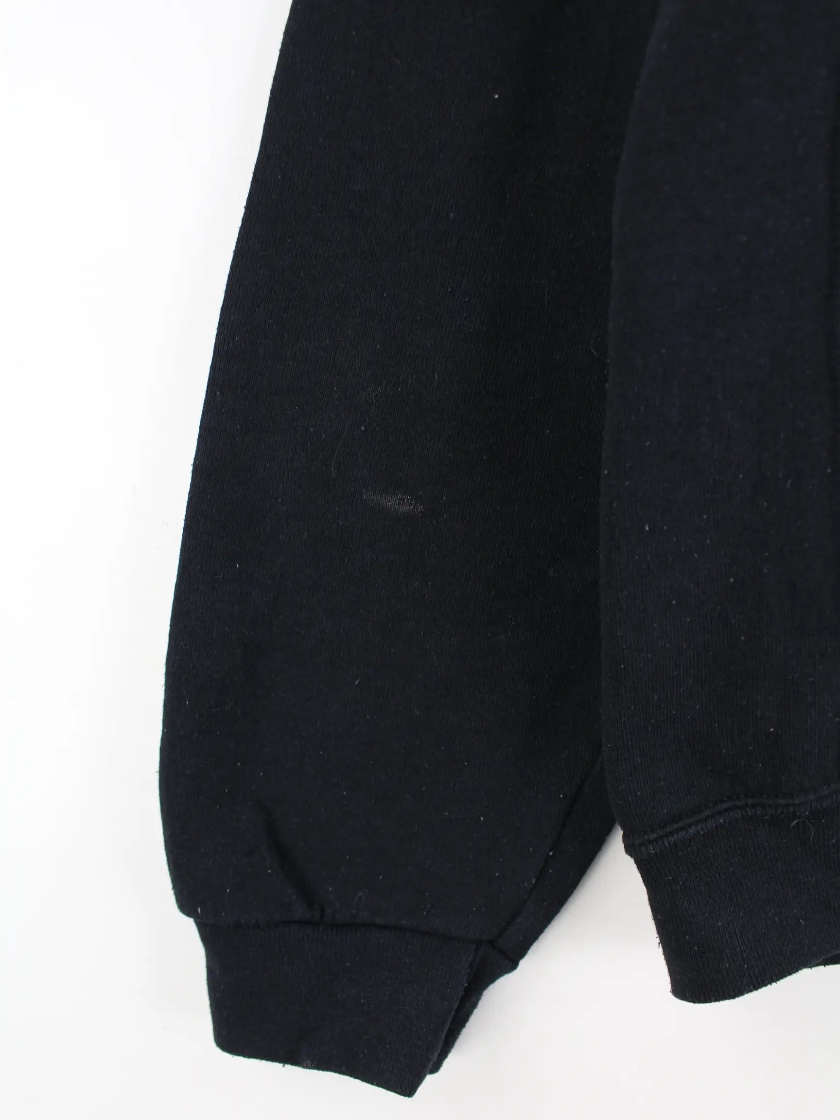 Schwarzer Sweater aus dem Hause Russell Athletic in Größe M. Er ist aus einer Baumwollmischung gemacht und in gutem Zustand bei uns vorrätig. Mit chiquem Tomcats Print.