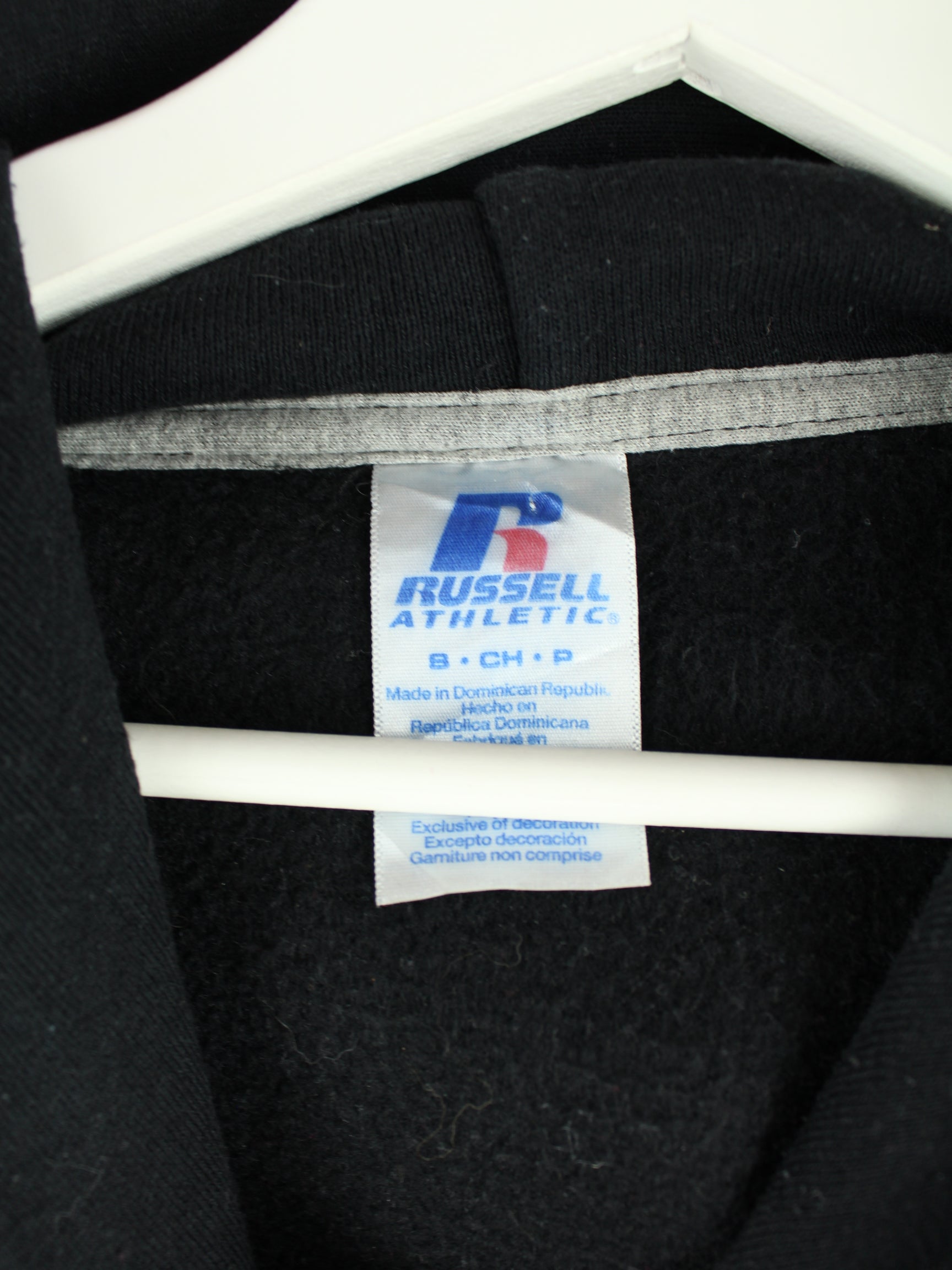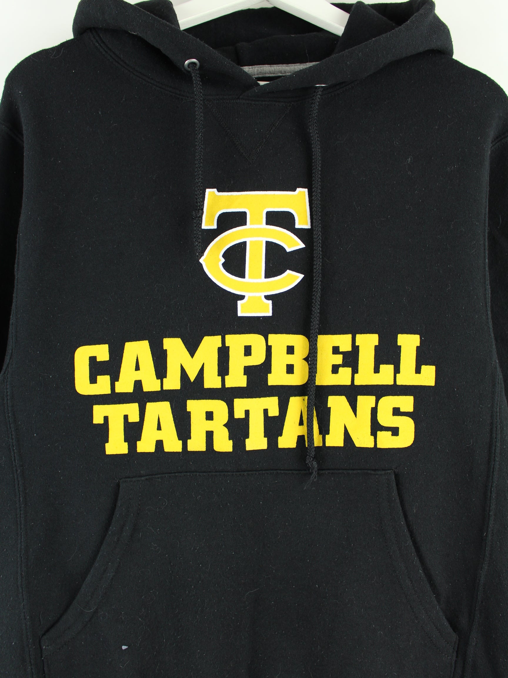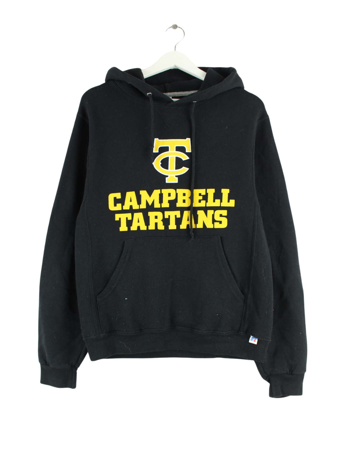 Schwarzer Hoodie der Marke Russell Athletic aus Anfang der 2000'er in Größe S. Er ist aus einer Baumwollmischung produziert und in sehr gutem Zustand im Bestand. Mit schönem Tartans Print.