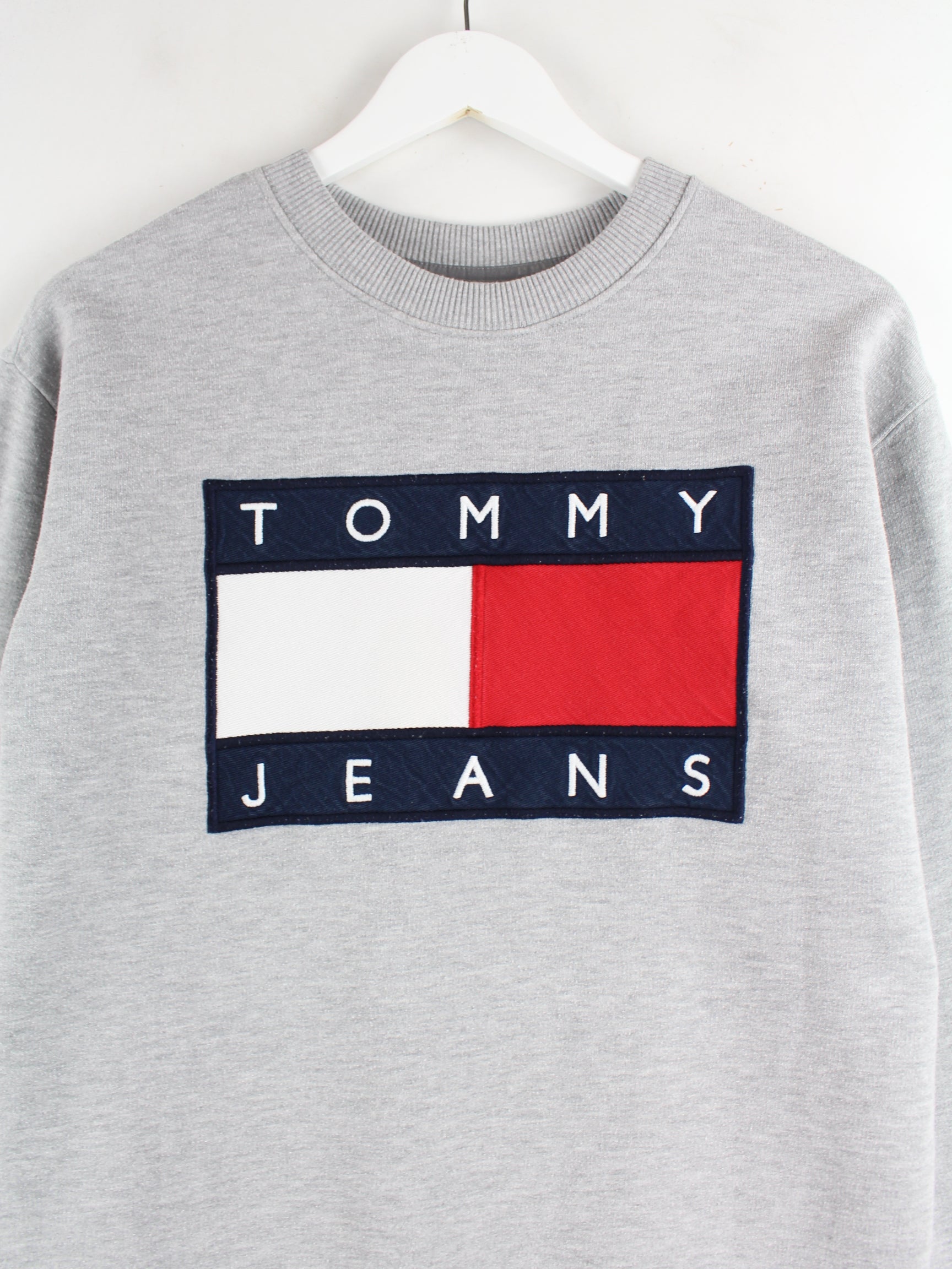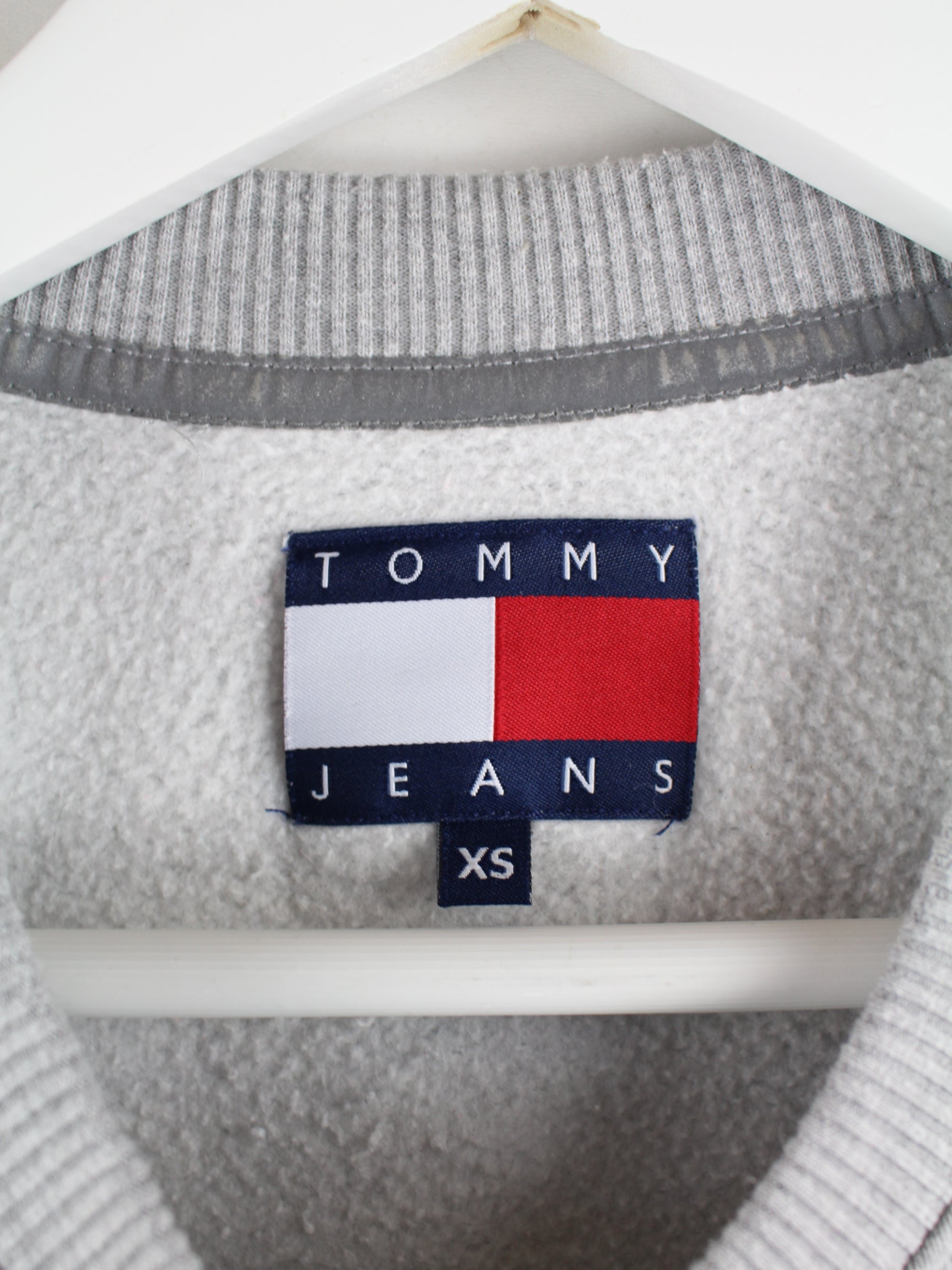 Sweater der Marke Tommy Hilfiger mit gesticktem Logo in Größe XS. Er ist aus einer Baumwollmischung produziert und in Grau in Stock.