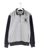 Grauer Vintage Sweater mit gesticktem Logo und kurzem Reißverschluß in Größe L. Er ist aus einer Baumwollmischung produziert und in sehr gutem Zustand lieferbar.