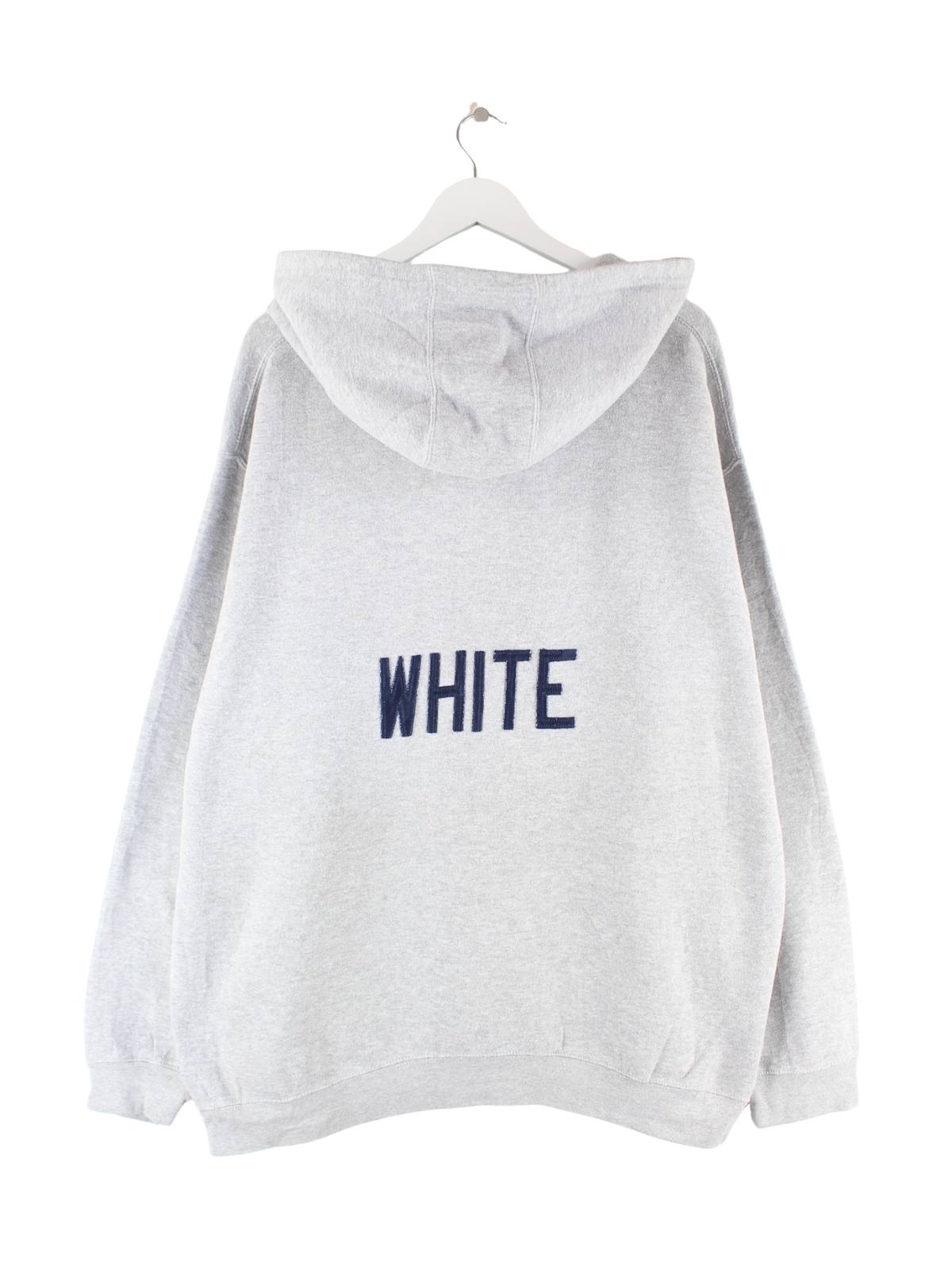 Vintage Hoodie mit Stickereien in Größe XXL. Er ist aus einer Baumwollmischung angefertigt und in Grau lieferbar.