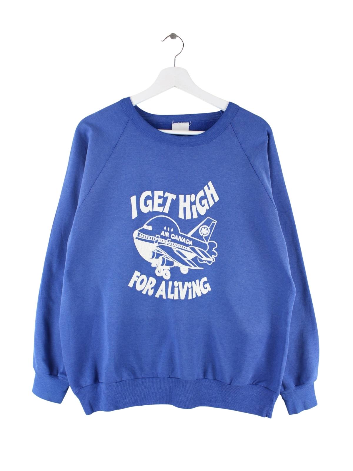 Blauer Vintage Sweater aus den 80'ern in Größe M. Er ist aus einer Baumwollmischung gemacht und in gutem Zustand bei uns vorrätig. Mit schickem Canada Print.