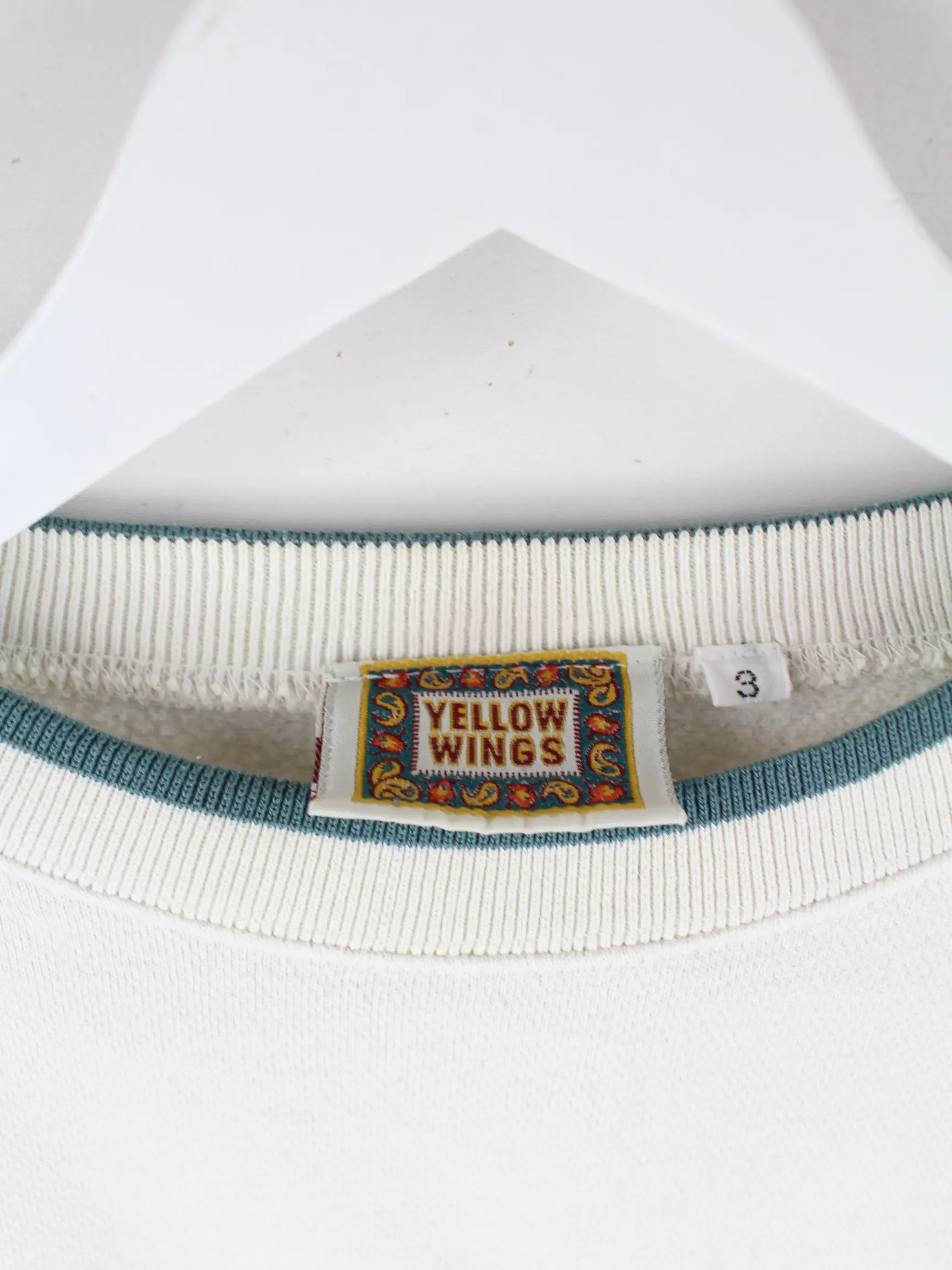 Vintage Sweater mit gestickten Motiven in Größe XS aus den 80'ern. Er ist aus einer Baumwollmischung angefertigt und in Weiß im Bestand.