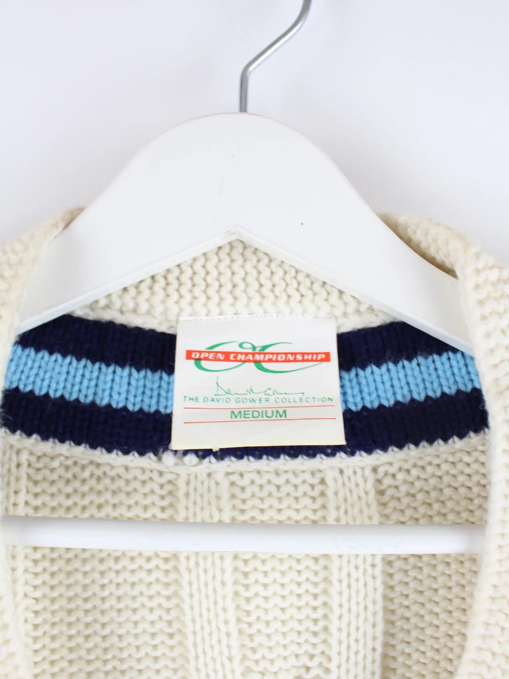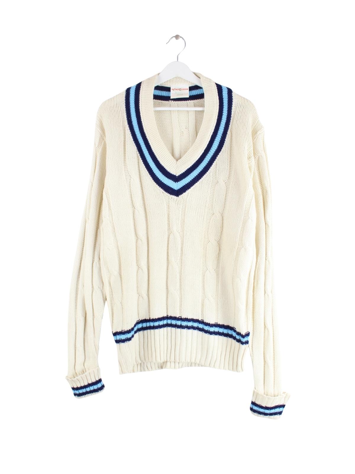 Vintage Pullover in Größe M aus den 80'ern. Er ist aus Synthetik produziert und in Beige zu haben.