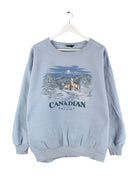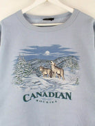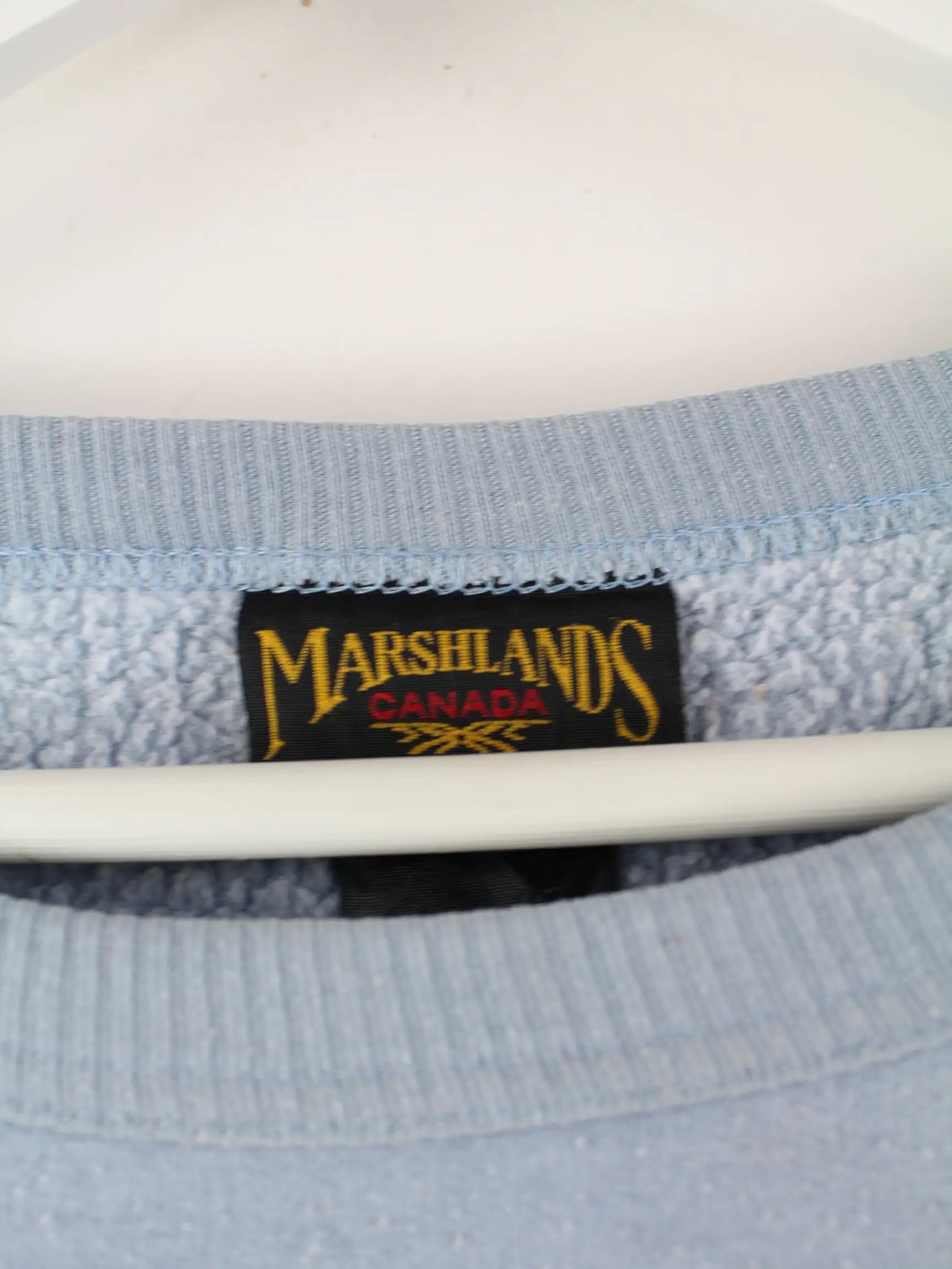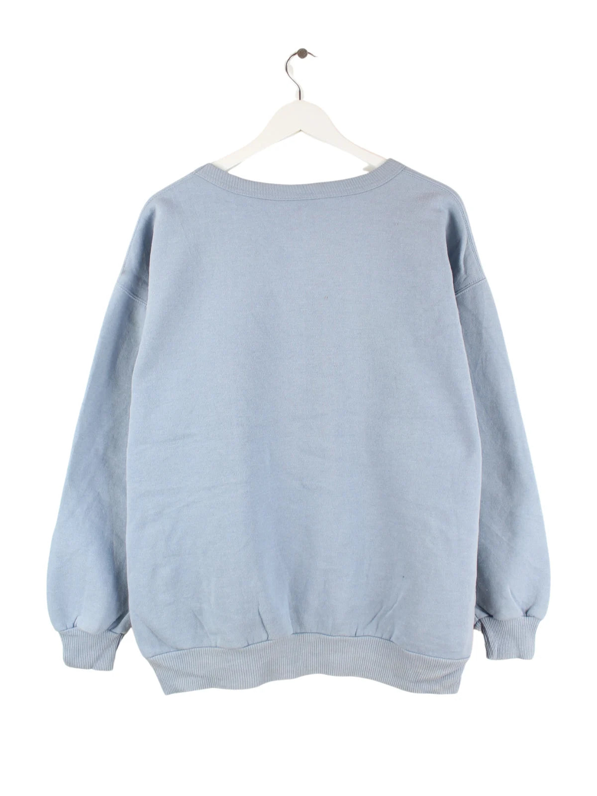 Vintage Sweater mit Stick in Größe L aus den 90'ern. Er ist aus einer Baumwollmischung produziert und in Blau bei uns zu bekommen.
