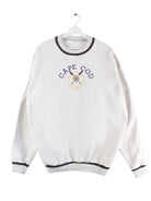 Vintage Sweater mit Stickereien in Größe XXL aus den 90'ern. Er ist aus einer Baumwollmischung gemacht und in Grau bei uns zu bekommen.