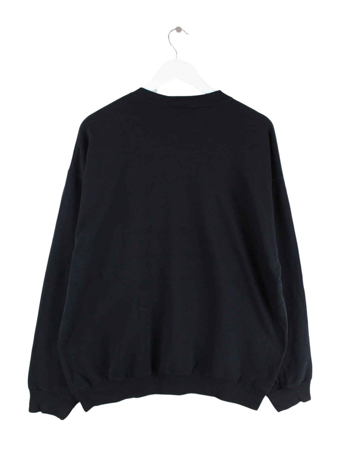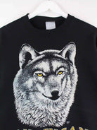 Schwarzer Vintage Sweater aus den 90'ern in Größe XL. Er ist aus einer Baumwollmischung produziert und in sehr gutem Zustand bei uns zu bekommen. Mit seltenem Wolf Print.