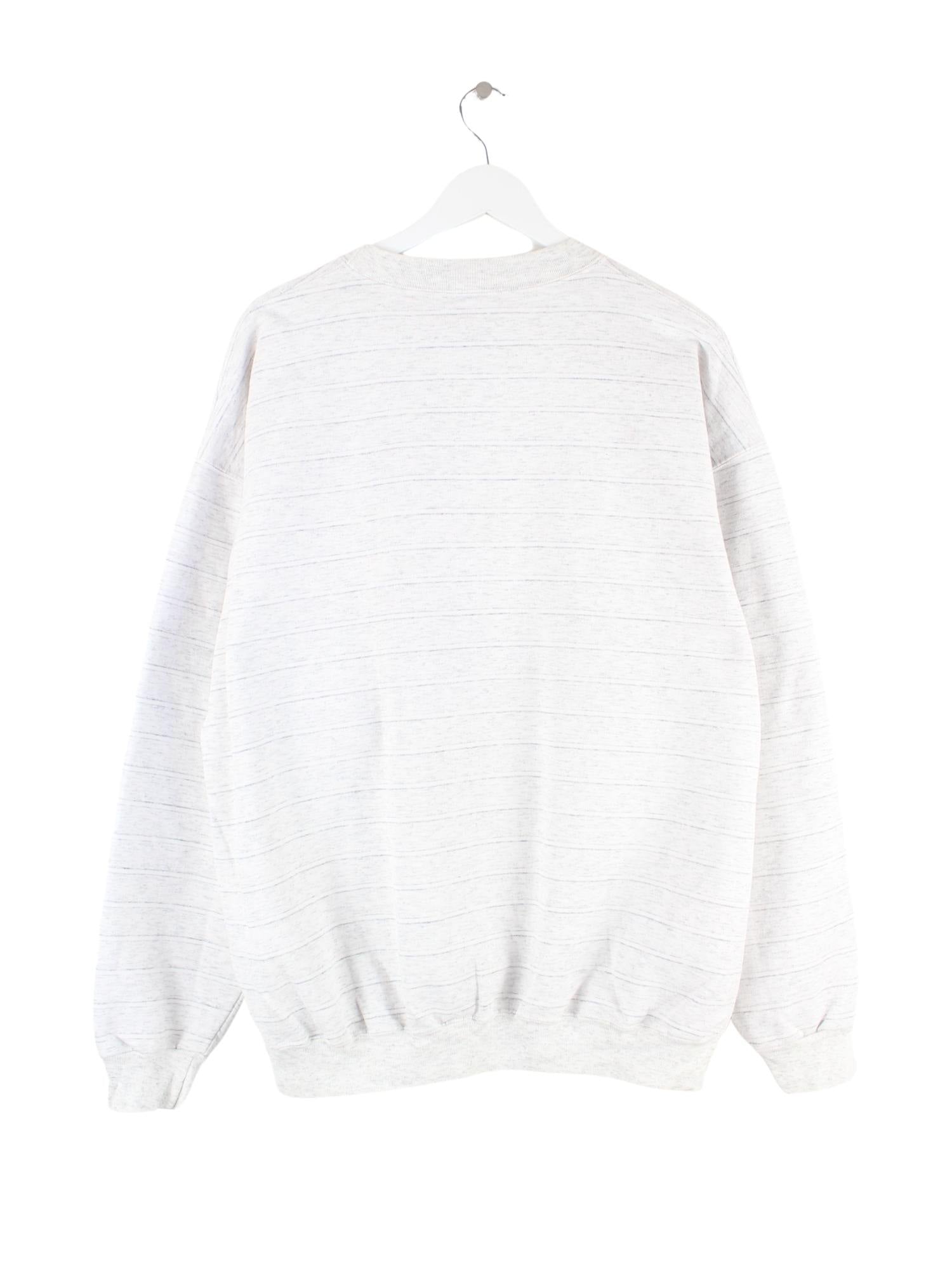 Grauer Vintage Sweater mit gestickten Motiven aus den 90'ern in Größe XL. Er ist aus einer Baumwollmischung gemacht und in gutem Zustand zu bekommen.