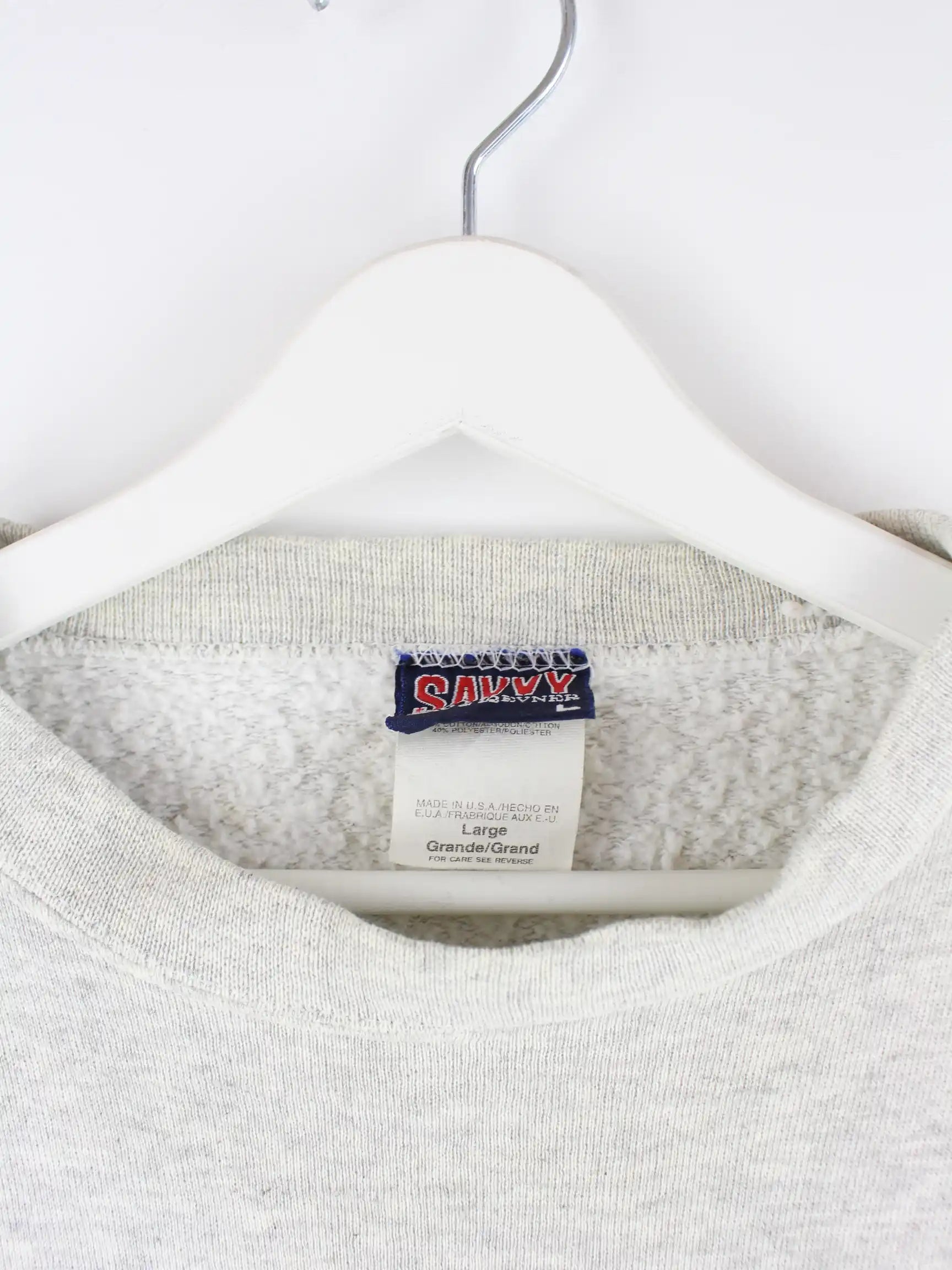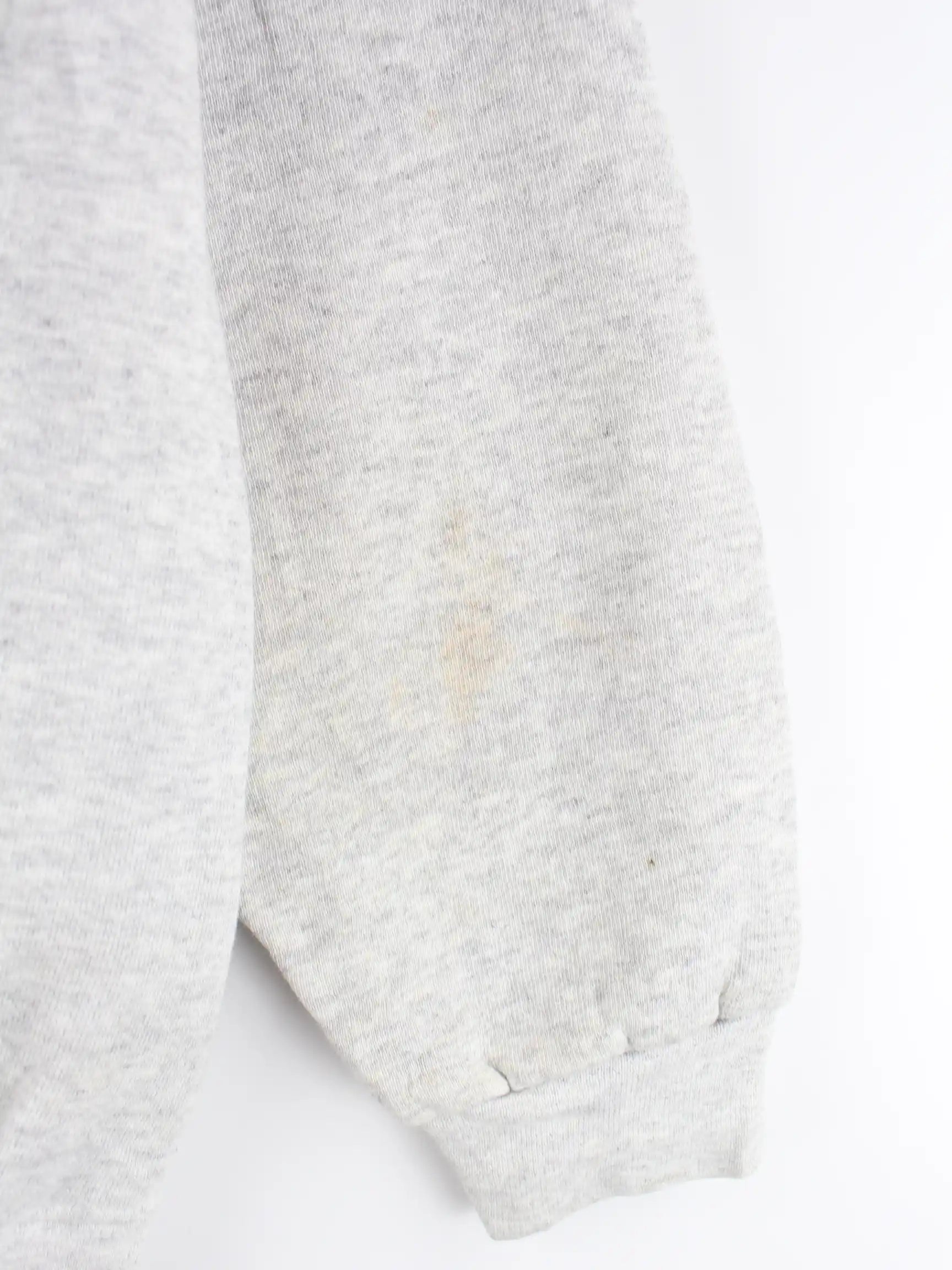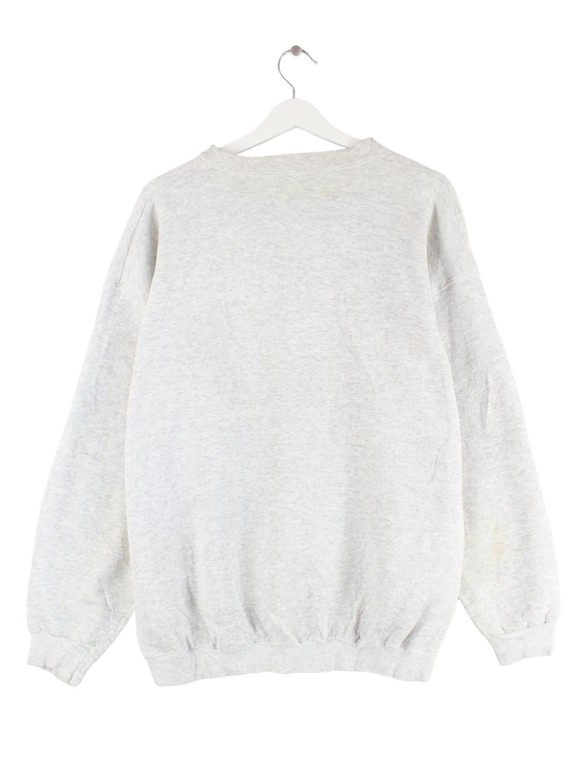 Vintage Sweater in Größe L aus den 90'ern. Er ist aus einer Baumwollmischung hergestellt und in Grau bei uns vorrätig. Mit schönem Dame Print.