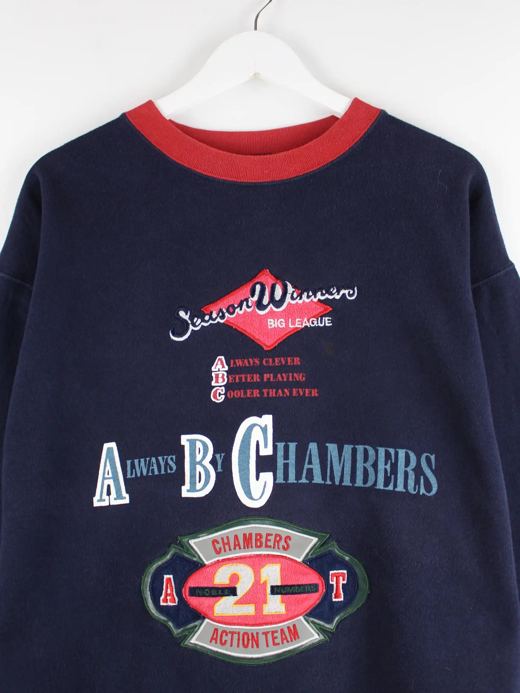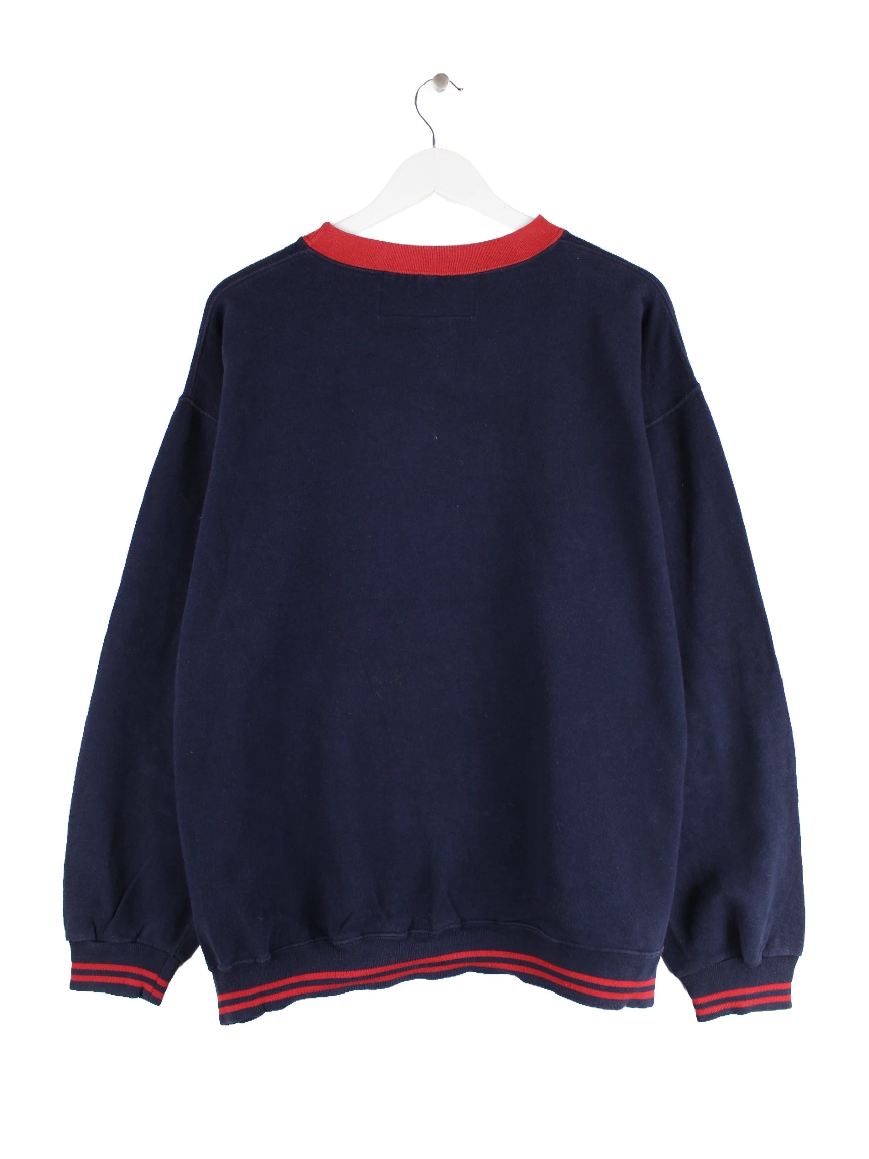 Blauer Vintage Sweater aus den 90'ern in Größe L. Er ist aus einer Baumwollmischung und in sehr gutem Zustand bei uns zu bekommen. Mit seltenem 90s Print.
