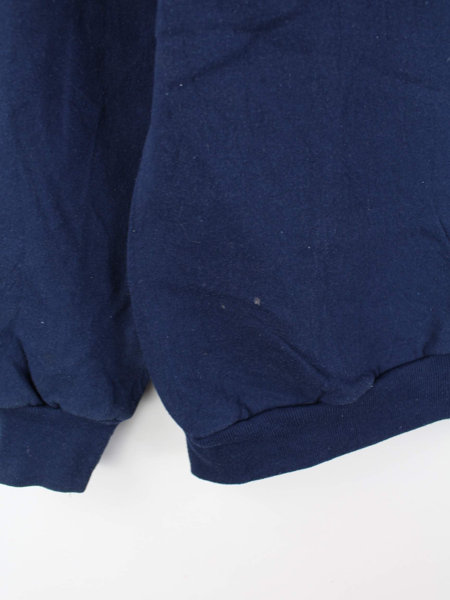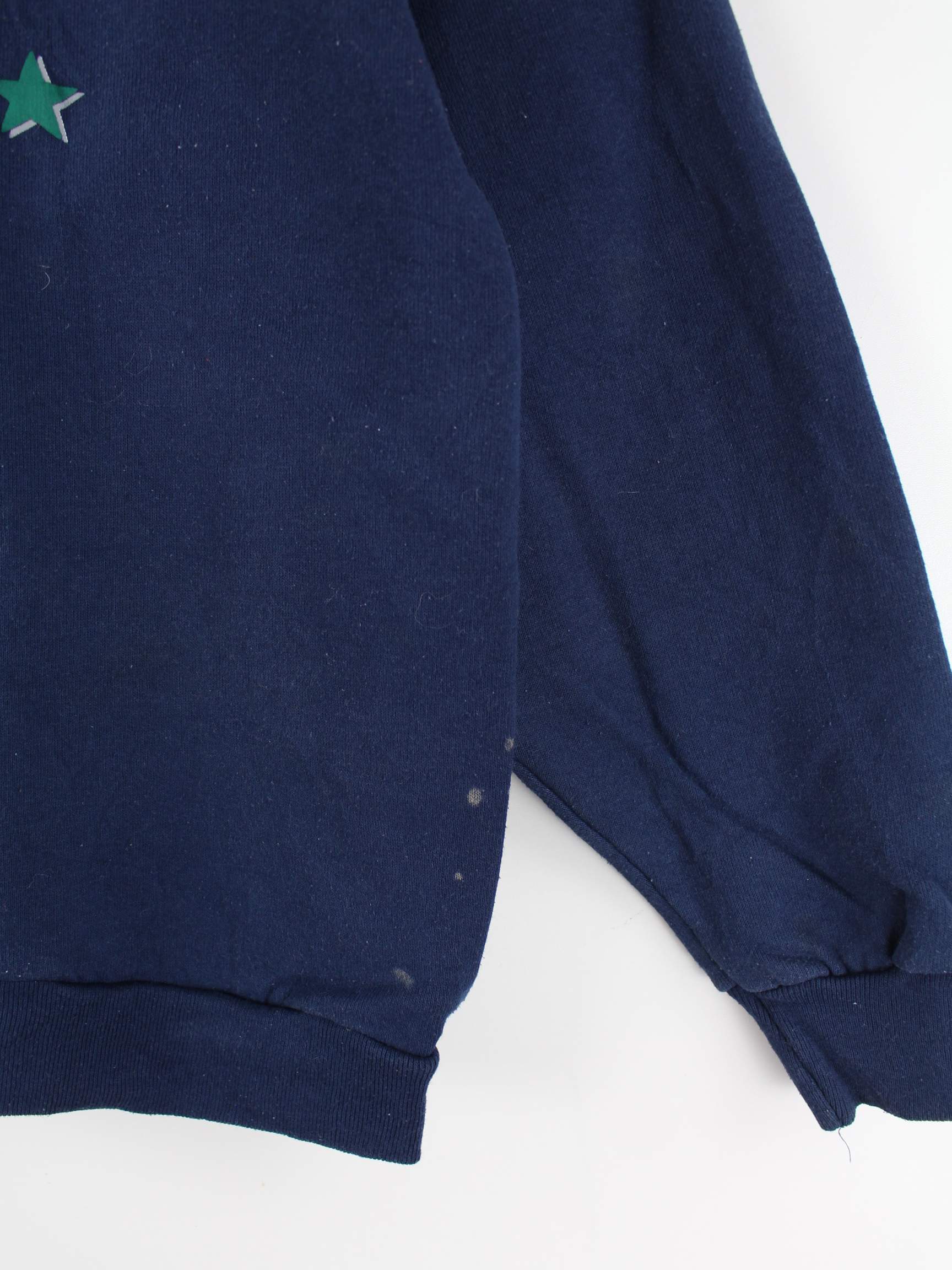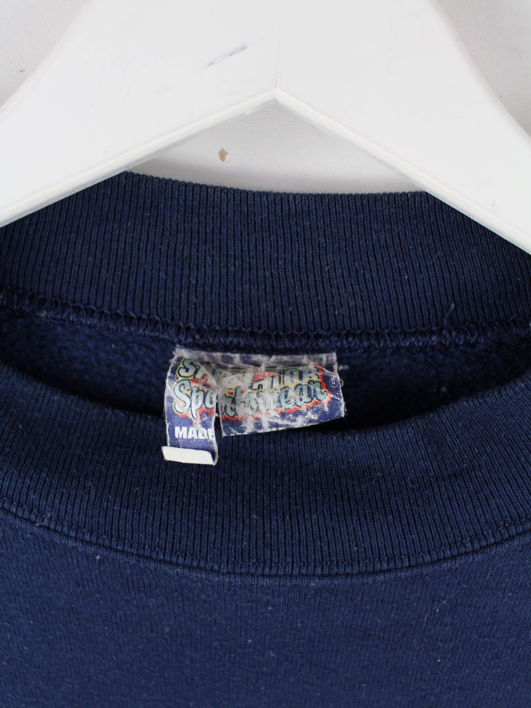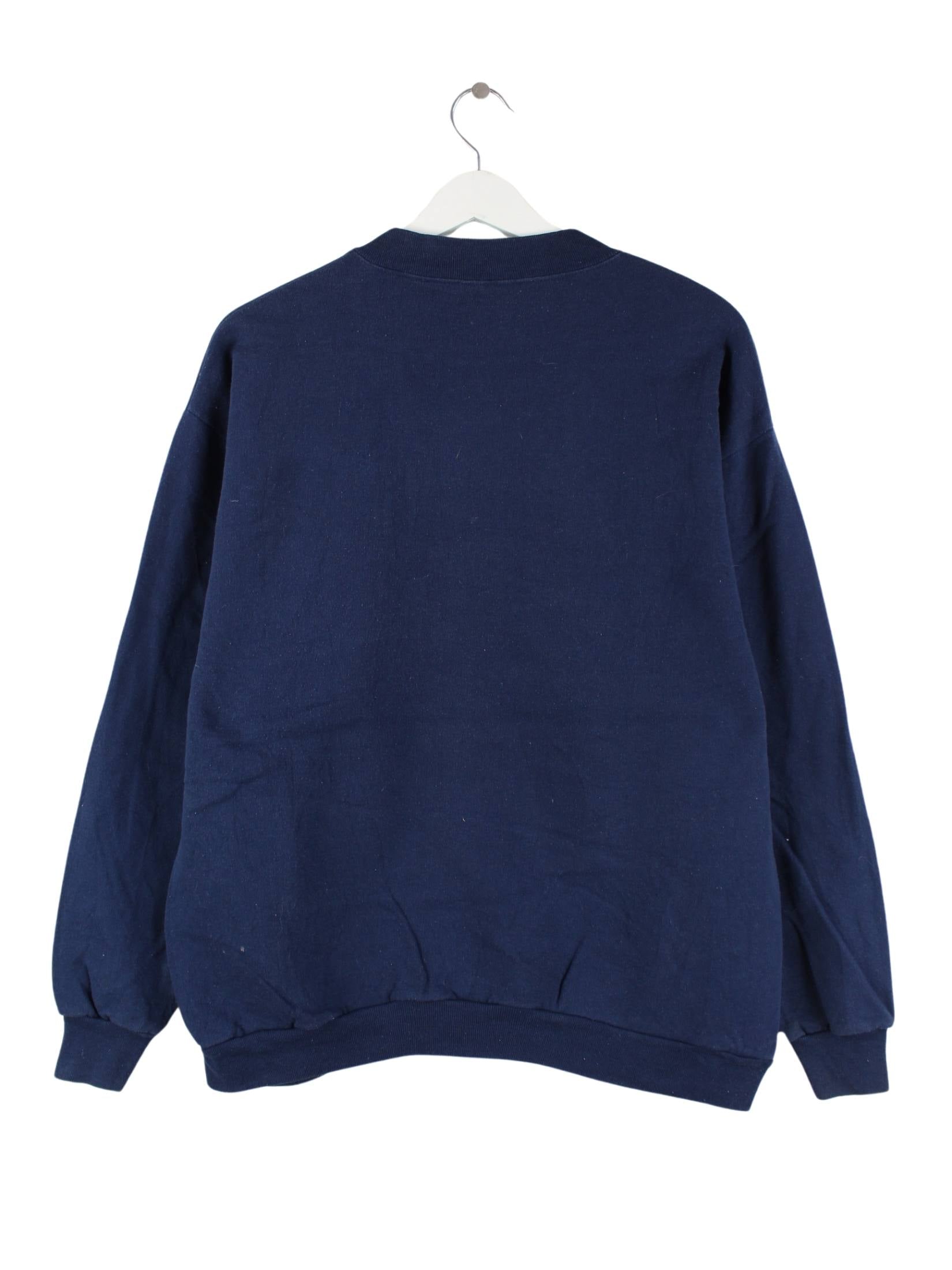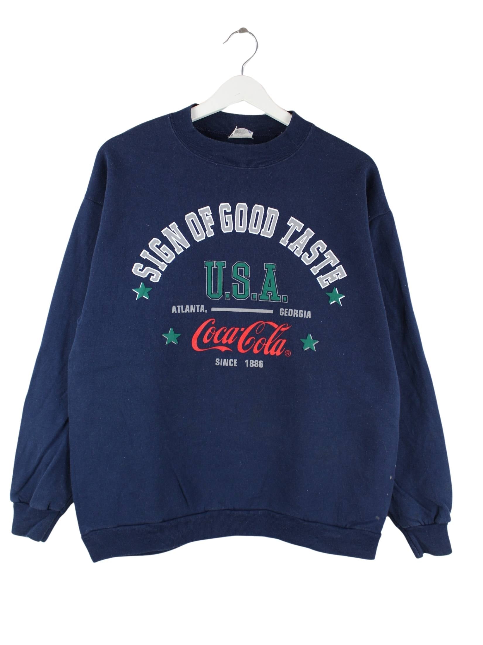 Blauer Vintage Sweater aus den 90'ern in Größe L. Er ist aus einer Baumwollmischung hergestellt und in gutem Zustand zu bekommen. Mit schönem Cola Print.