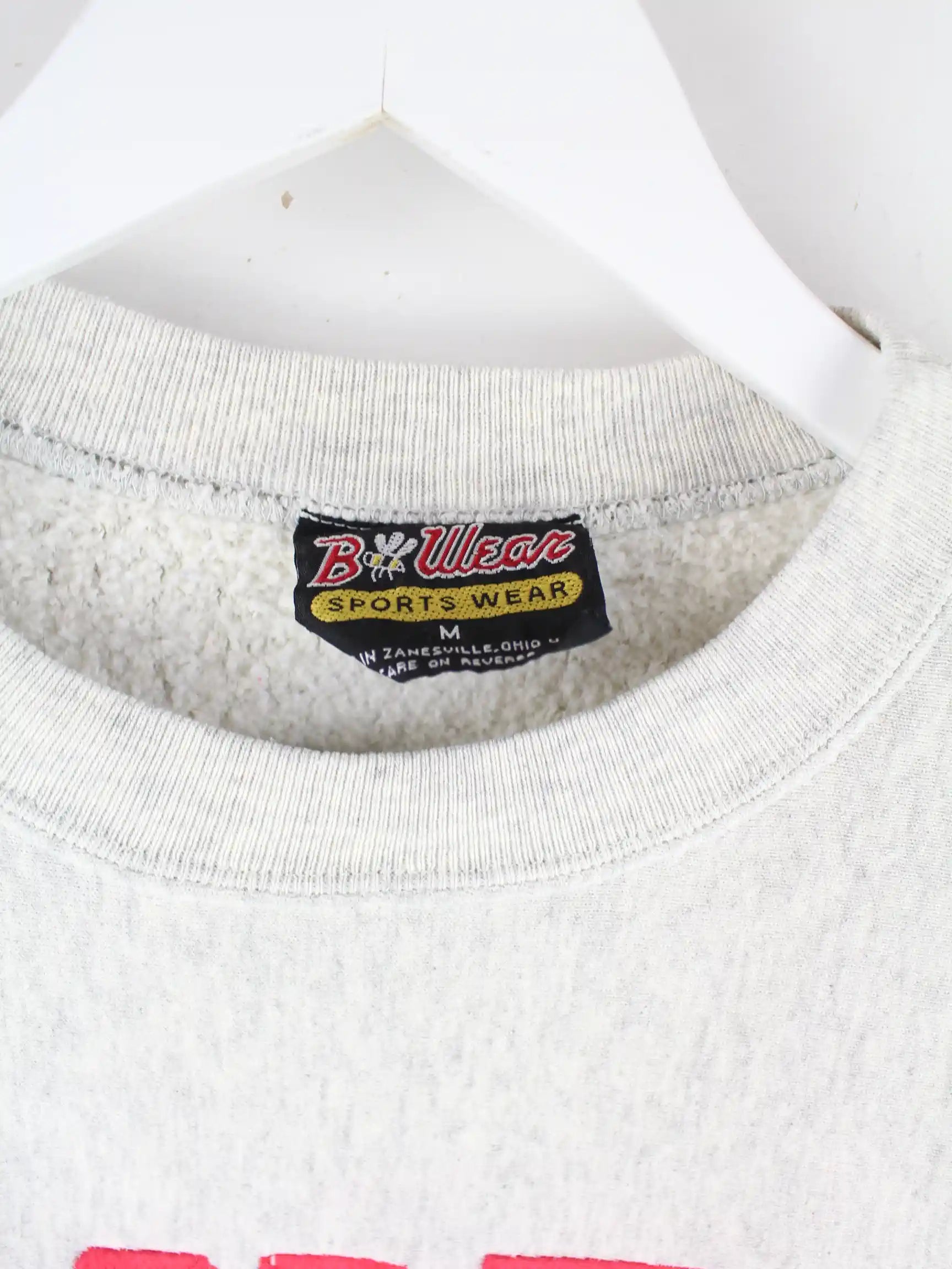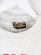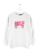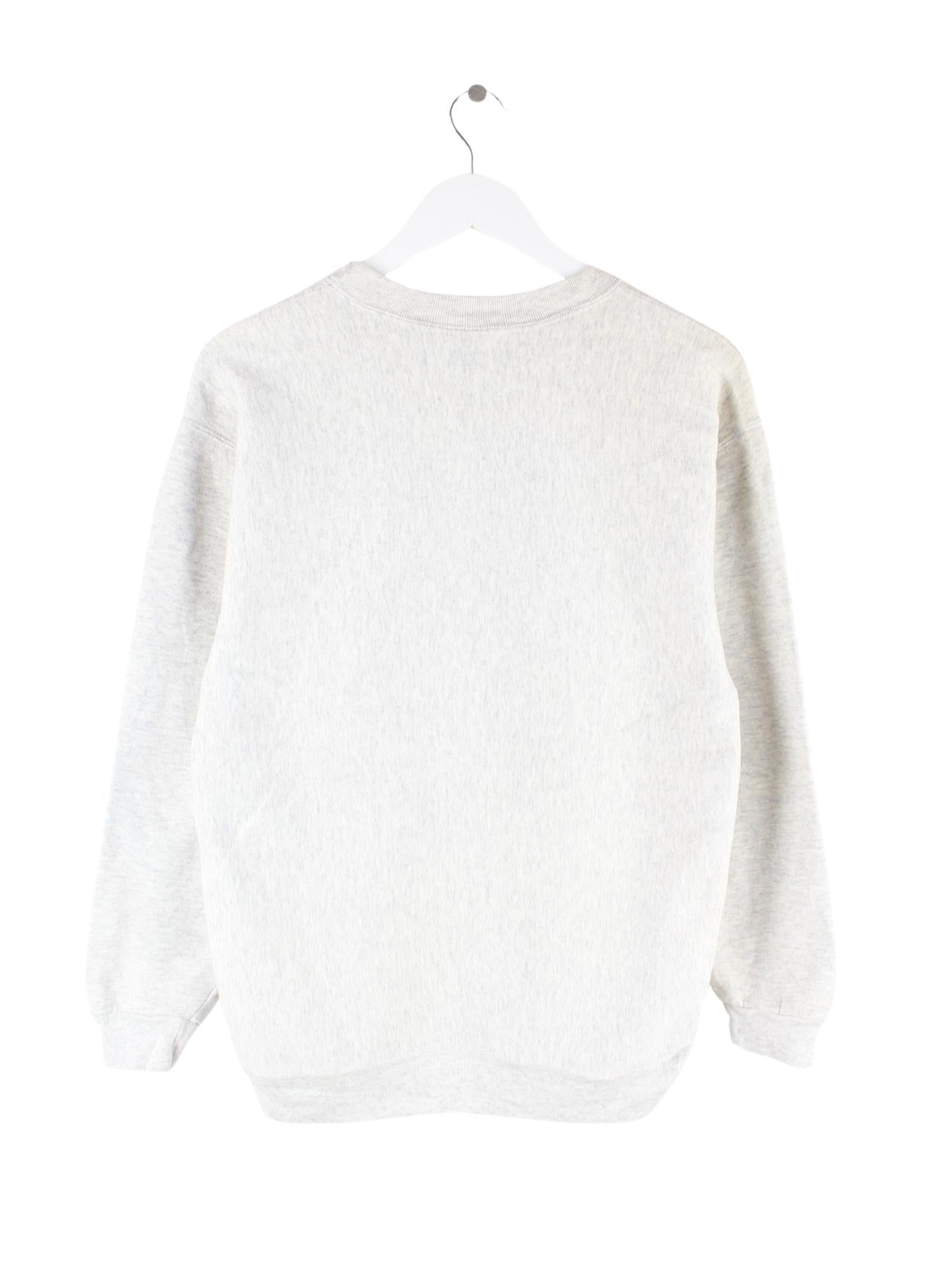 Vintage Sweater mit gesticktem Logo in Größe M aus den 90'ern. Er ist aus einer Baumwollmischung hergestellt und in Grau bei uns zu bekommen.