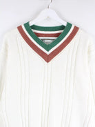 Vintage Pullover in Größe L aus den 90'ern. Er ist aus Baumwolle hergestellt und in Weiß vorrätig.