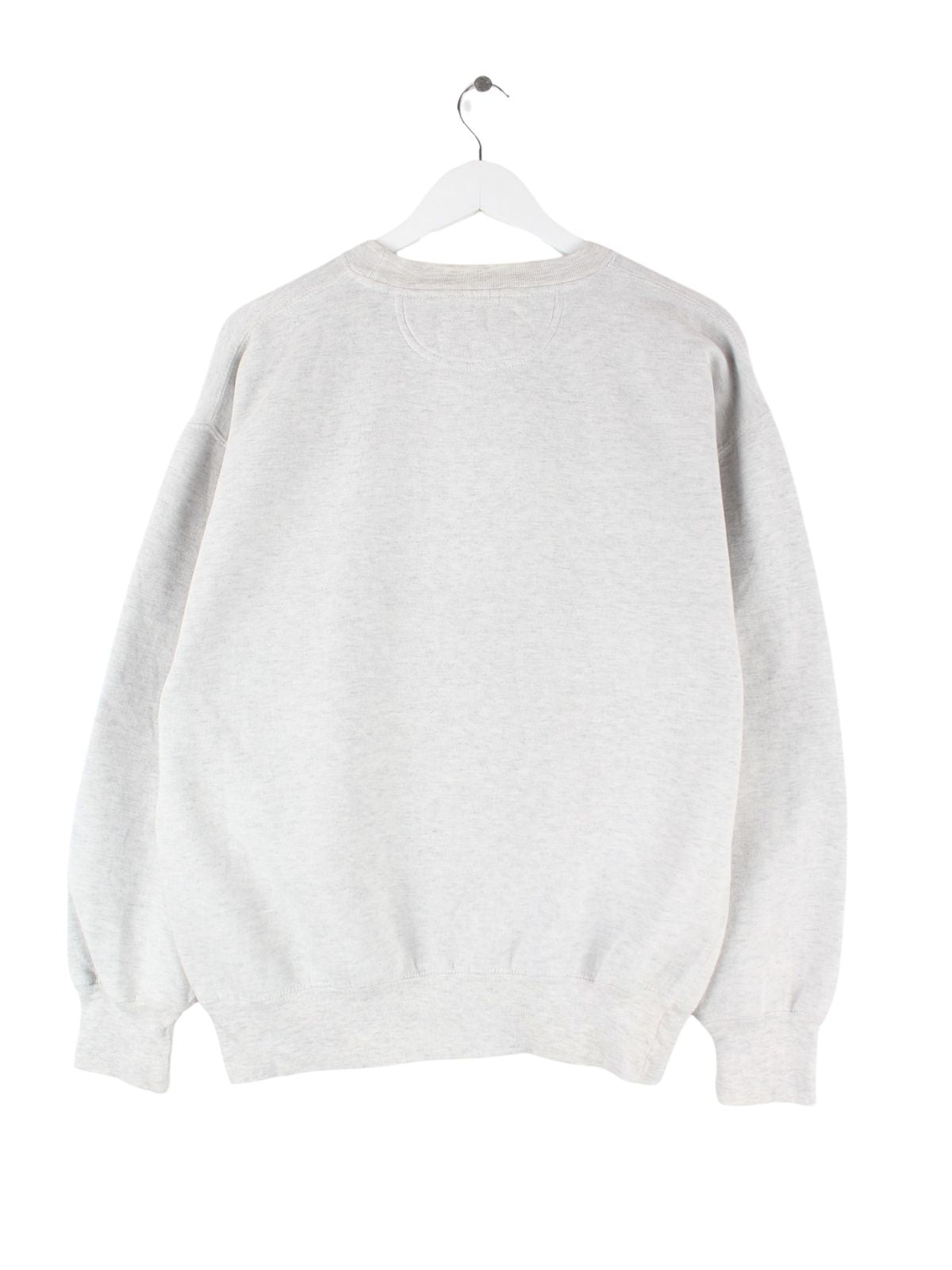 Vintage Sweater mit Stickereien in Größe M aus den 90'ern. Er ist aus einer Baumwollmischung gefertigt und in Grau im Bestand.