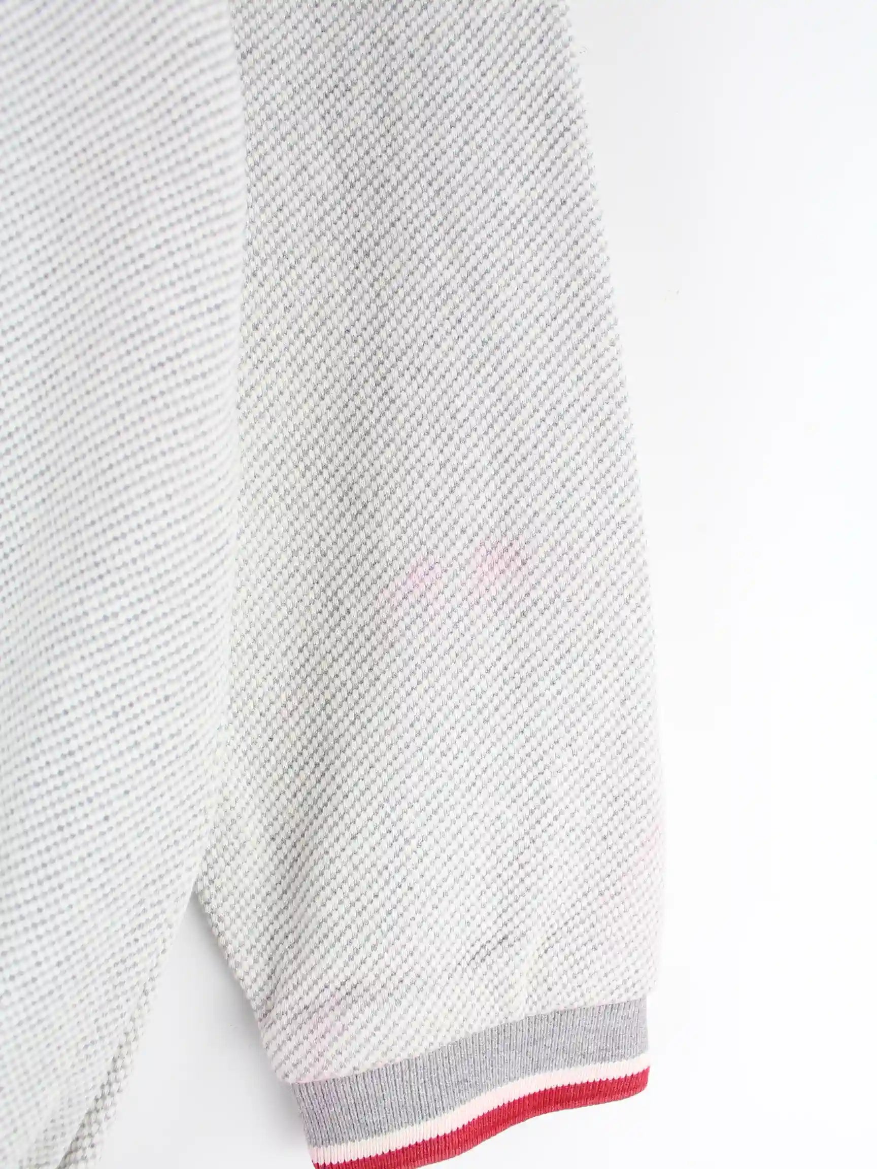 Vintage Sweater mit Stickereien in Größe S aus den 90'ern. Er ist aus einer Baumwollmischung gefertigt und in Grau vorrätig.