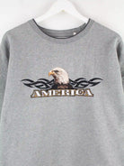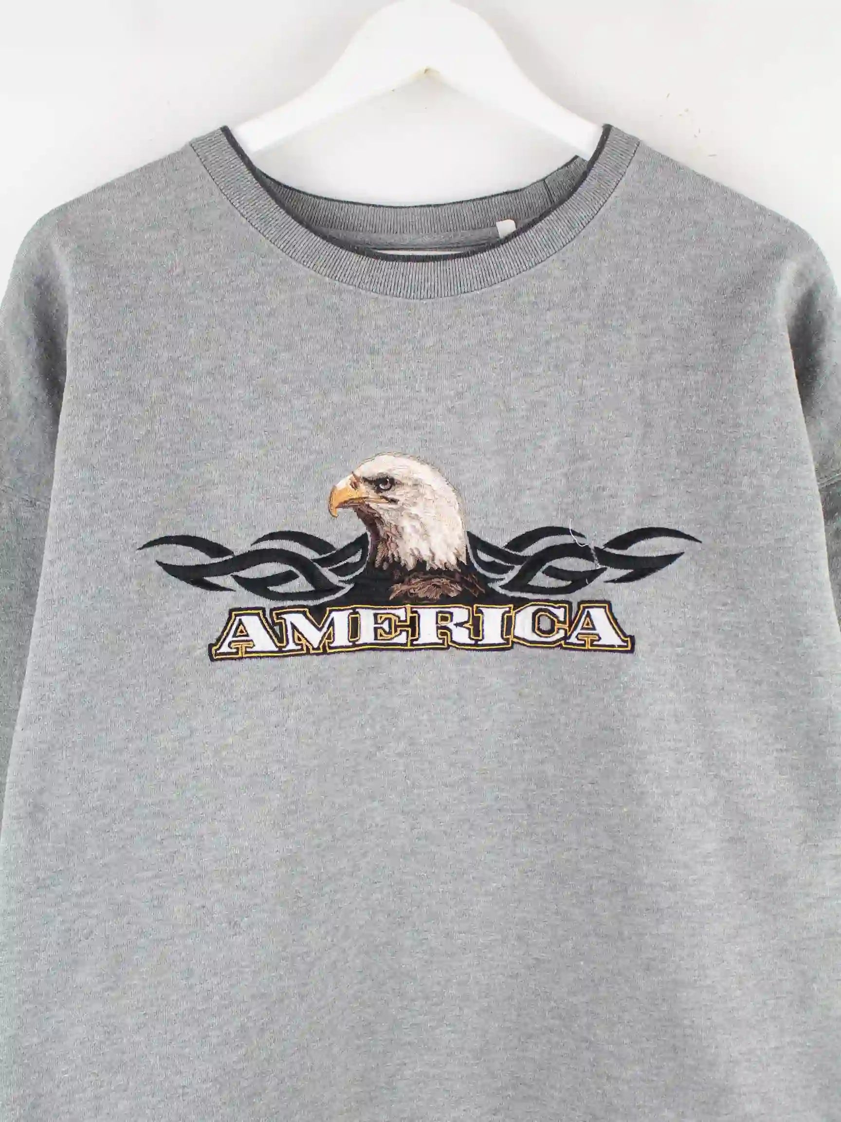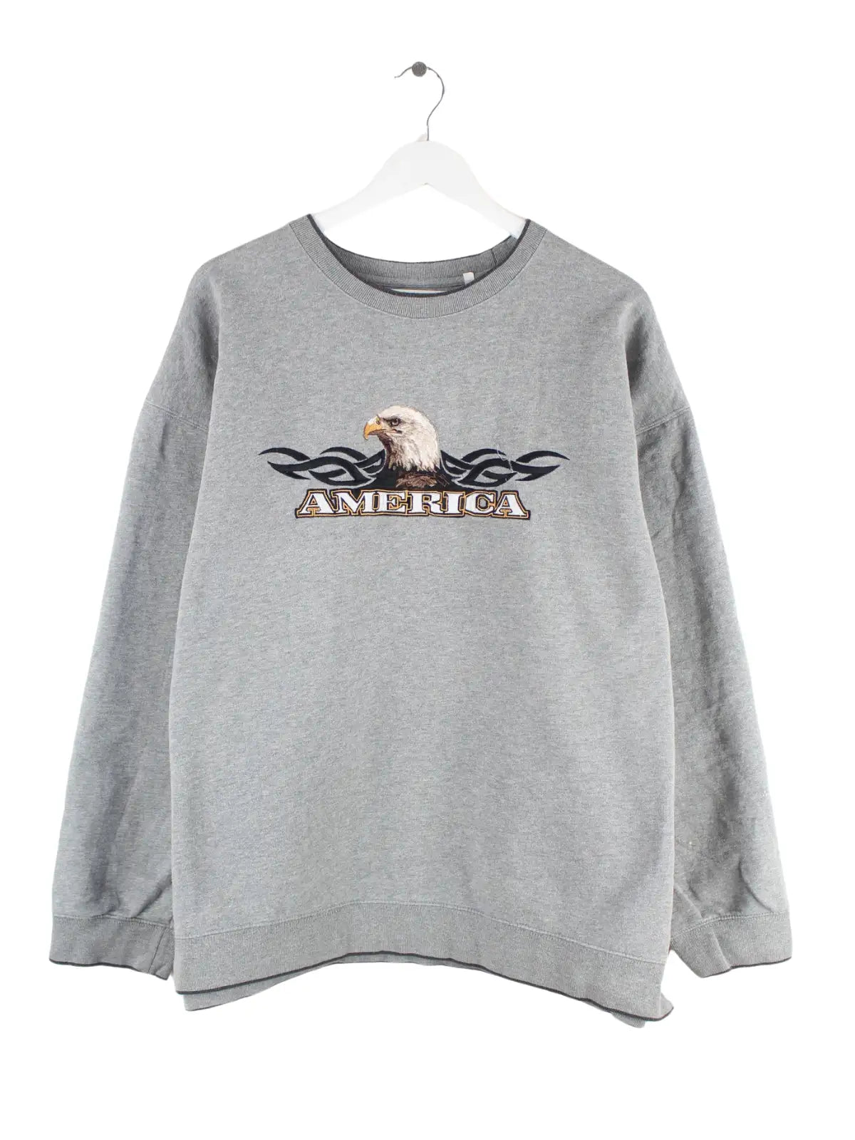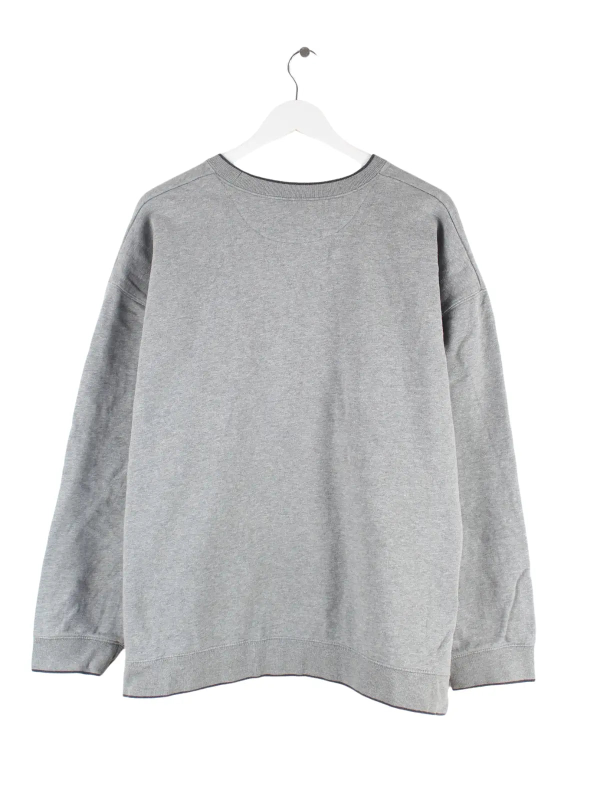 Vintage Sweater mit gesticktem Logo in Größe XL. Er ist aus einer Baumwollmischung und in Grau bei uns zu bekommen.