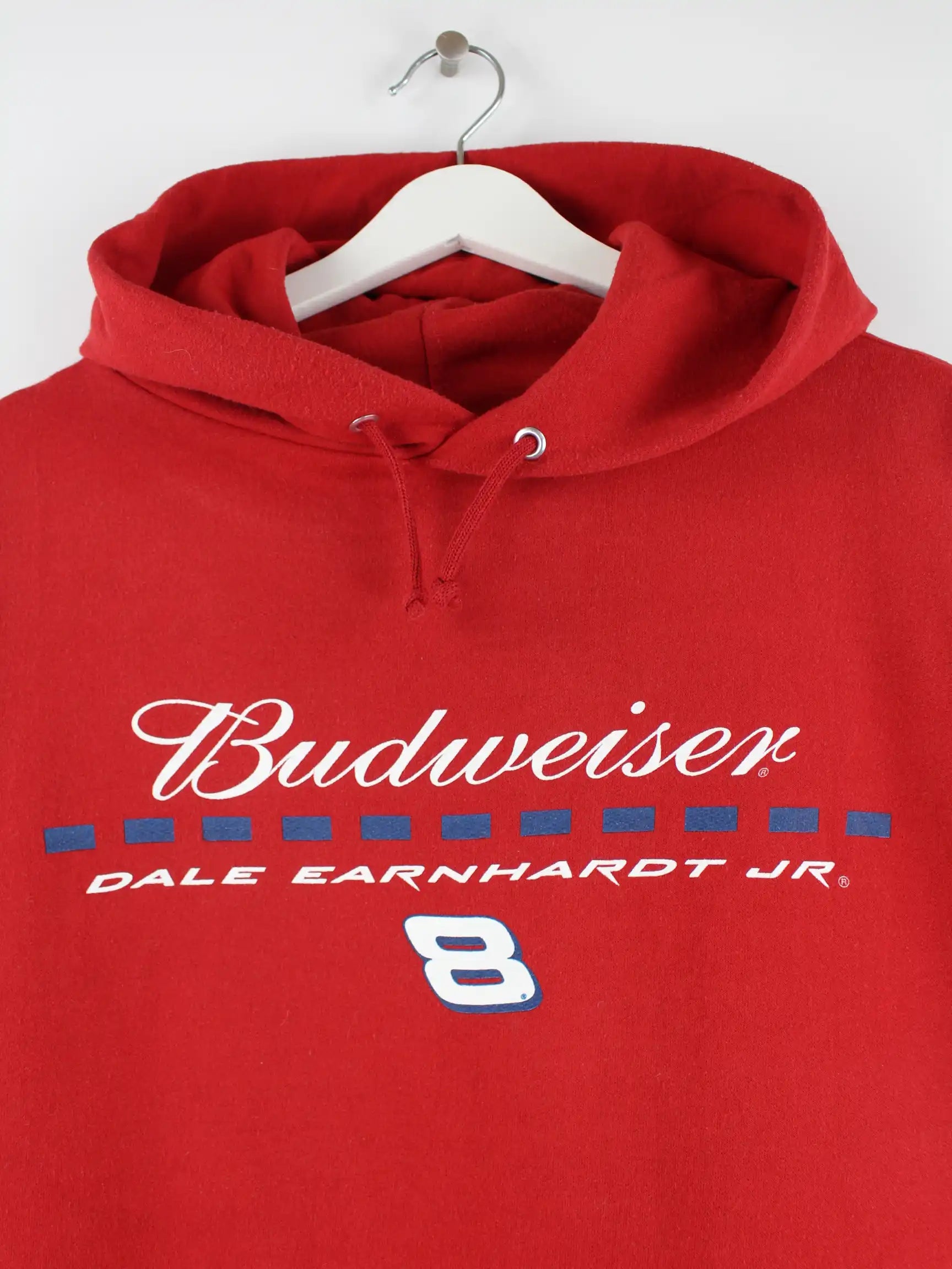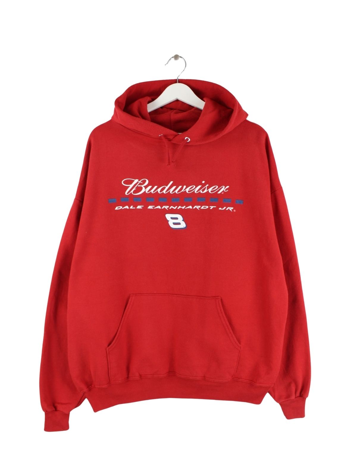Vintage Hoodie in Größe L. Er ist aus einer Baumwollmischung gefertigt und in Rot zu haben. Mit schickem Racing Print.