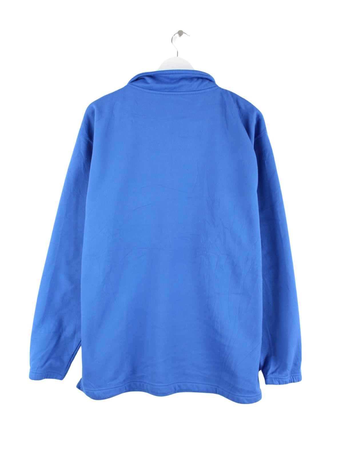 Blauer Vintage Sweater mit gesticktem Logo und half Zip in Größe L. Er ist aus Synthetik gefertigt und in gutem Zustand zu bekommen.