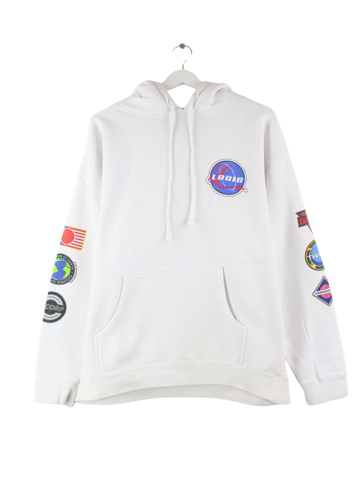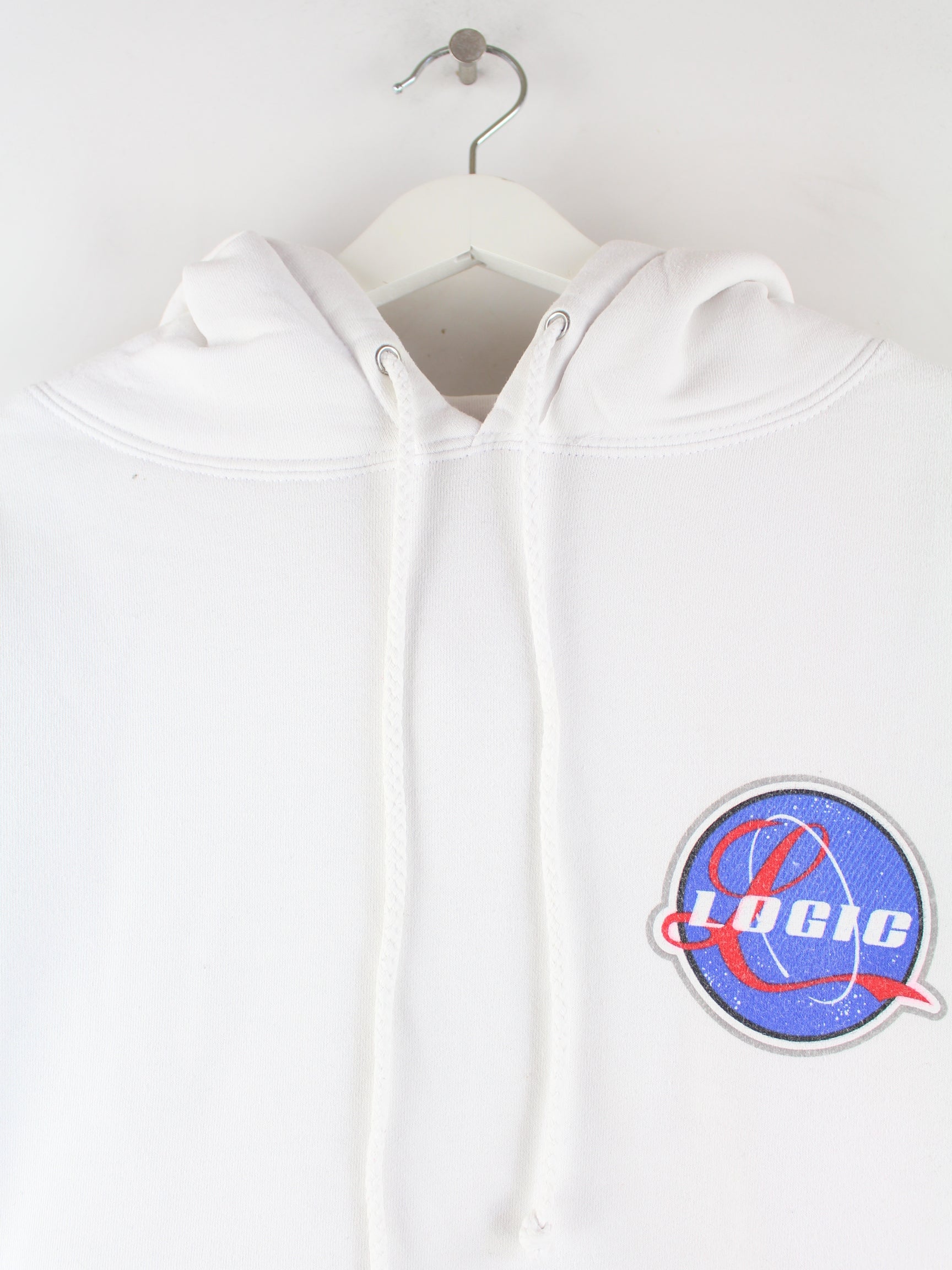 Weißer Vintage Hoodie in Größe L. Er ist aus einer Baumwollmischung und in gutem Zustand vorrätig. Mit seltenem Logic Print.