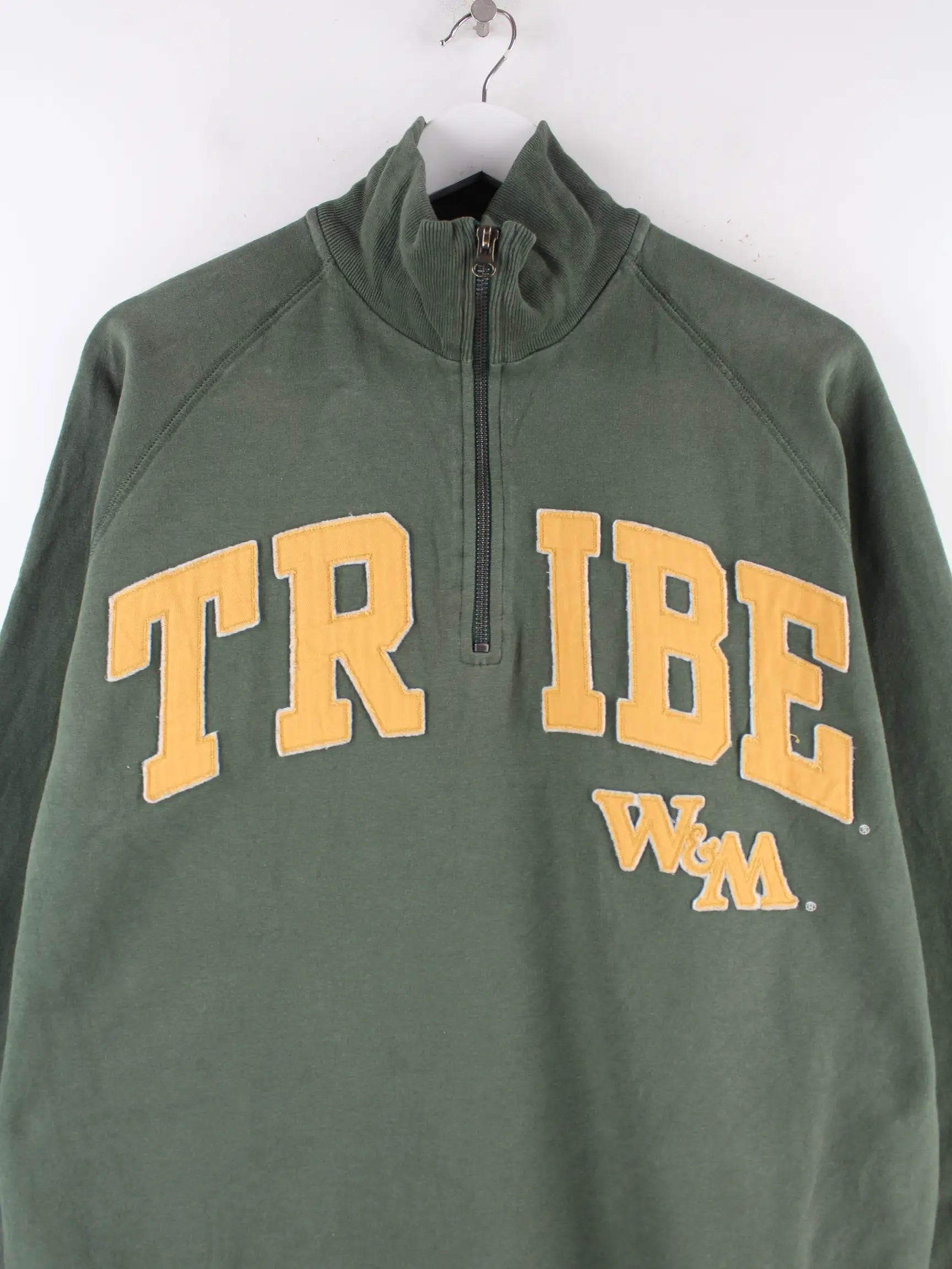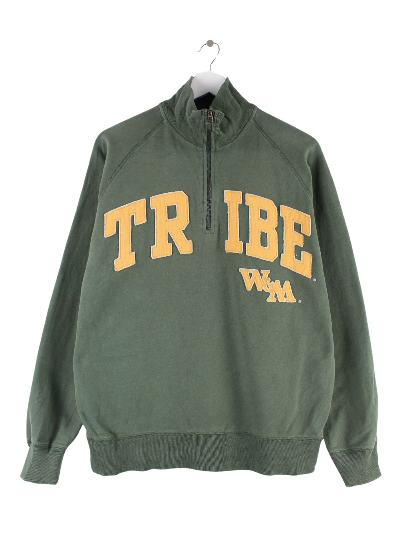 Vintage Sweater mit gesticktem Logo und half Zip in Größe M. Er ist aus einer Baumwollmischung und in Grün zu haben.