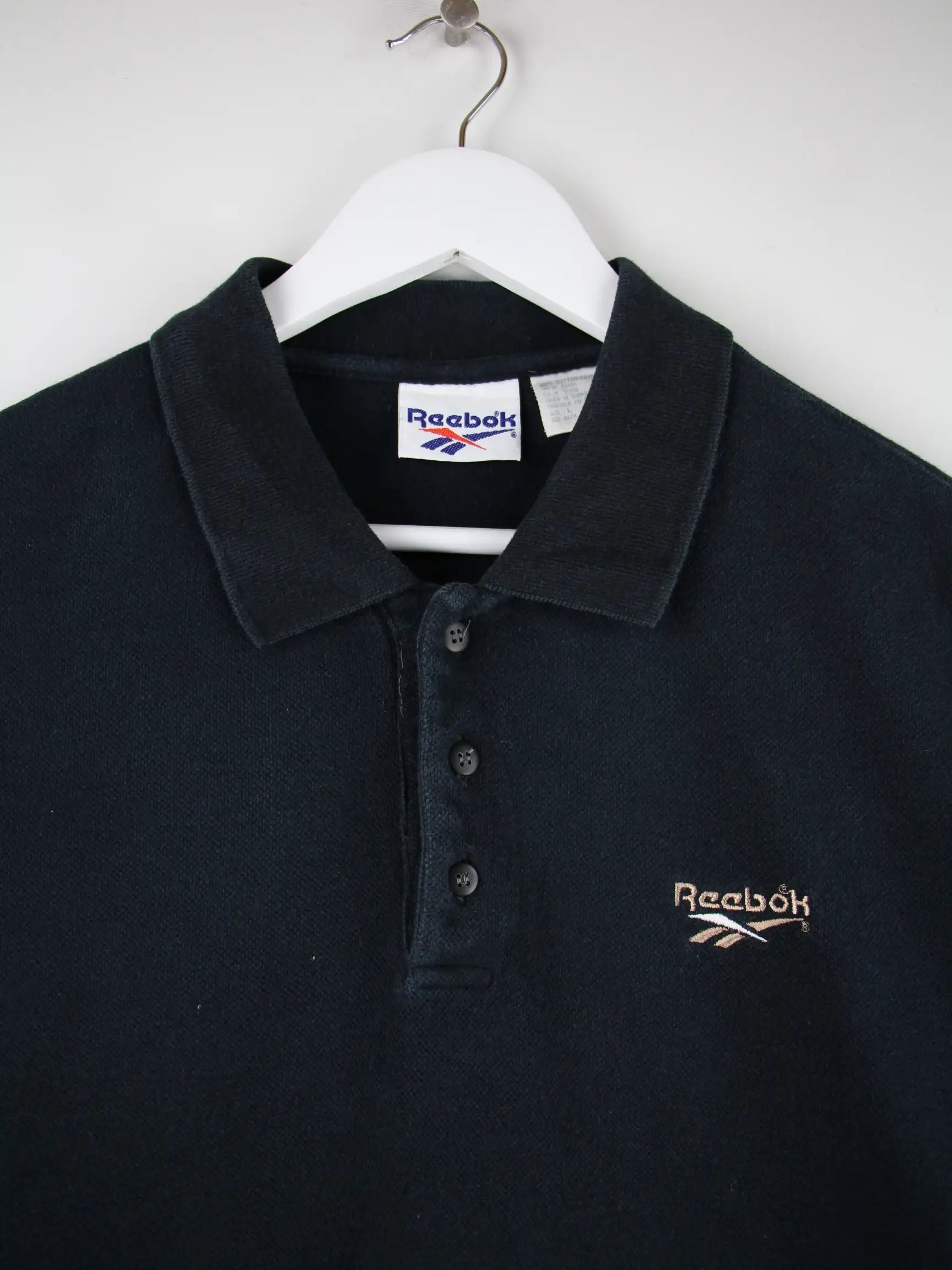 Poloshirt des Labels Reebok in Größe L aus den 90'ern. Es ist aus Baumwolle angefertigt und in Schwarz im Bestand.