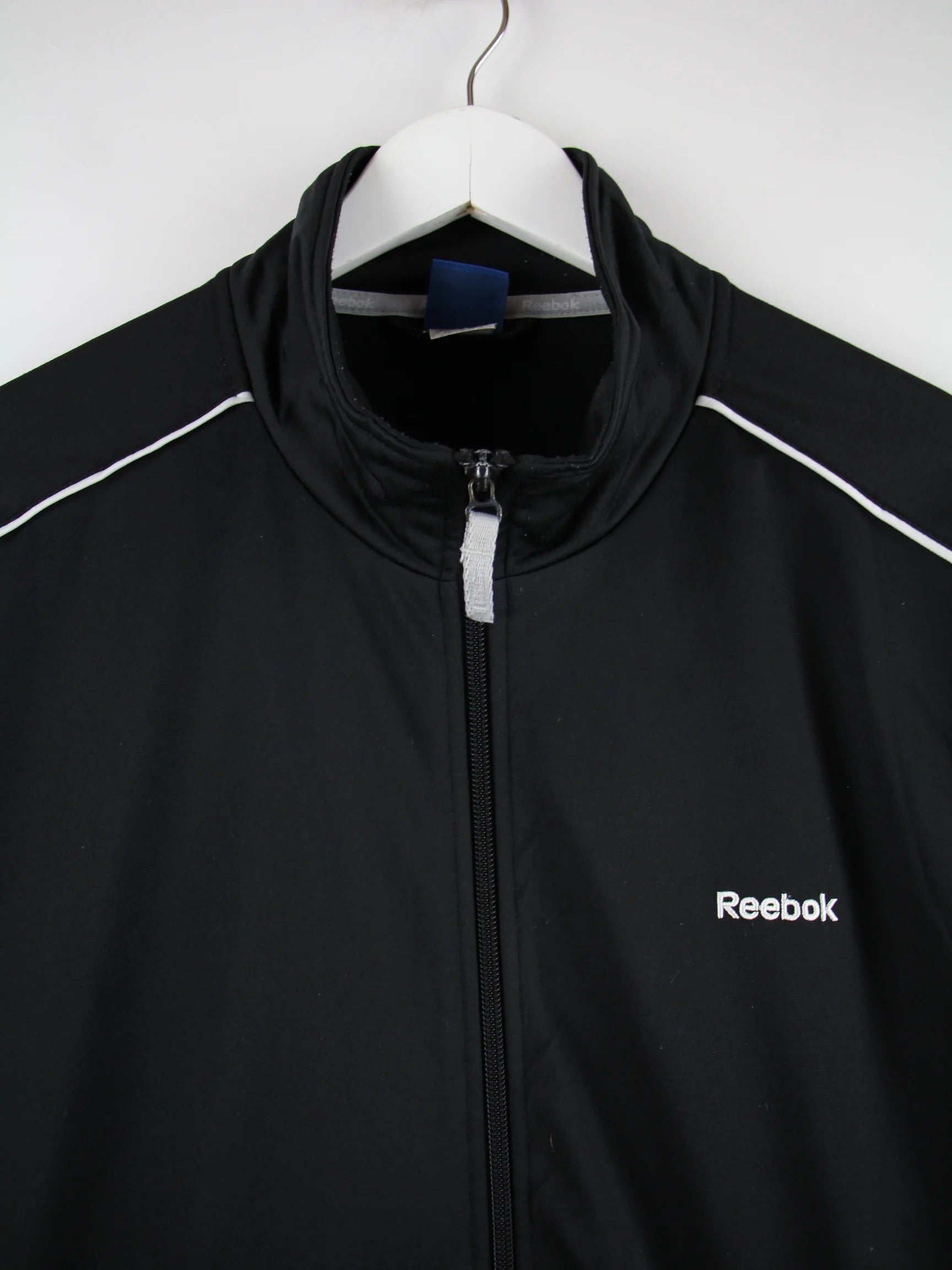 Trainingsjacke von Reebok in Größe L. Sie ist aus Synthetik produziert und in Schwarz in Stock.