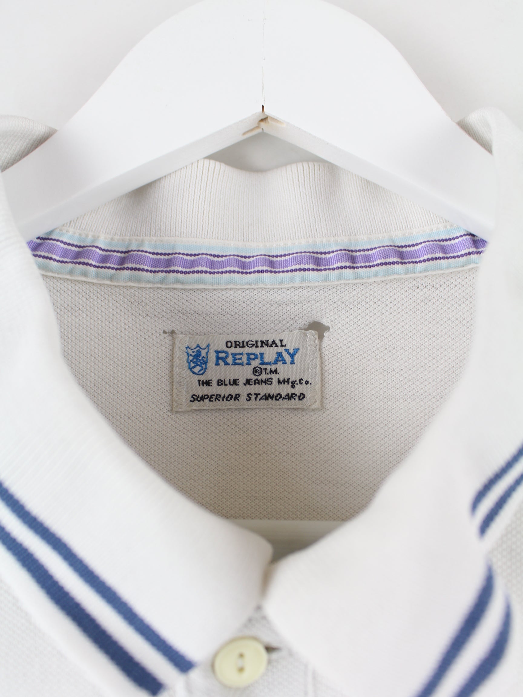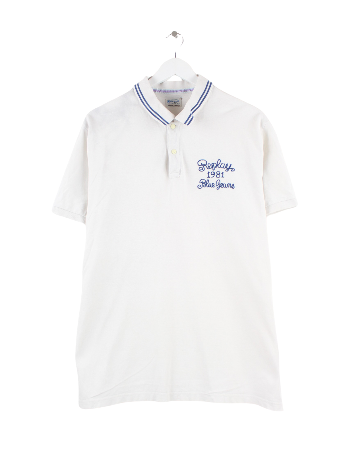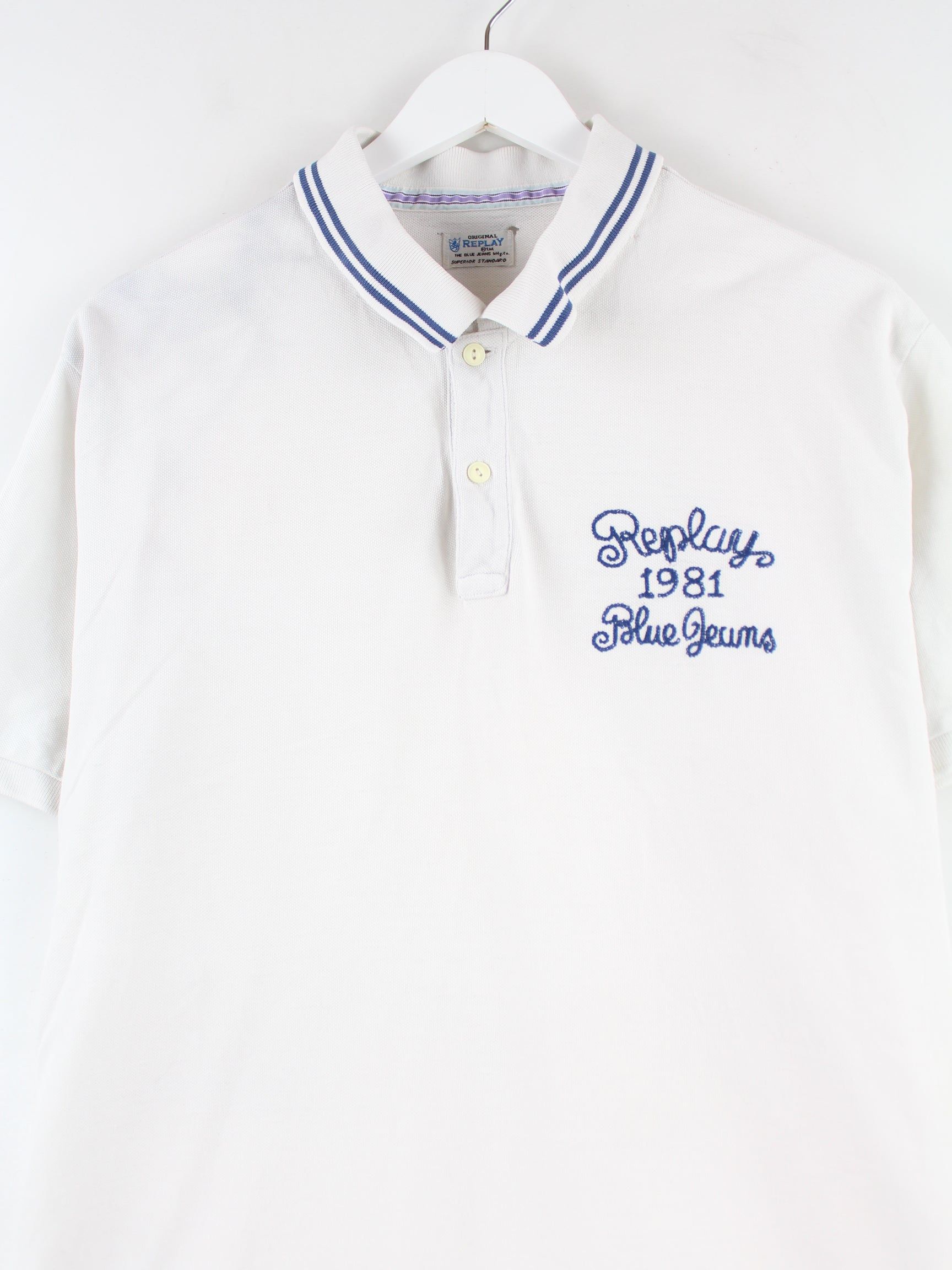 Weißes Poloshirt mit Stick aus dem Hause Replay aus den 90'ern in Größe XL. Es ist aus Baumwolle produziert. Den Zustand würden wir als 'In Ordnung' bezeichnen (vergl. Bilder).