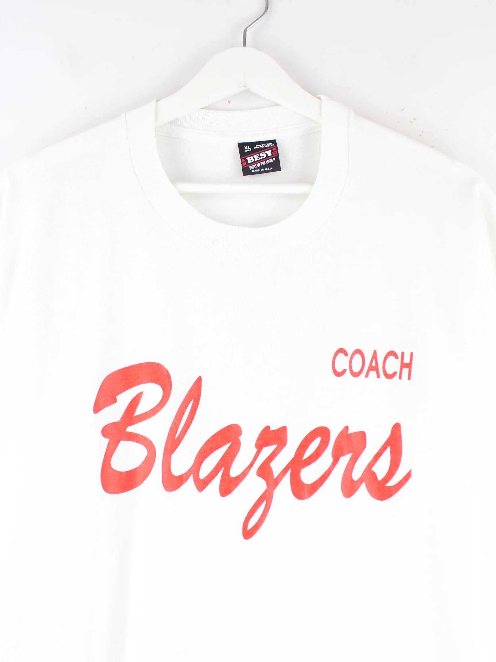 T-Shirt von Fruit of the Loom in Größe XL aus den 90'ern. Es ist aus Baumwolle produziert und in Weiß in Stock. Mit schickem Coach Print.