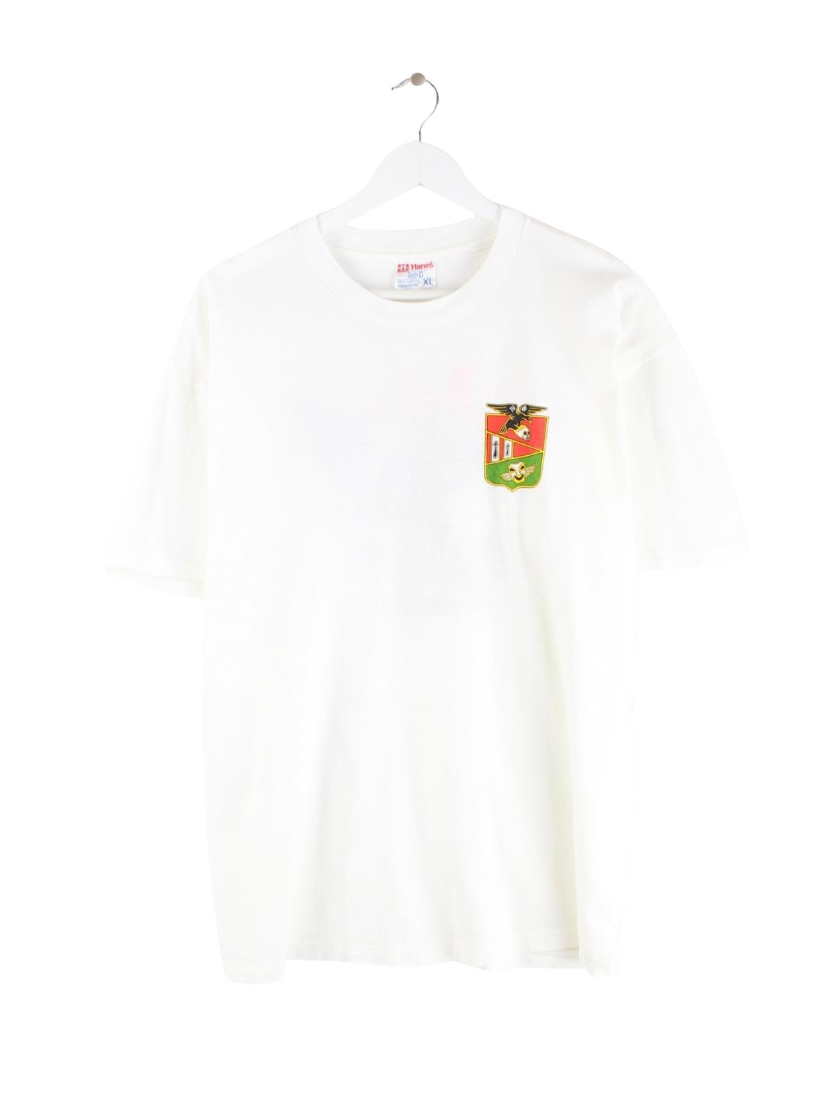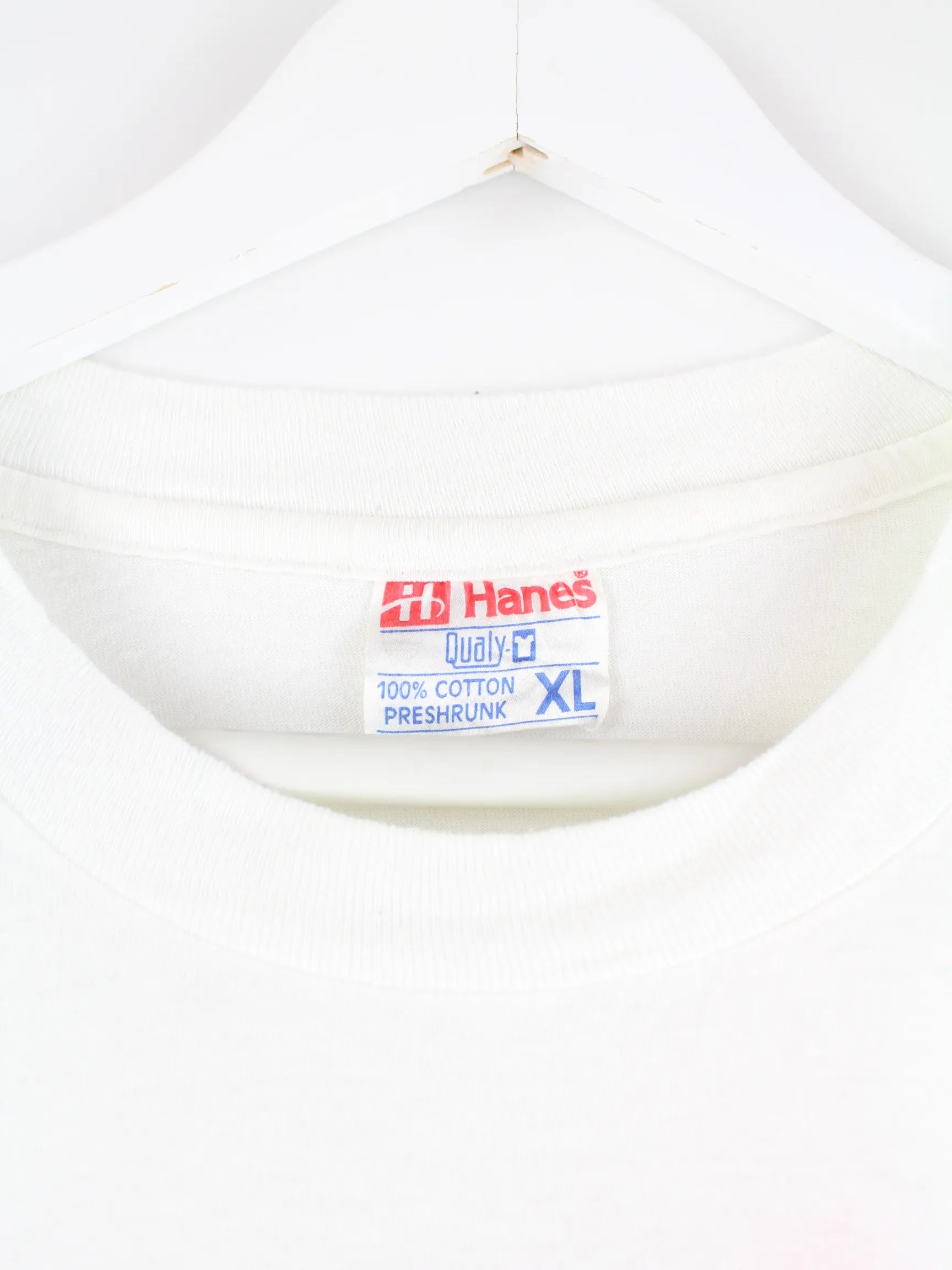 Vintage T-Shirt von Hanes in Größe XL aus den 90ern mit großem Backprint. Es ist aus Baumwolle gemacht und in Weiß im Angebot.