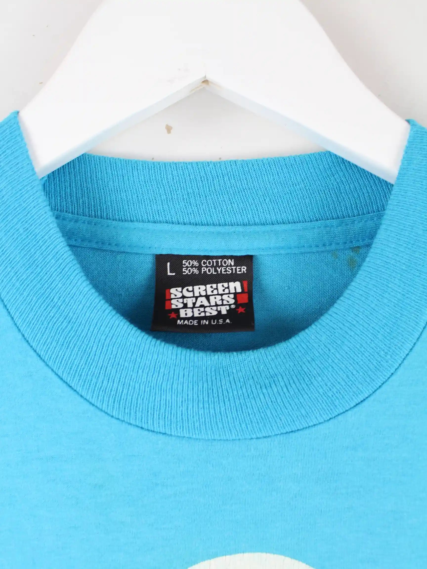 Blaues T-Shirt aus dem Hause Screen Stars aus den 90'ern in Größe L. Es ist aus Baumwolle hergestellt. Den Zustand würden wir als 'In Ordnung' bezeichnen (vergl. Bilder).Mit seltenem Life Print.