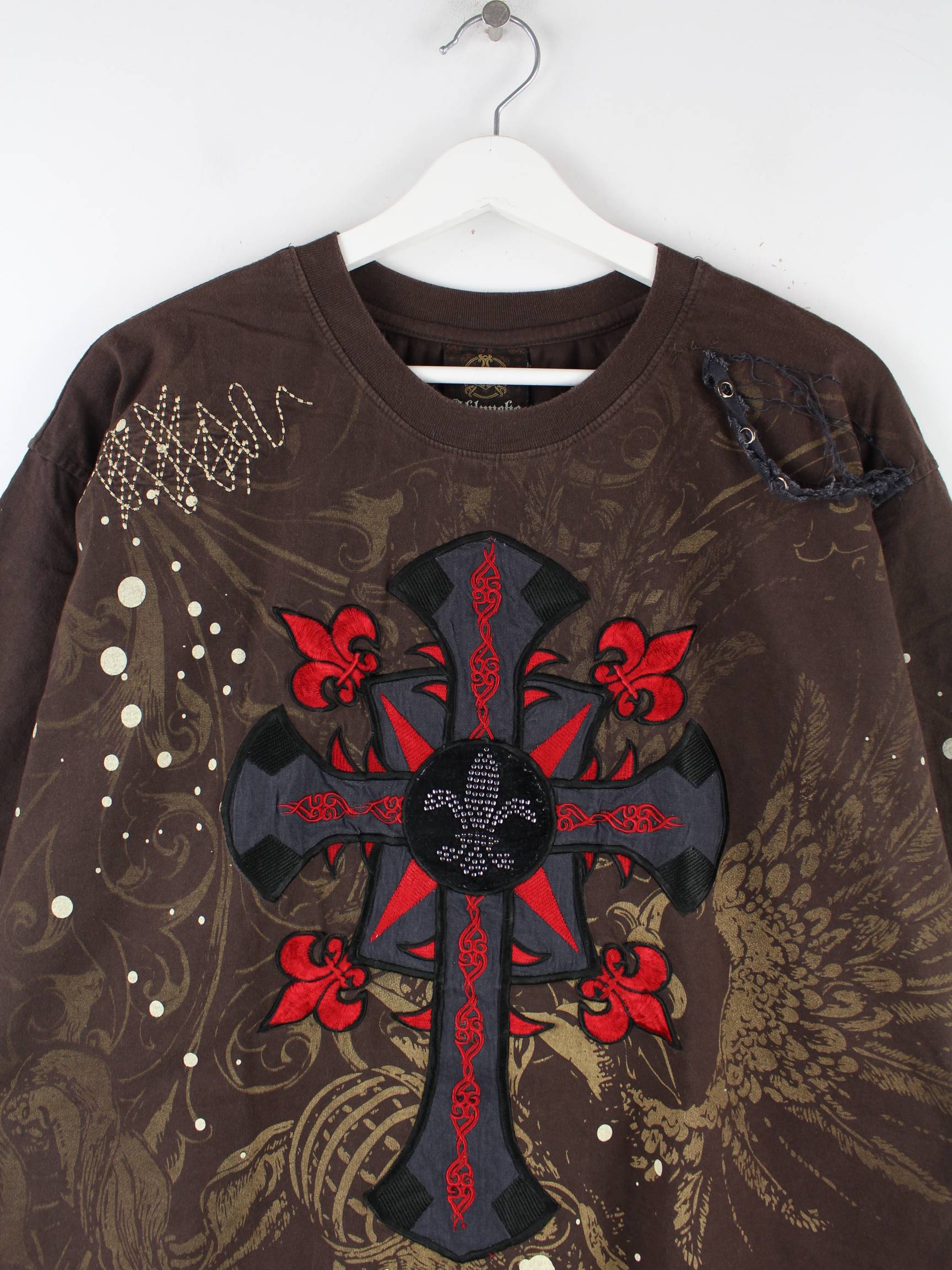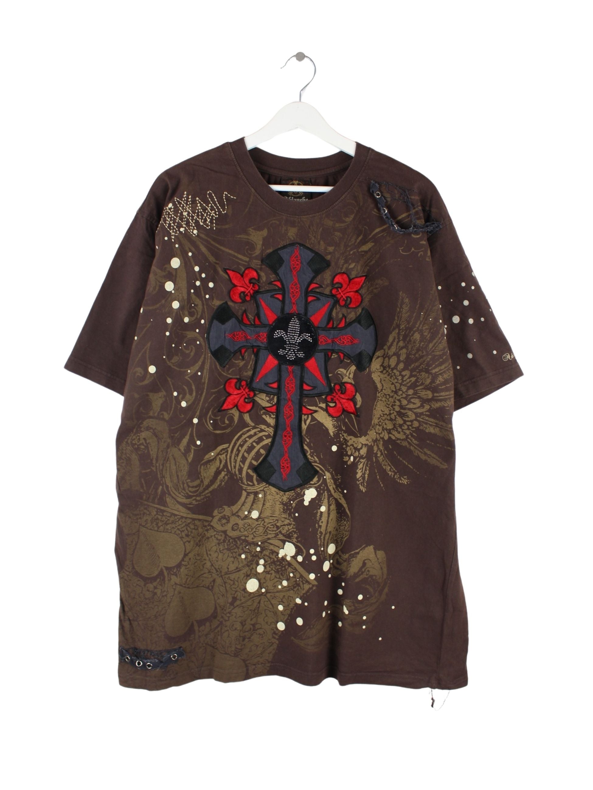 Vintage T-Shirt mit gestickten Motiven in Größe 3XL aus Anfang der 2000'er. Es ist aus Baumwolle hergestellt und in Braun zu bekommen.