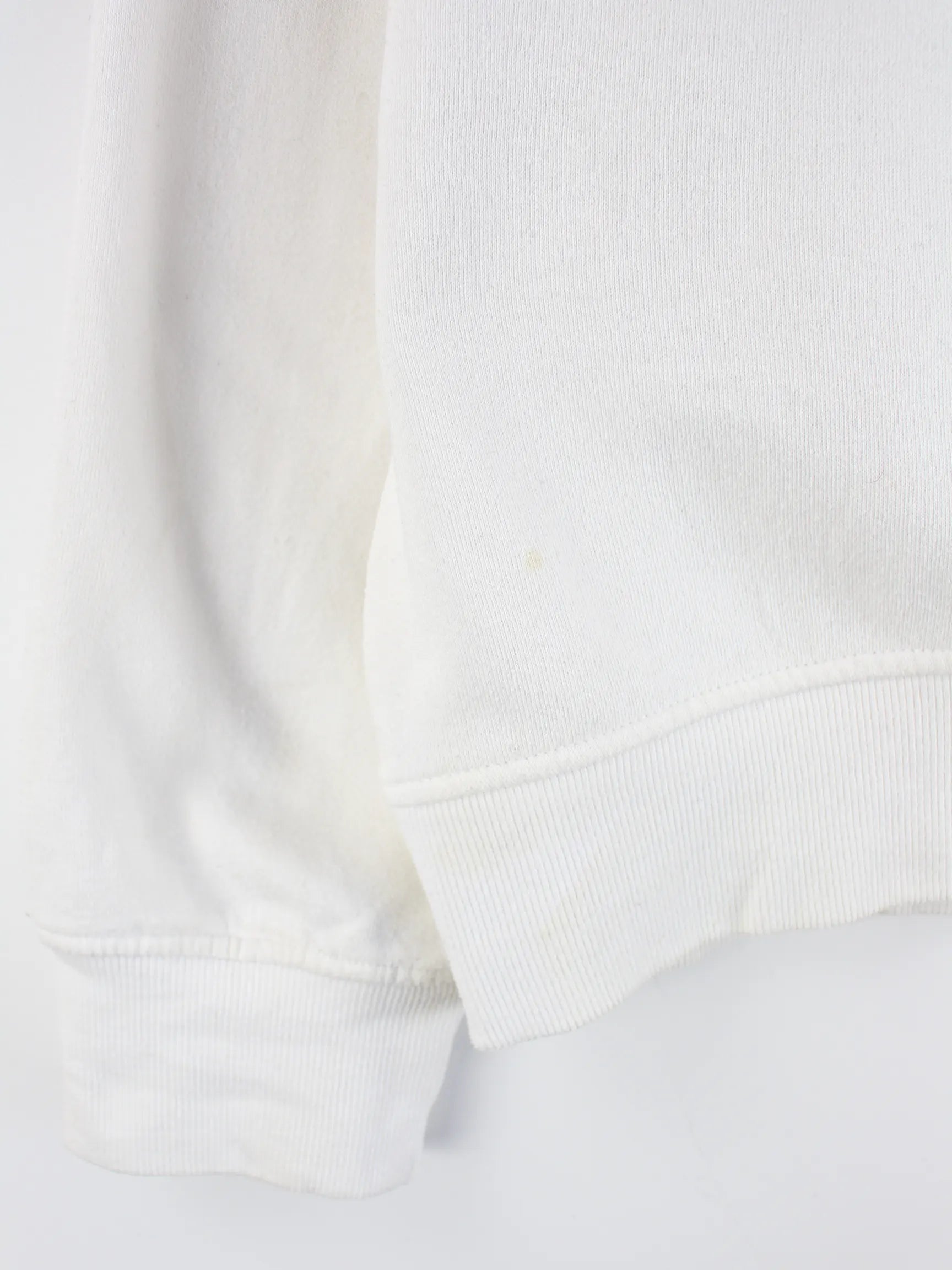 Weißer Sweater mit kurzem Reißverschluß vom Label Tommy Hilfiger in Größe L. Er ist aus einer Baumwollmischung angefertigt. Den Zustand würden wir als 'In Ordnung' bezeichnen (vergl. Bilder).