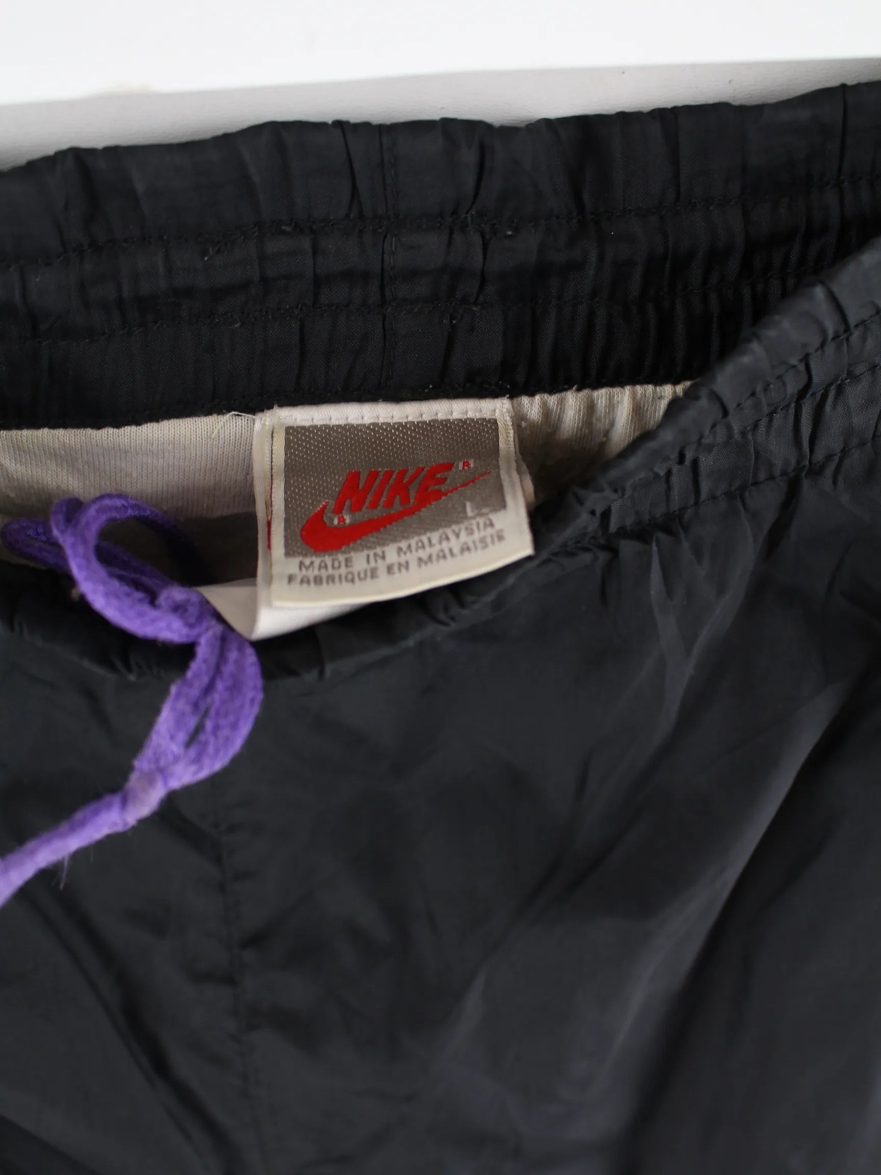 Schwarze Track Pants vom Brand Nike aus den 80'ern in Größe L. Sie sind aus Synthetik produziert und in gutem Zustand zu haben.