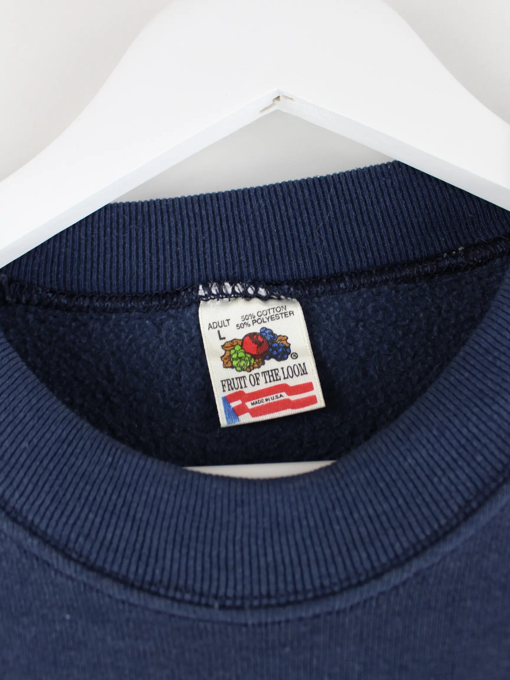 Sweater des Labels Fruit of the Loom in Größe L aus den 90'ern. Er ist aus einer Baumwollmischung gefertigt und in Blau in Stock. Mit tollem Tigerhawks Print.