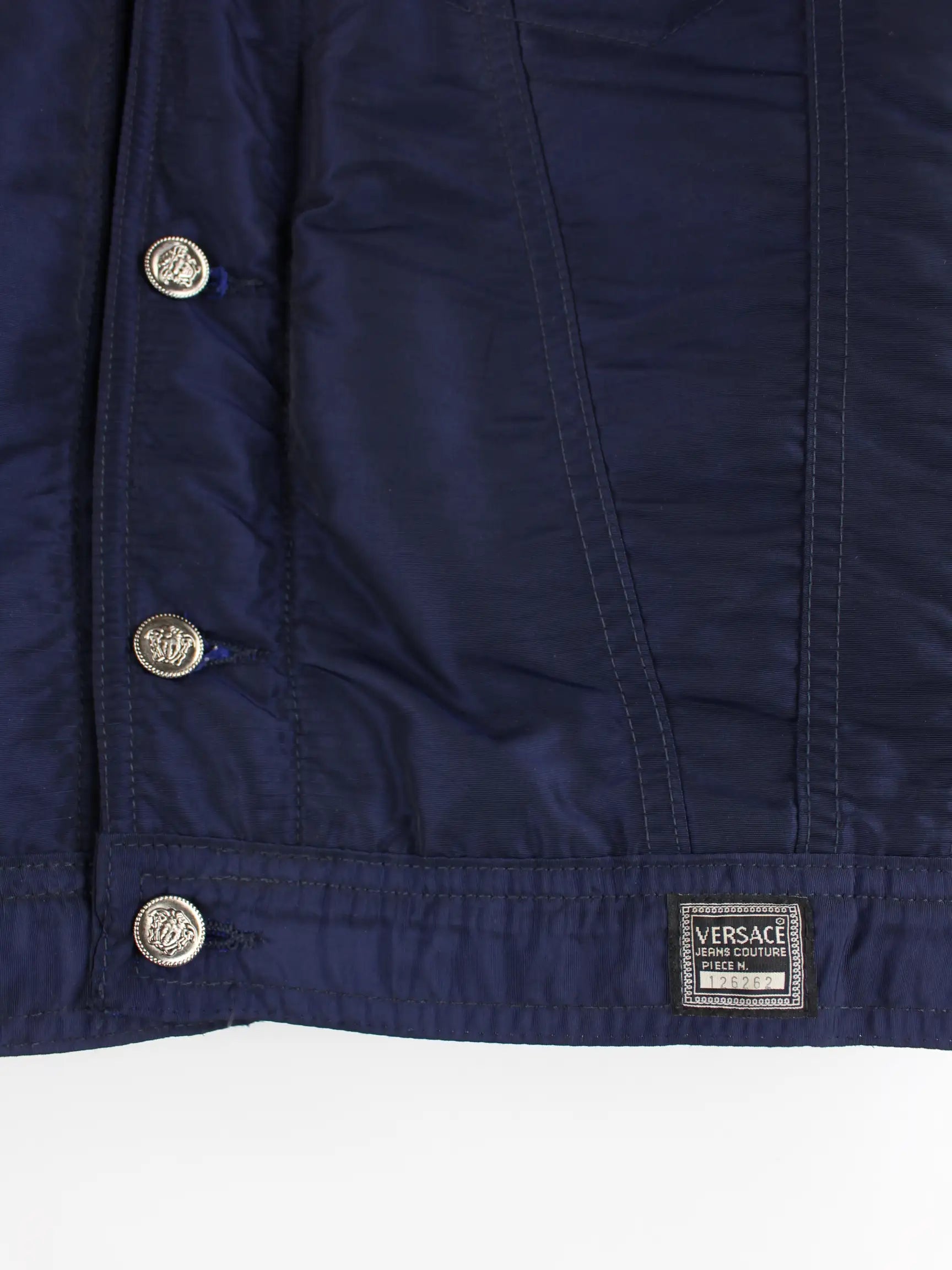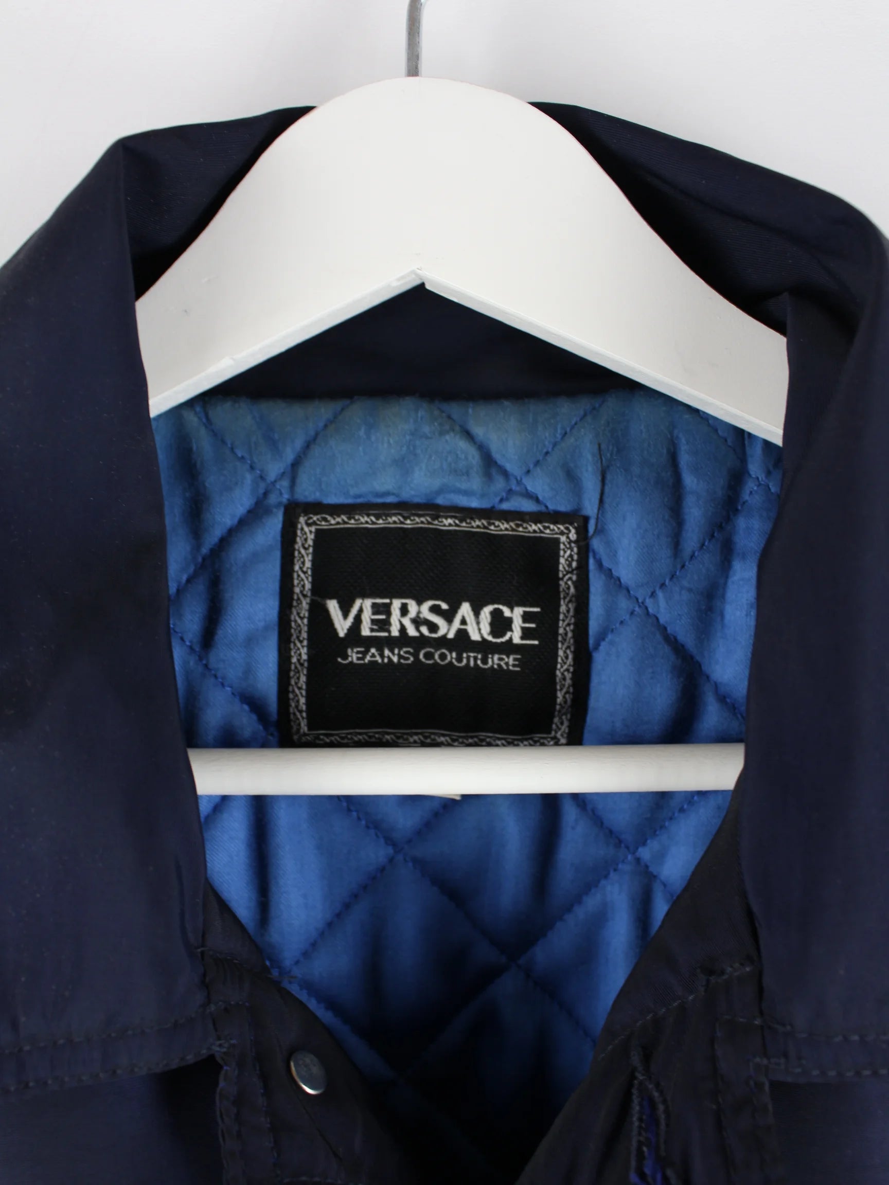 Leichte Jacke der Brand Versace in Größe M aus den 90'ern. Sie ist aus Synthetik gefertigt und in Blau in Stock.