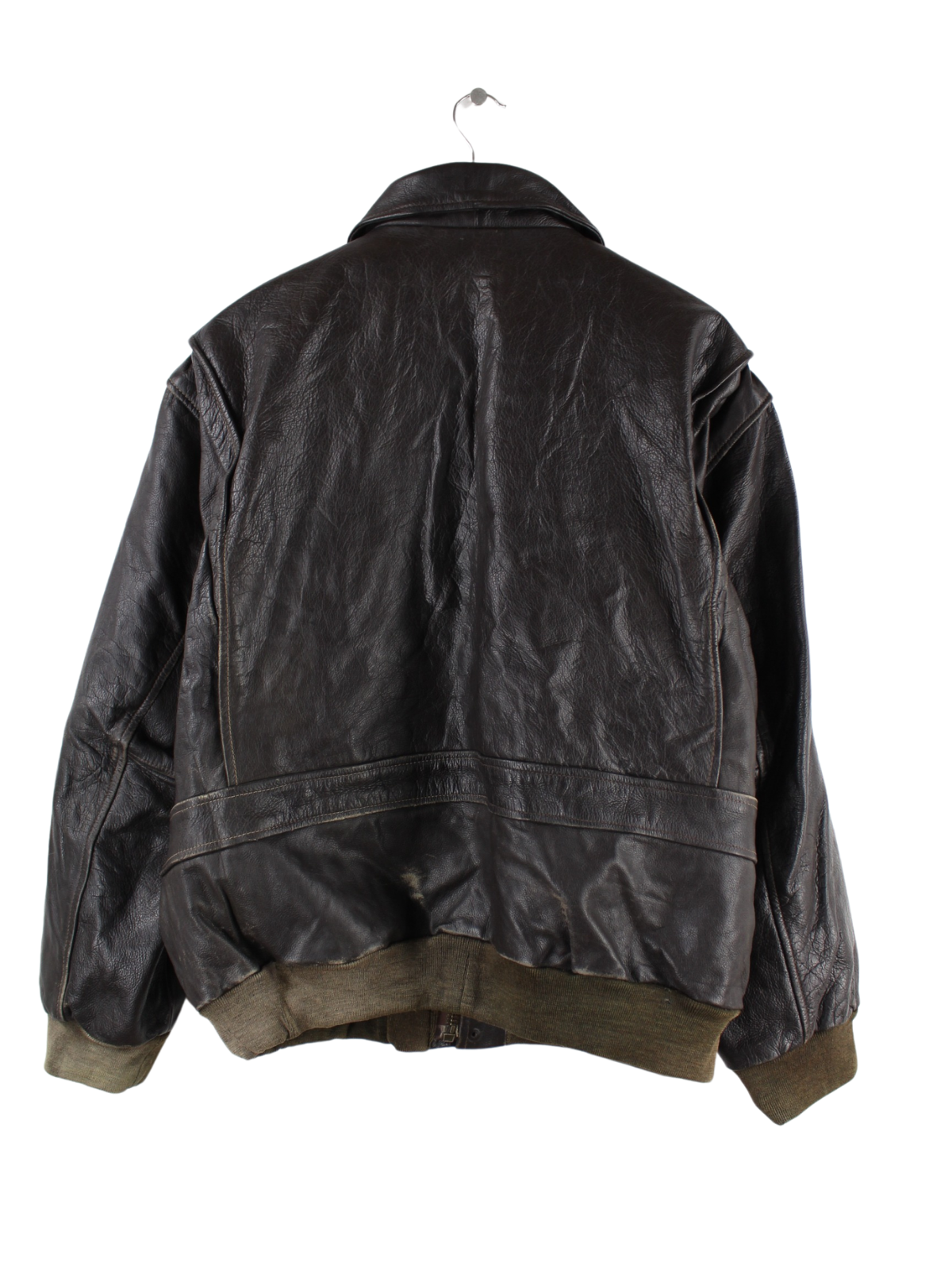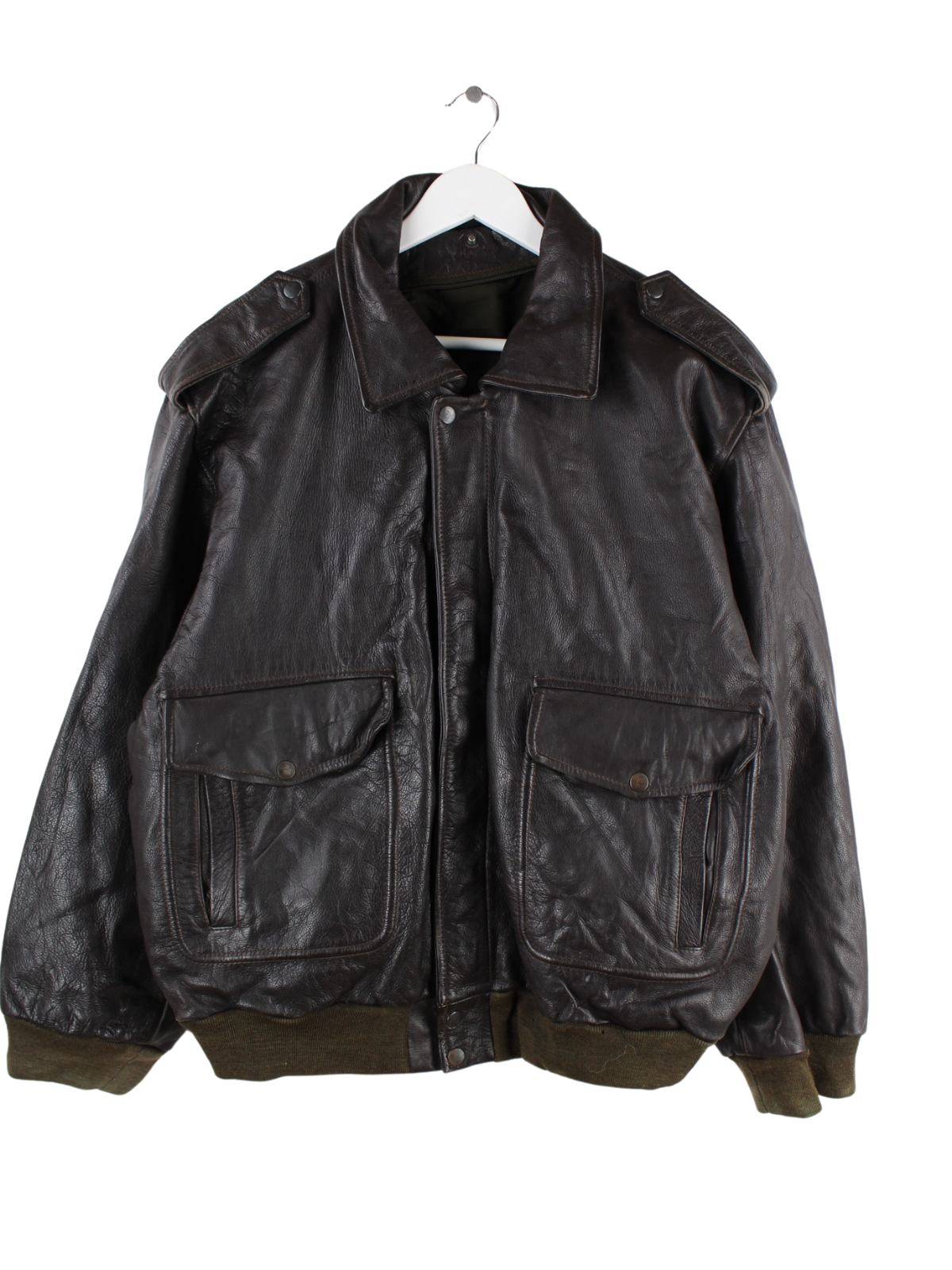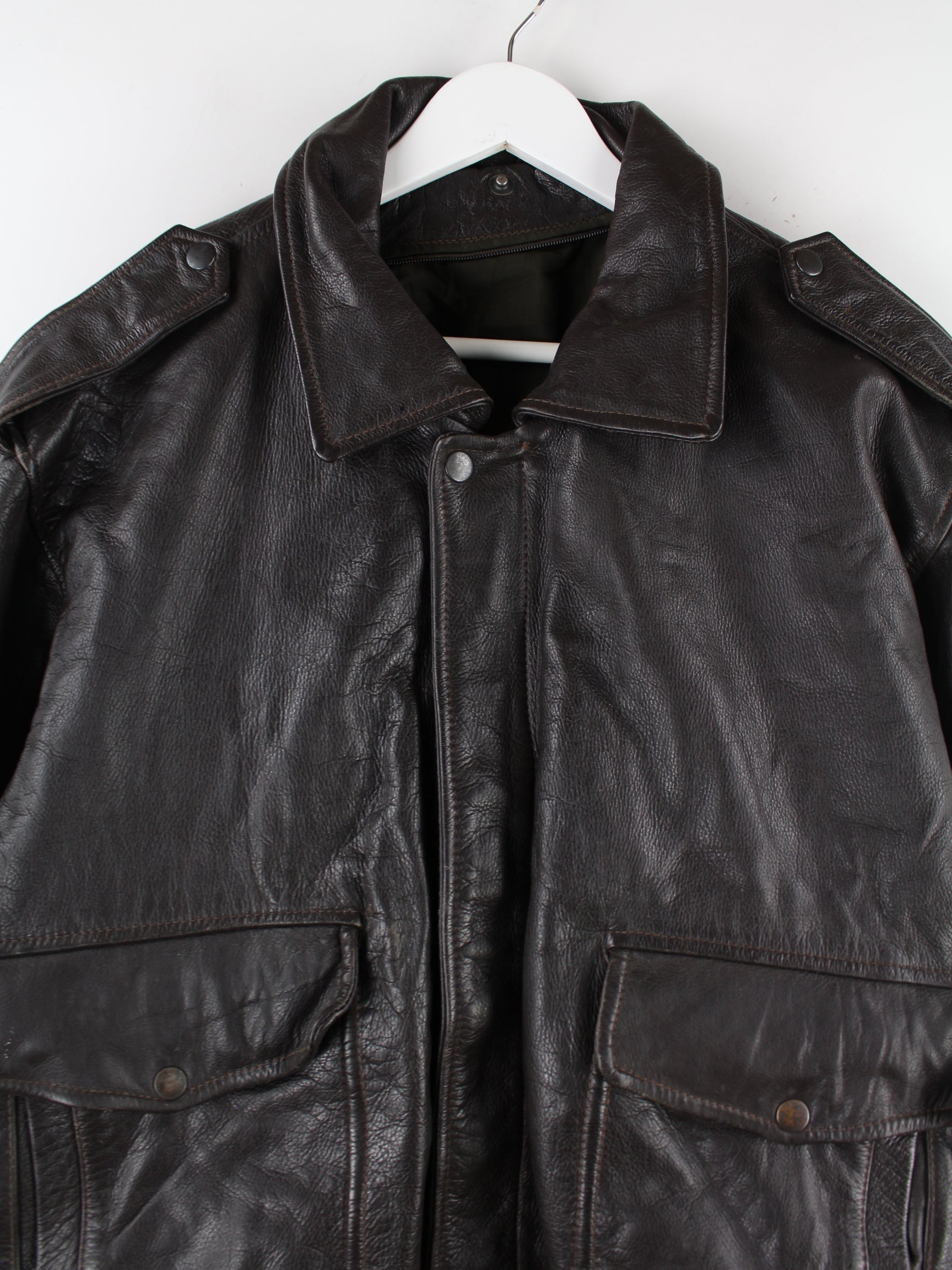 Vintage Jacke in Größe XL aus den 90'ern. Sie ist aus Leder gefertigt und in Braun bei uns zu bekommen.