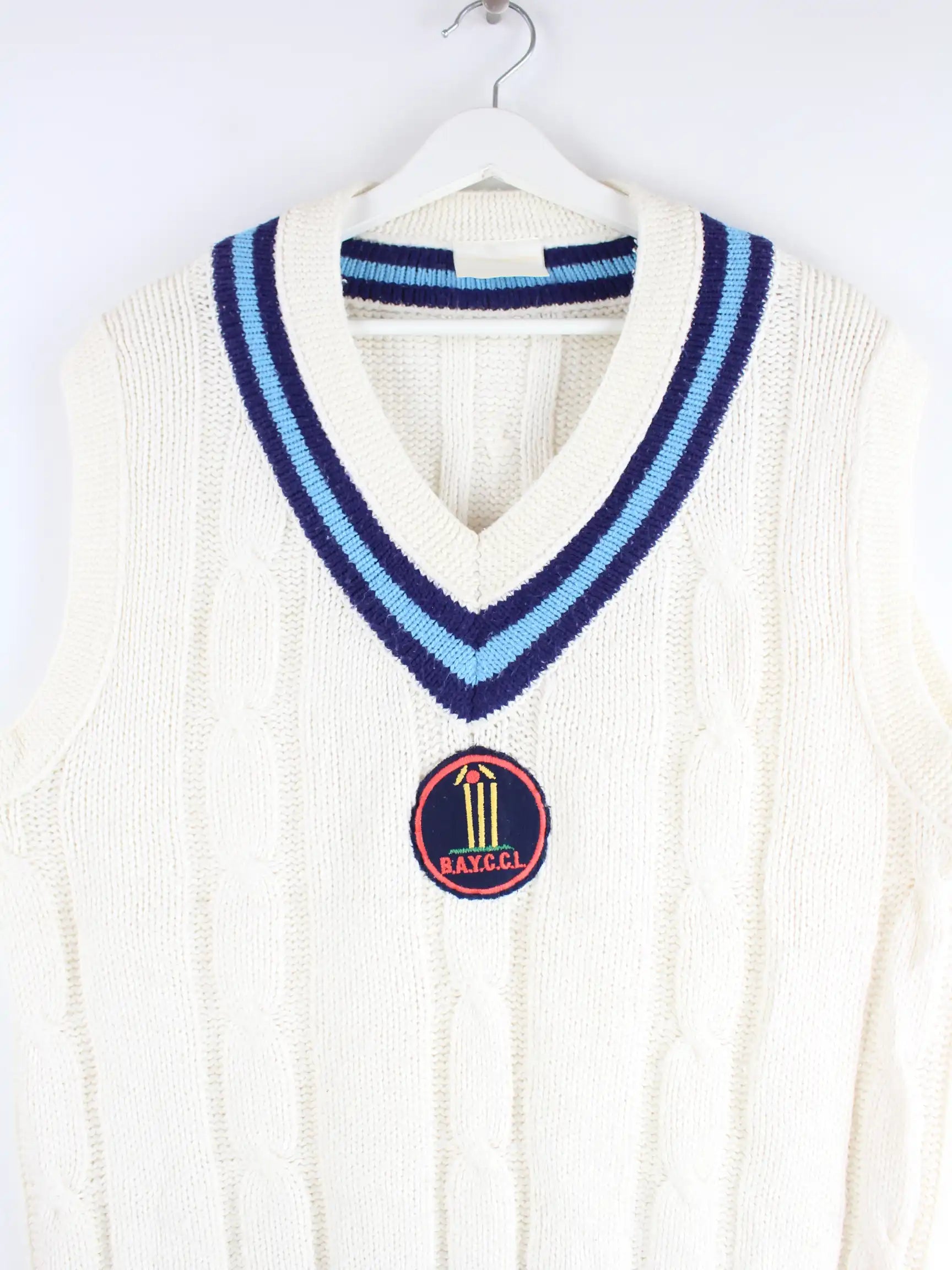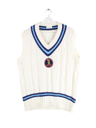Weißer Vintage Pullunder in Größe L. Er ist aus Baumwolle produziert. Den Zustand würden wir als 'In Ordnung' bezeichnen (vergl. Bilder).