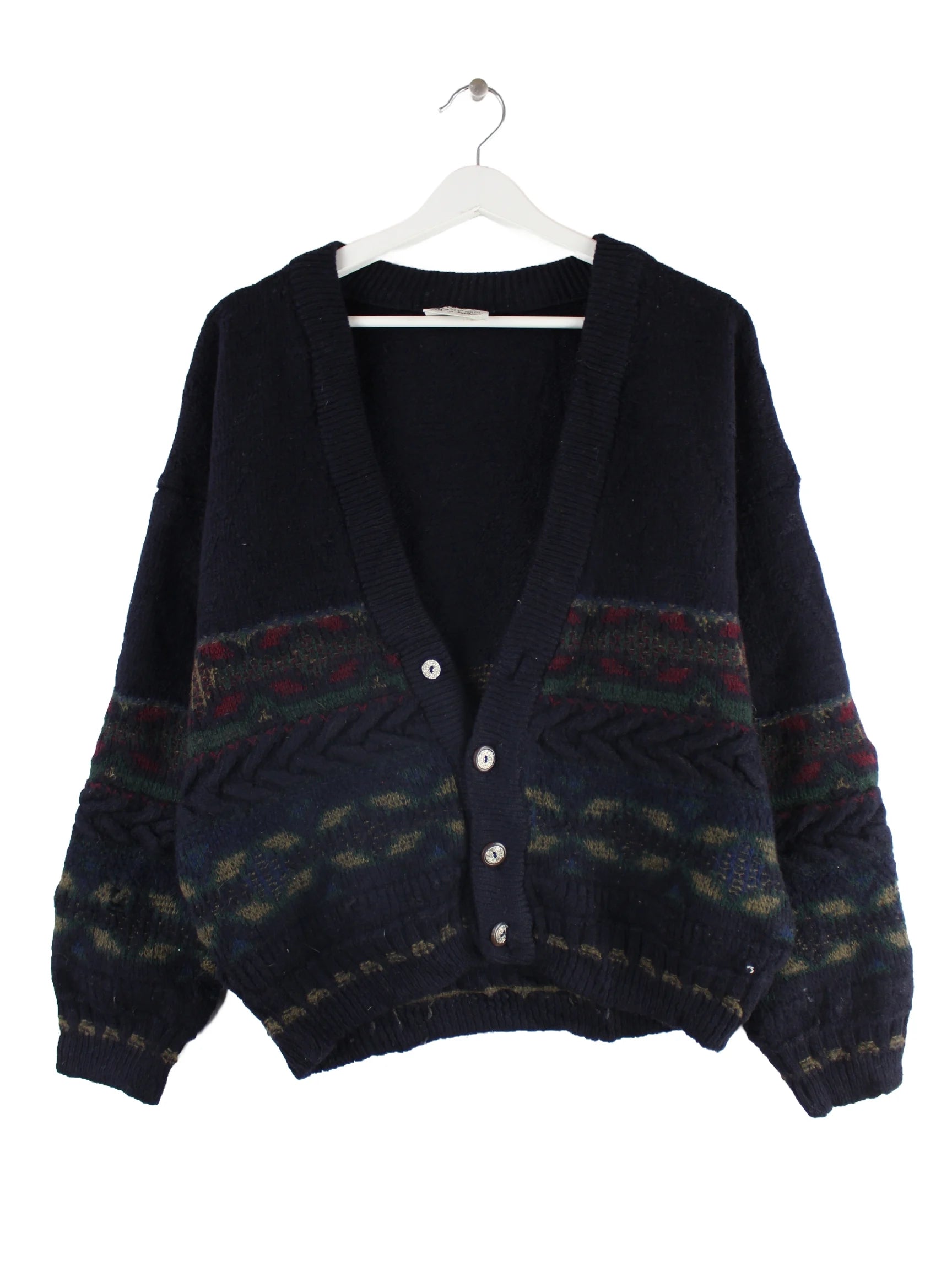 Blaue Vintage Strickjacke aus den 90'ern in Größe M. Sie ist aus Baumwolle produziert. Den Zustand würden wir als 'In Ordnung' bezeichnen (vergl. Bilder).