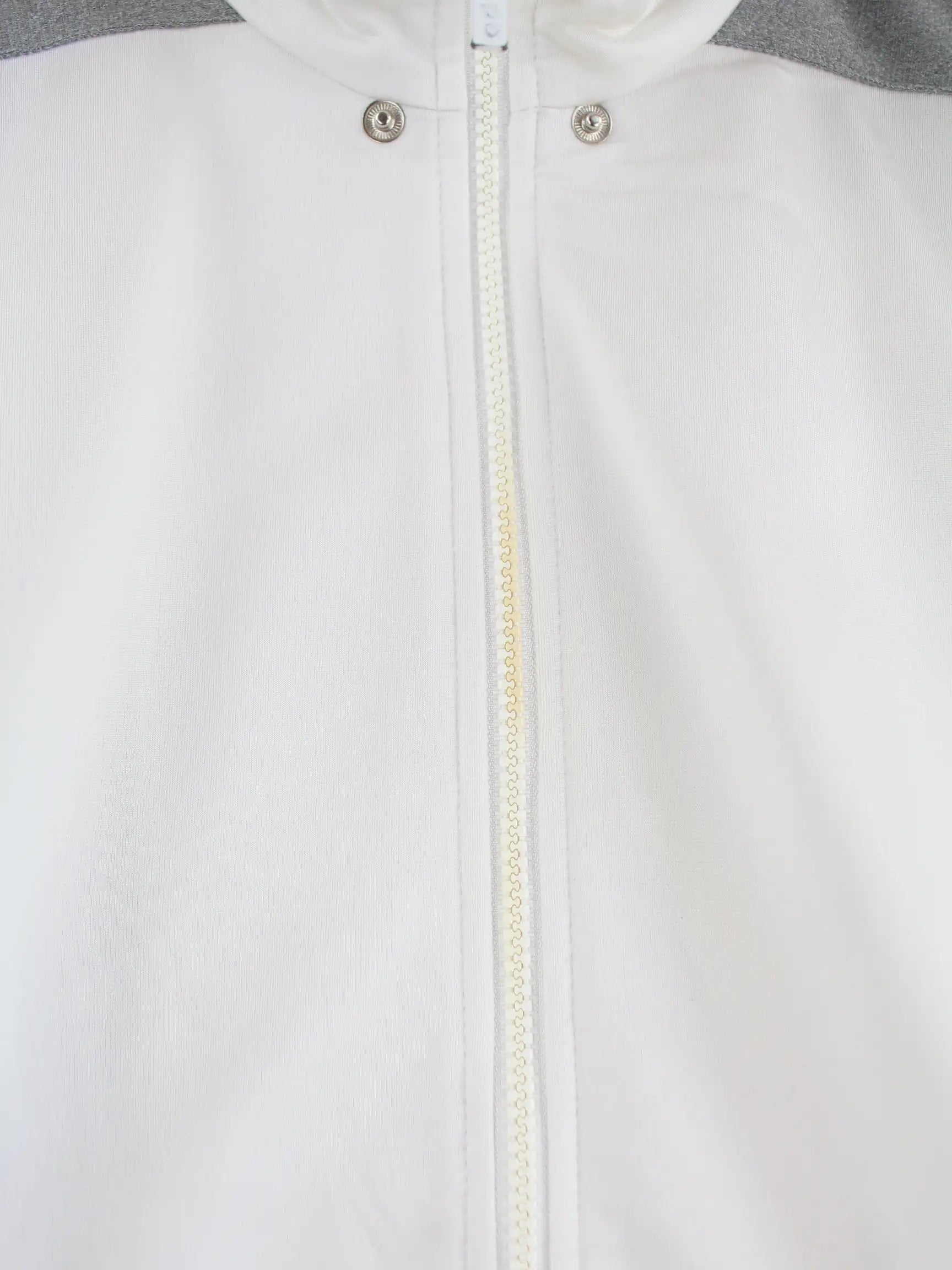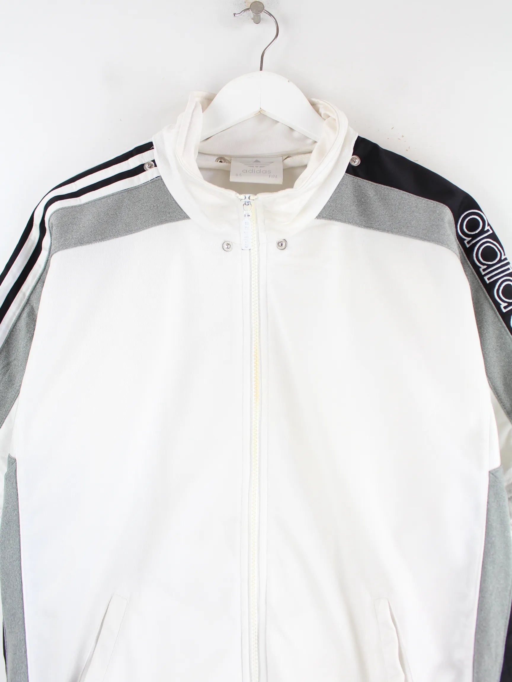 Trainingsjacke aus dem Hause Adidas mit gesticktem Logo in Größe M aus den 80'ern. Sie ist aus Synthetik produziert und in Weiß lieferbar.