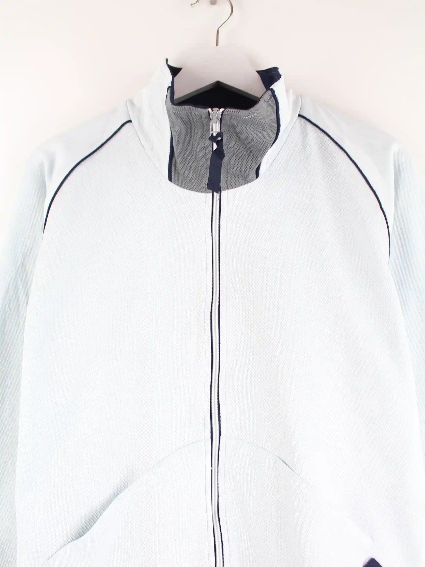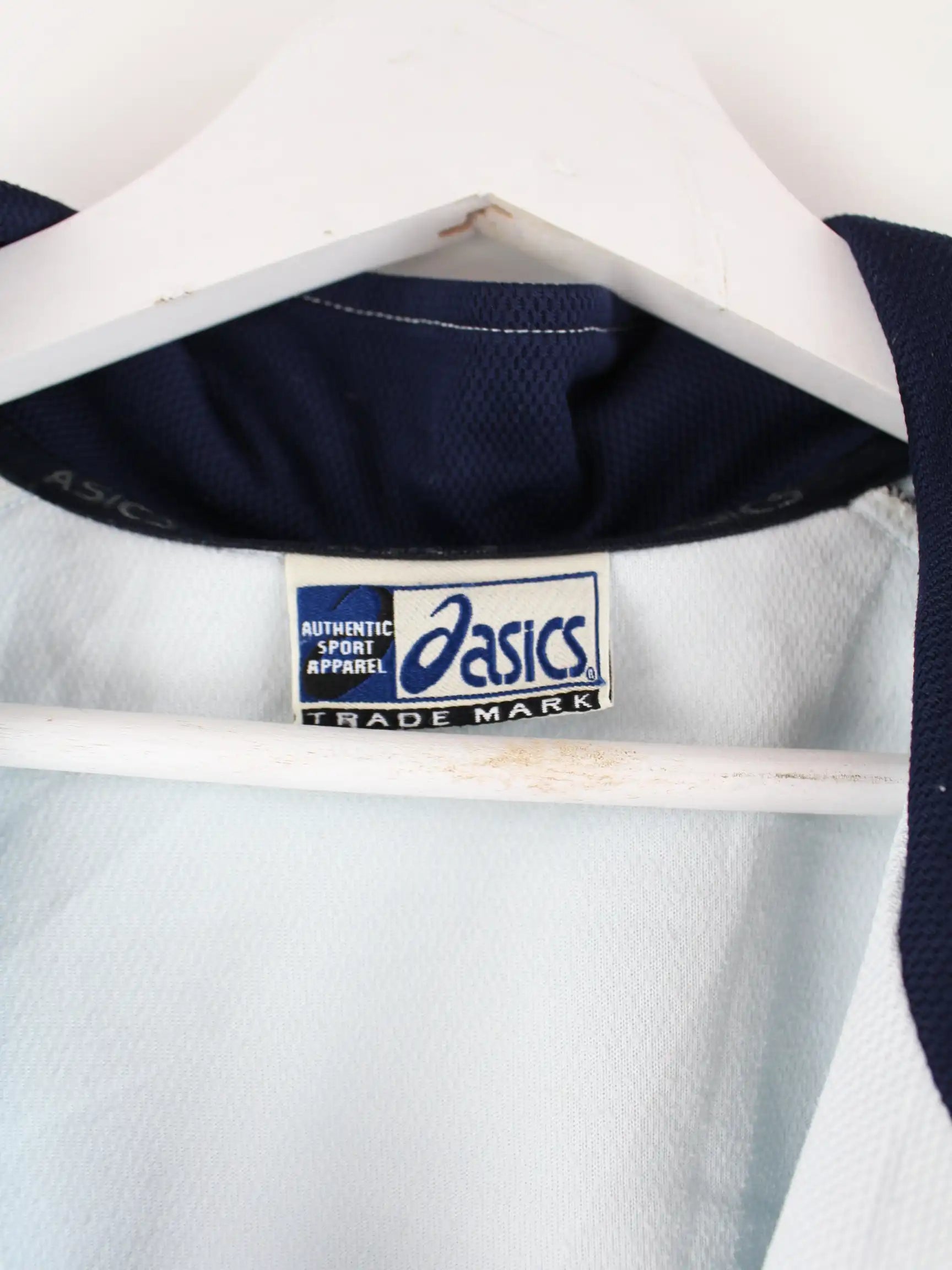 Blaue Trainingsjacke von Asics in Größe M aus den 2000er Jahren. Sie ist aus Synthetik und in sehr gutem Zustand zu bekommen.