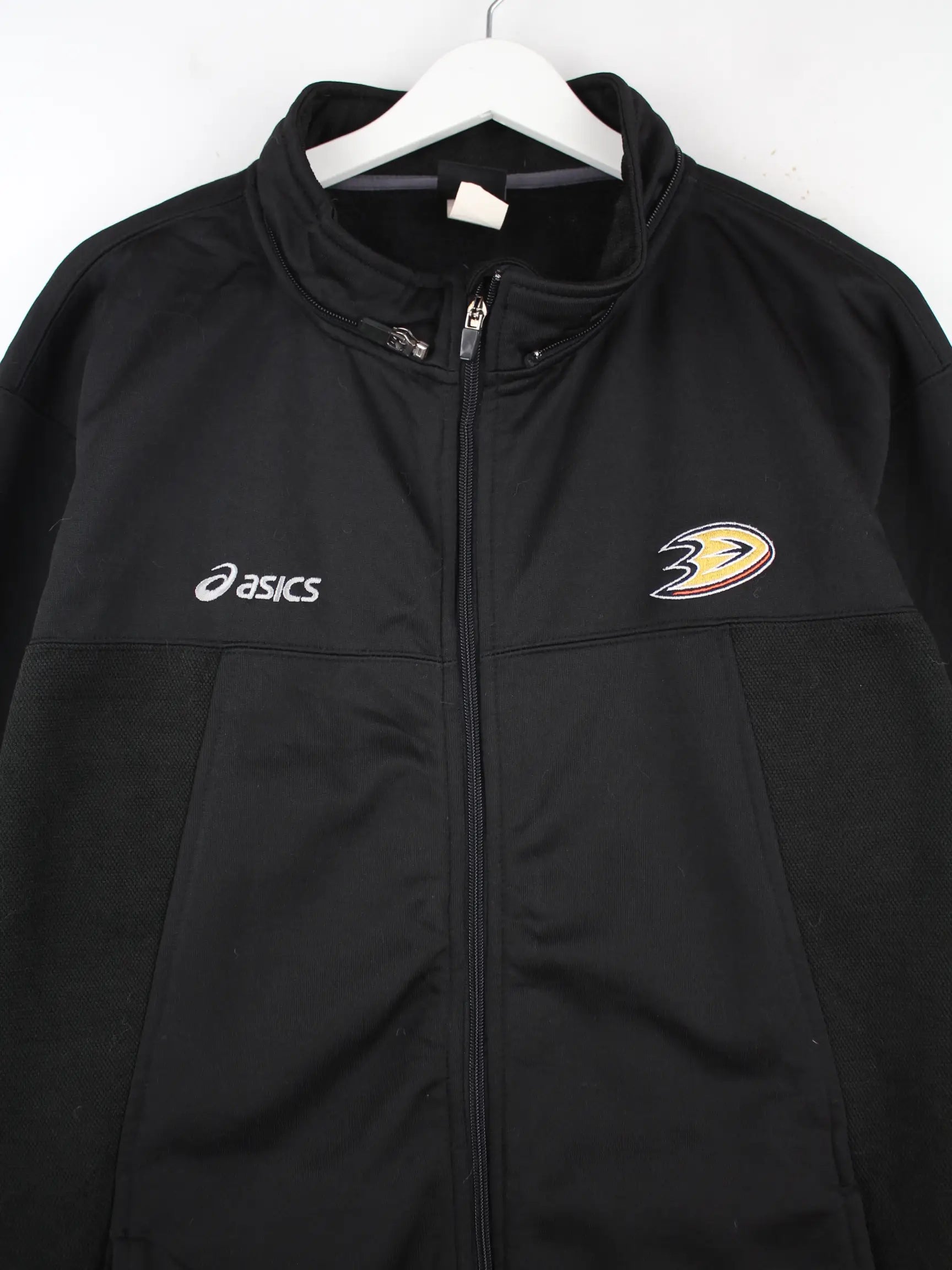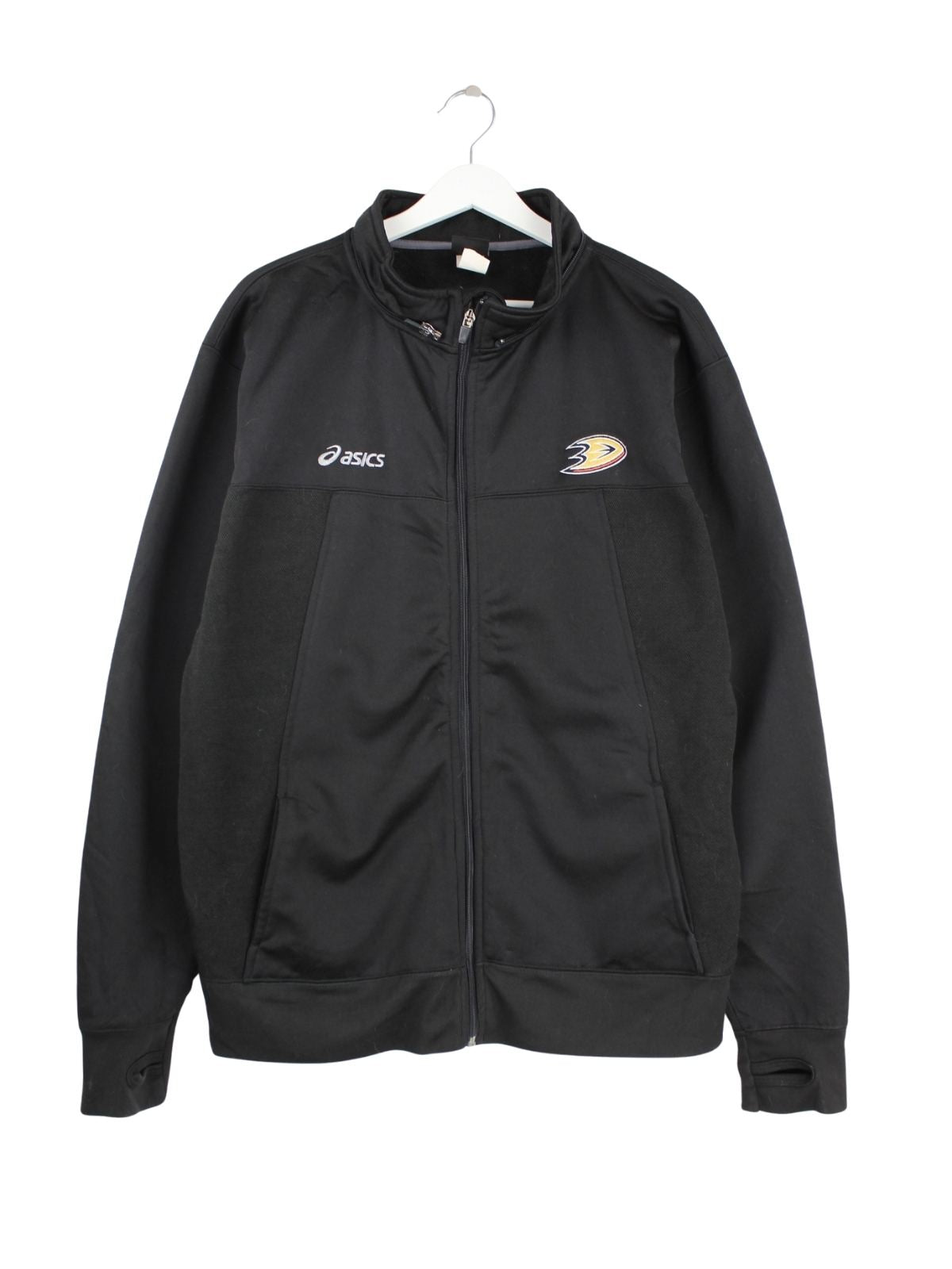 Trainingsjacke der Marke Asics in Größe L. Sie ist aus Synthetik hergestellt und in Schwarz bei uns zu bekommen.